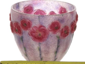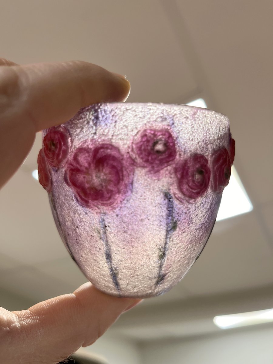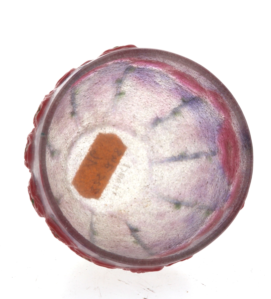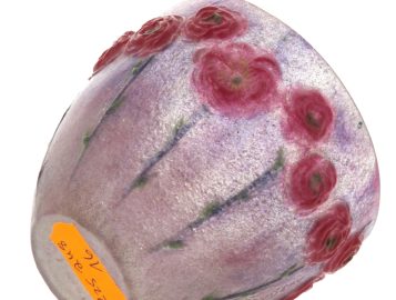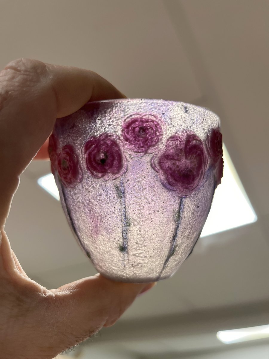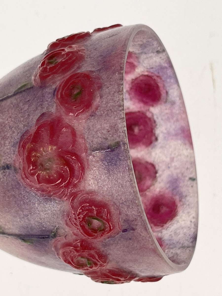 Gabriel ARGY-ROUSSEAU (1885-1953) – Petit vase en pâte de verre à décor polychrome de petites roses sur tige dans les tons rose sur fond lilas. Signé en creux sur le vase, gravé France sous la base. H 7 cm