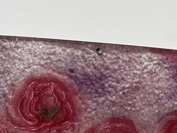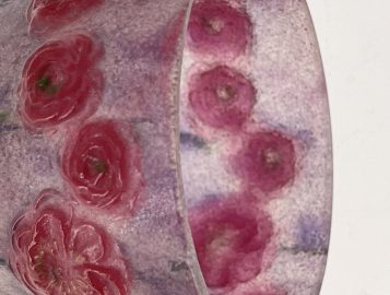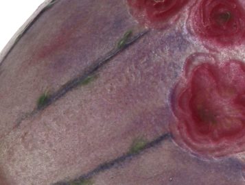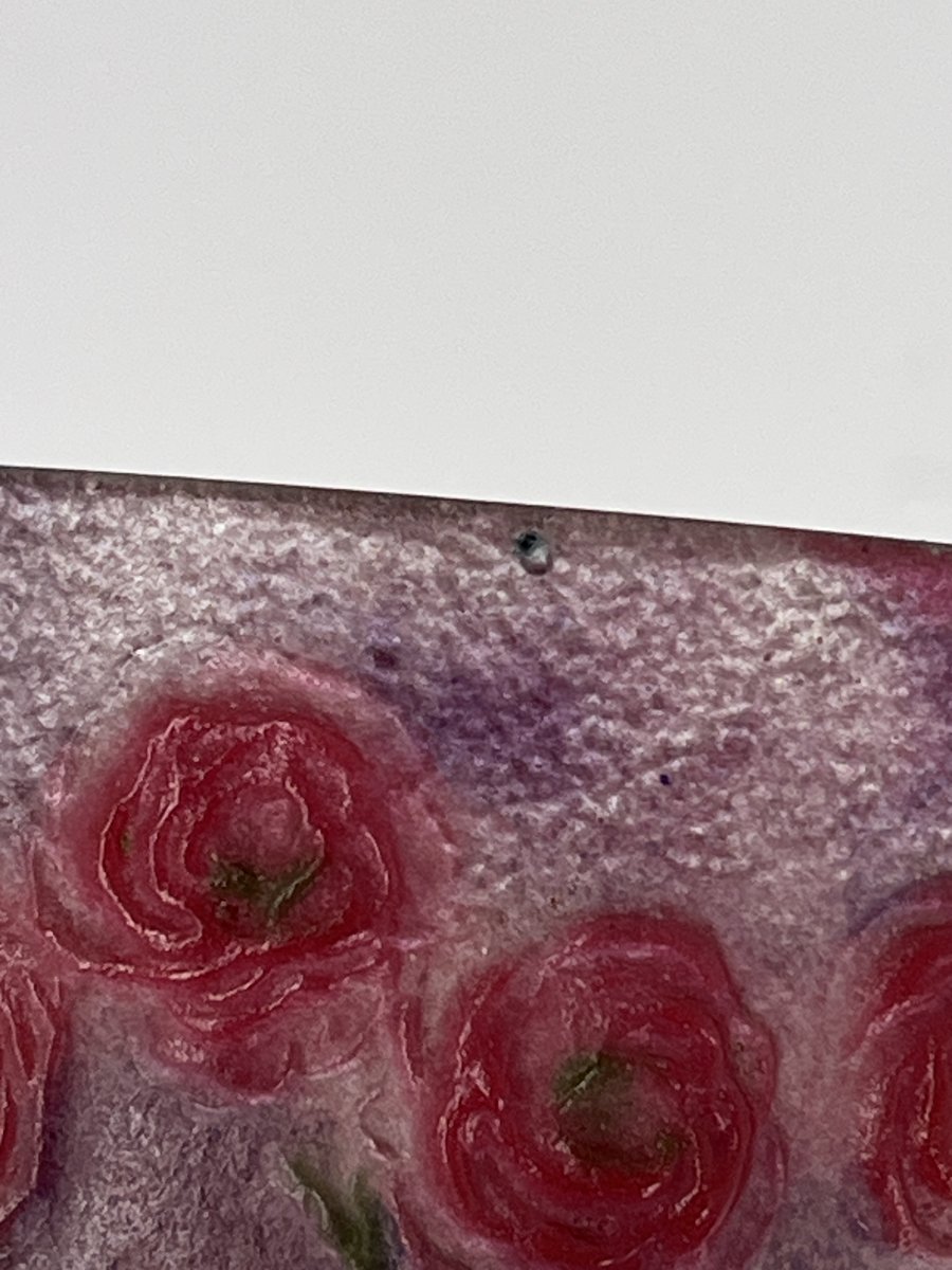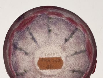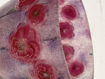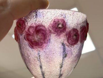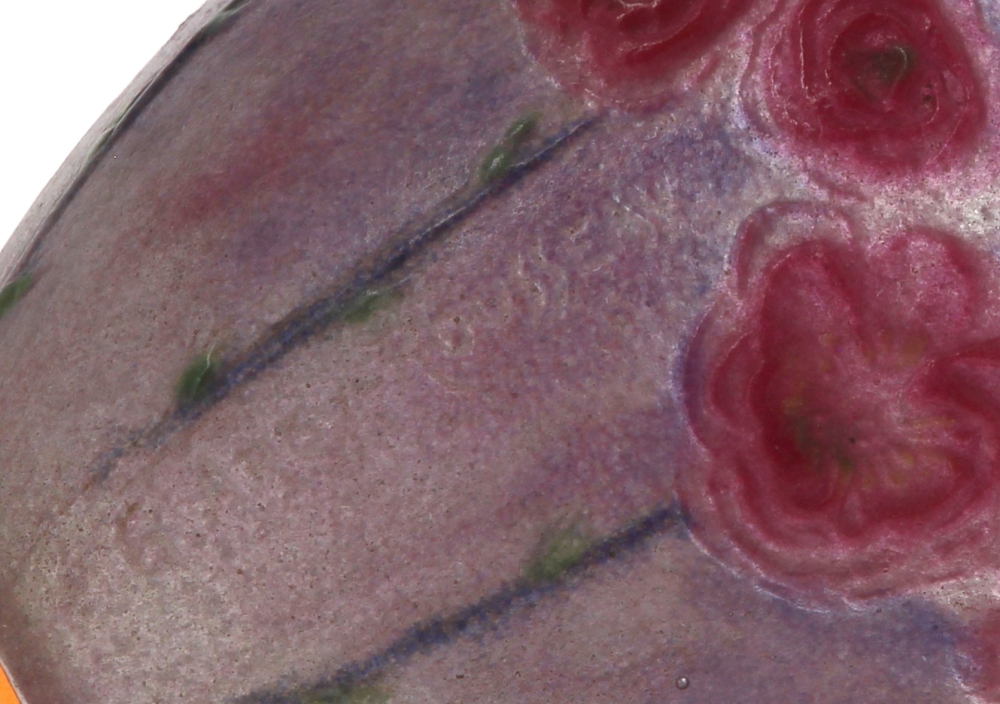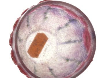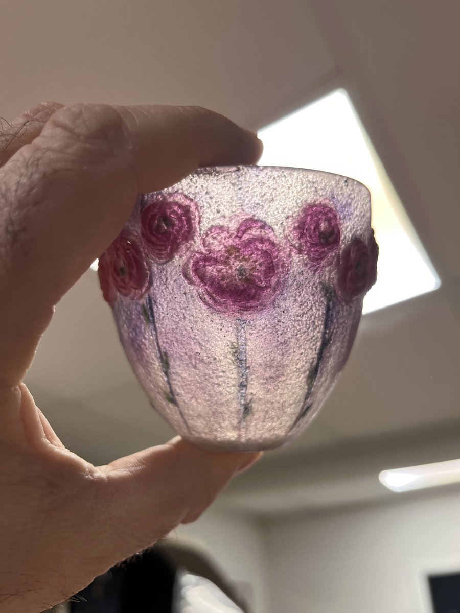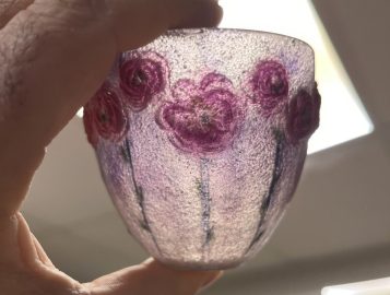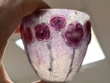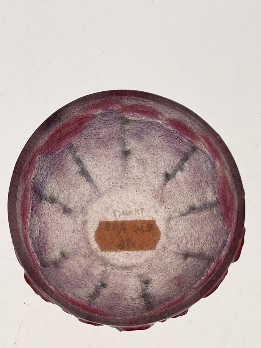 Gabriel ARGY-ROUSSEAU (1885-1953) – Petit vase en pâte de verre à décor polychrome de petites roses sur tige dans les tons rose sur fond lilas. Signé en creux sur le vase, gravé France sous la base. H 7 cm
