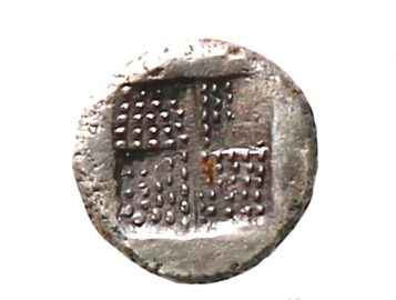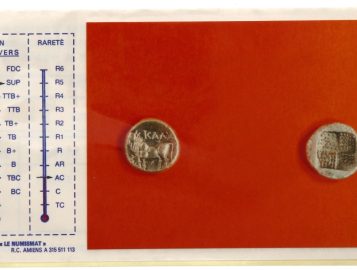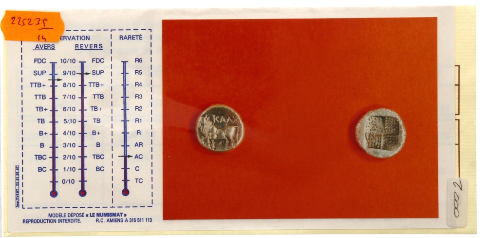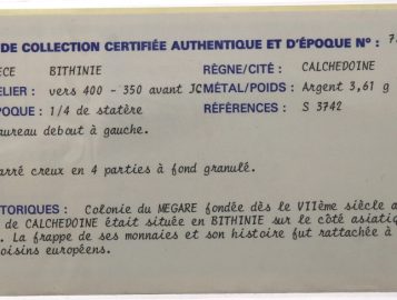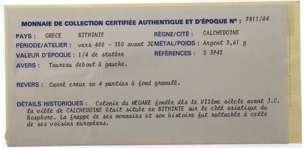 GRECE BITHINIE – Calchedoine 1/4 de statère en argent vers 400-350 av JC. Poids 3,61 grs. S 3742. Avers: Taureau debout à gauche. Revers: Carré creux en 4 parties à fond granulé. TTB/Sup. Certificat d’authenticité Eric Sellier n° 7811/04
