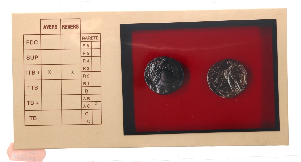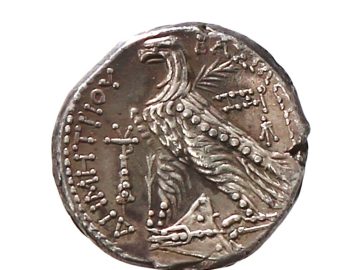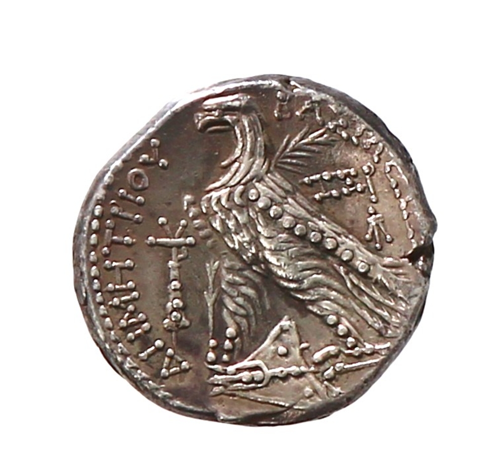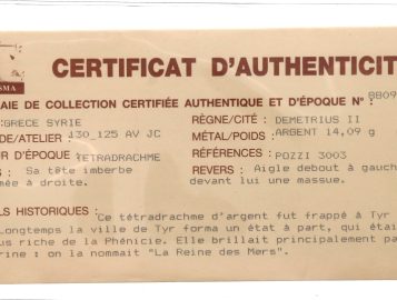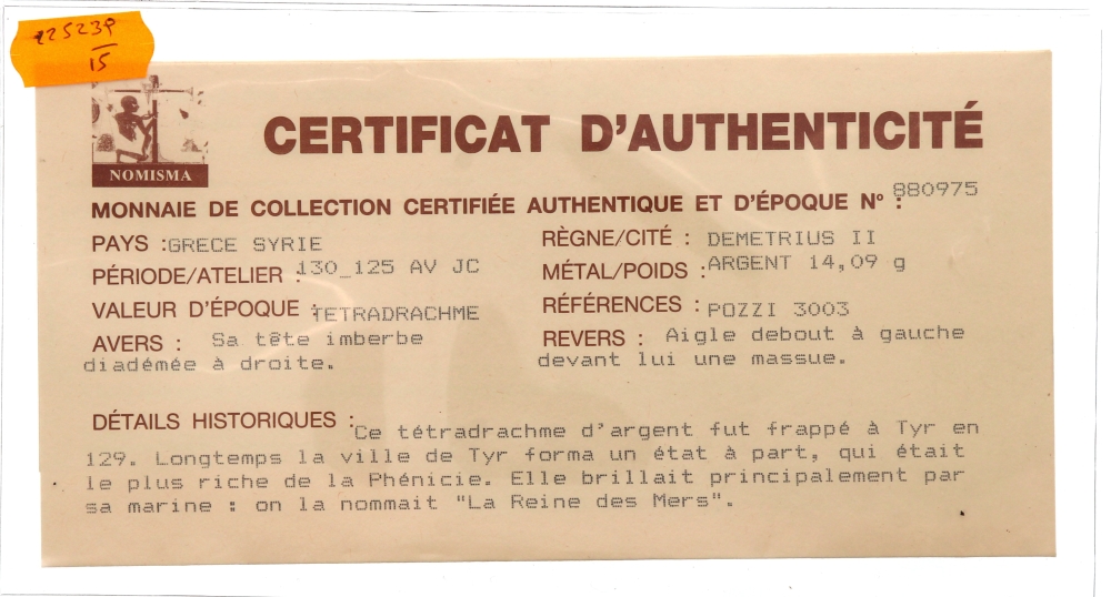 GRECE SYRIE – Demetrius II tétradrachme en argent 130-125 av JC. Poids 14,09 grs. P 3003. Atelier de Tyr. Avers: Sa tête imberbe diadéméè à droite. Revers: aigle debout à gauche devant lui une massue. TTB+. Certificat d’authenticité Eric Sellier Nomisma n° 880975
