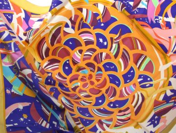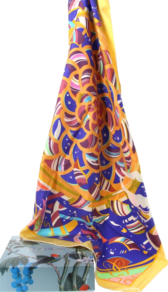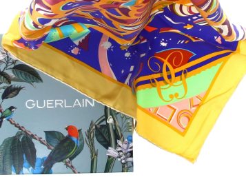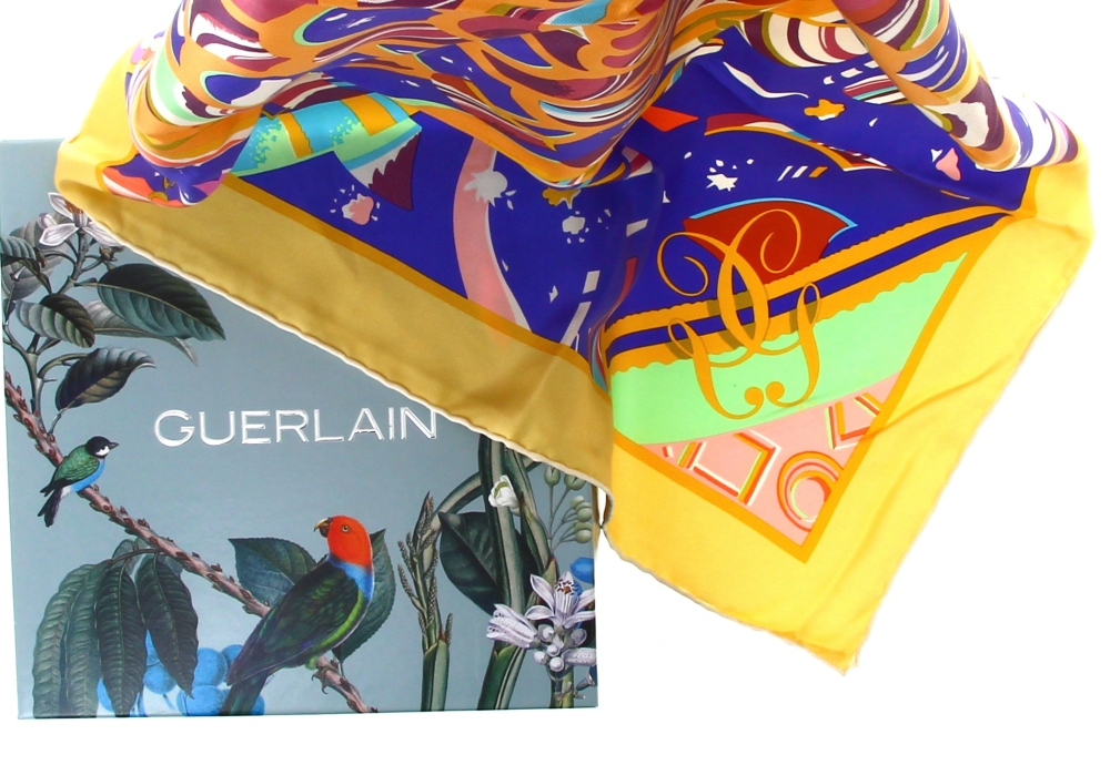 GUERLAIN – Carré en soie, neuf, 90×90 cm, avec boîte de la marque