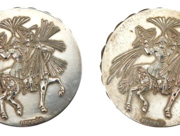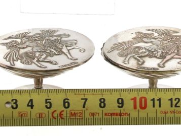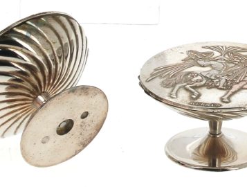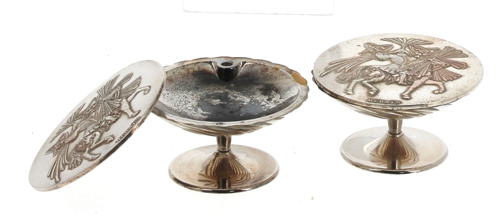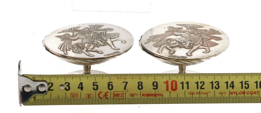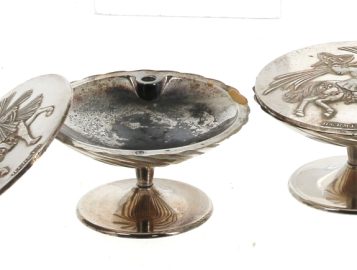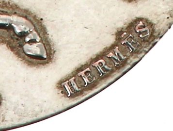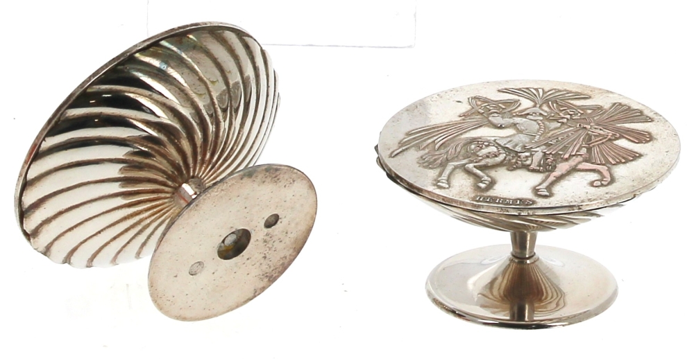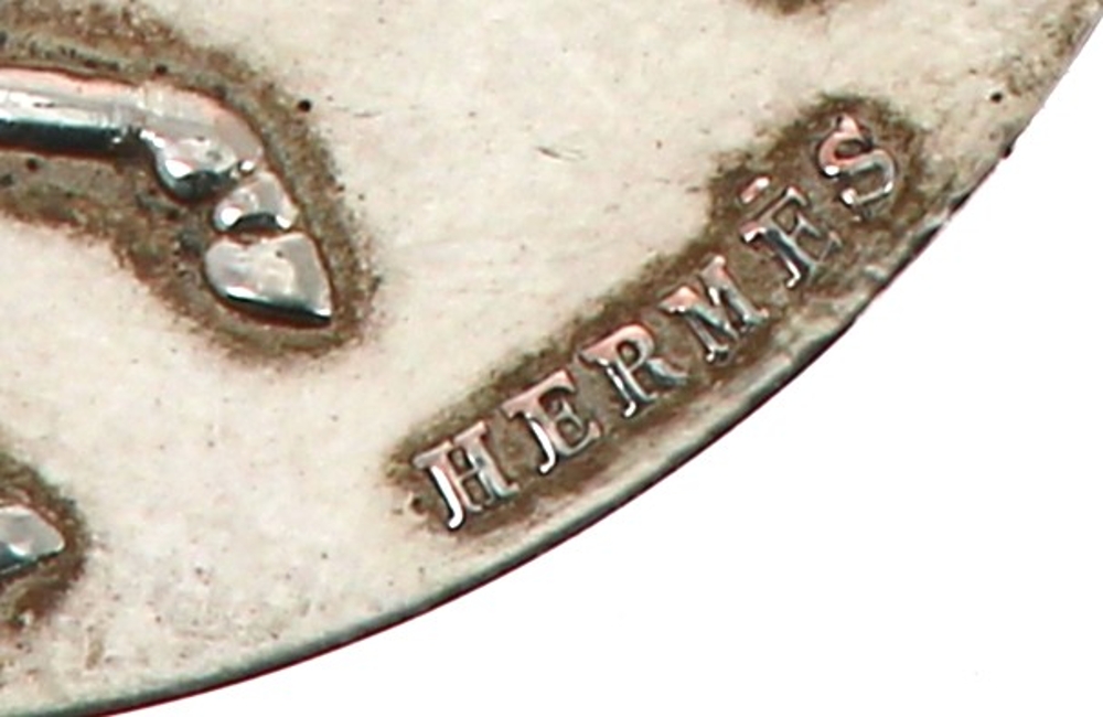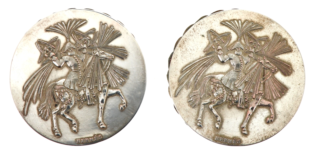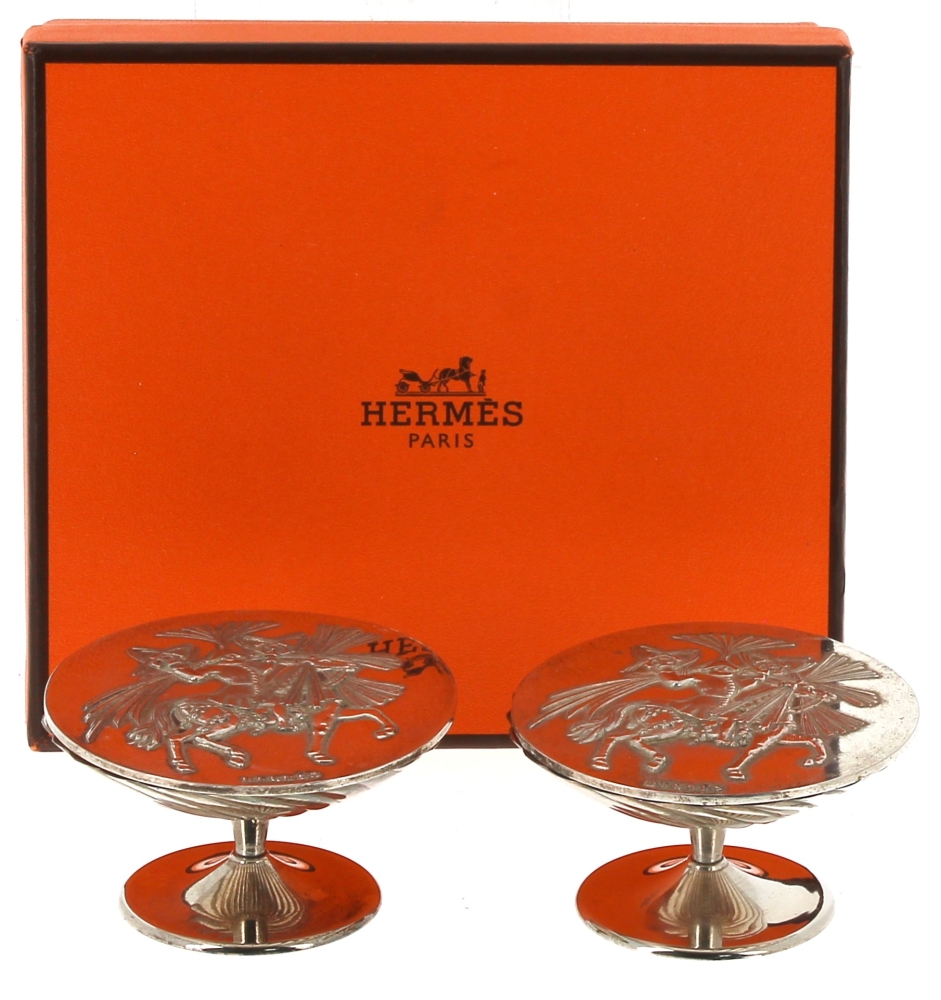HERMES – Paire de cendriers individuels en métal argenté, décor Feux d’artifice, signés, H 3,5 x diam. 6 cm, boîte d’origine et ruban