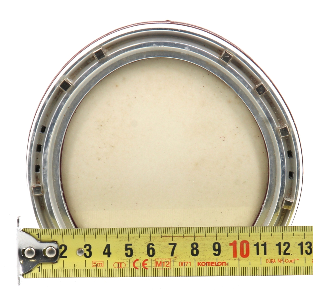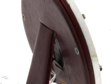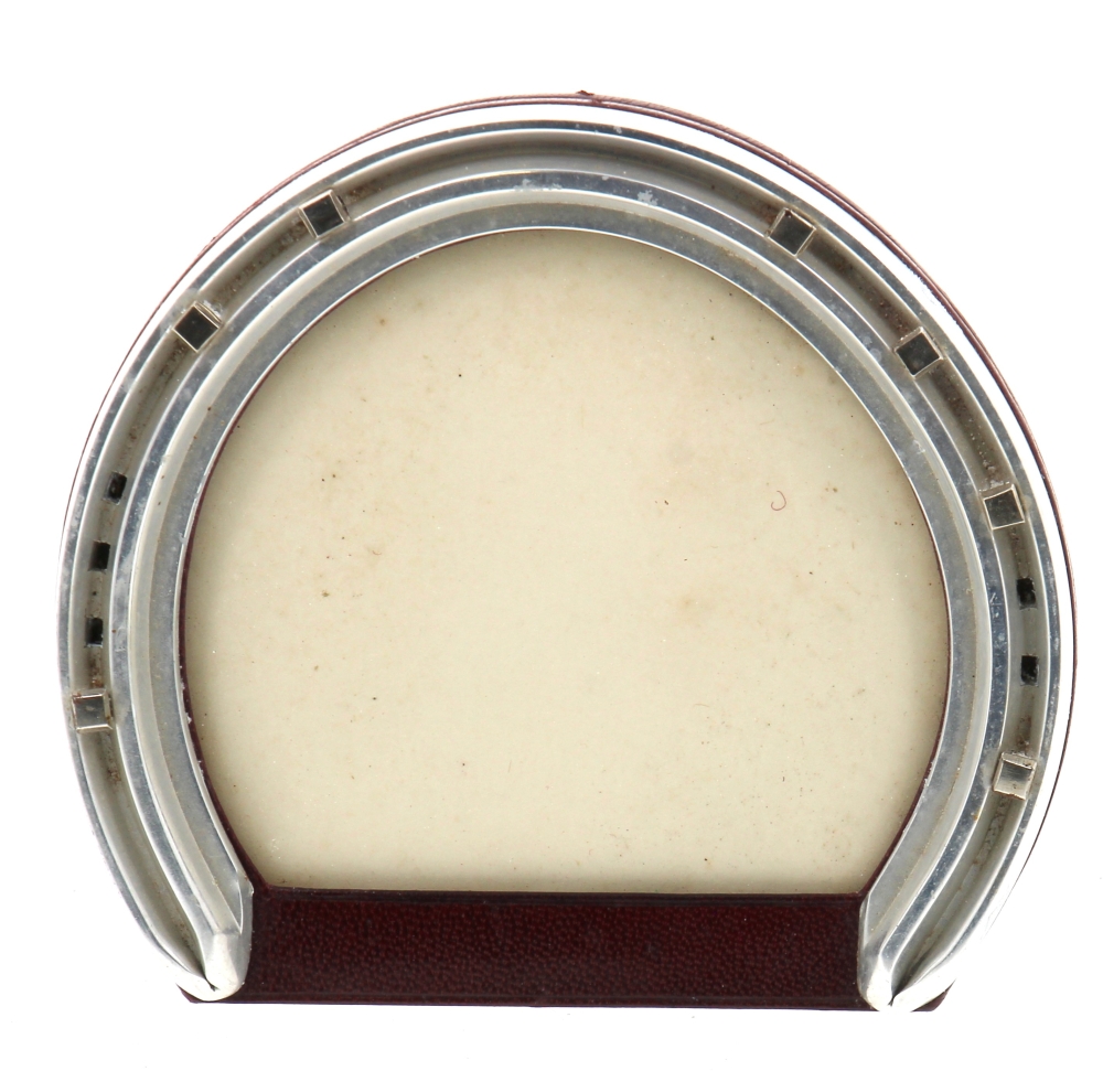 HERMES Paris, circa 1950 – Cadre à photo en forme de « Fer à Cheval ». Marqué. En cuir brun, le fer à cheval en aluminium, arrière chevalet. Traces d’utilisation. H 11,5 cm x L 12,5 cm