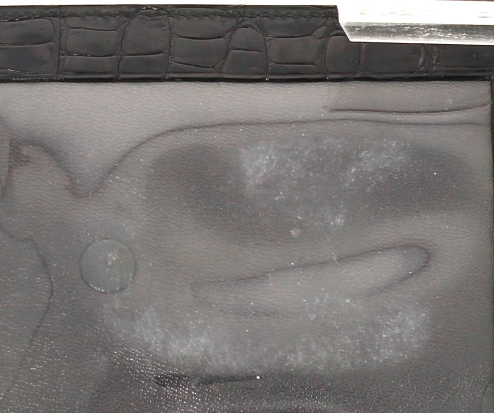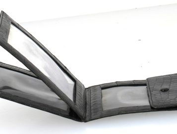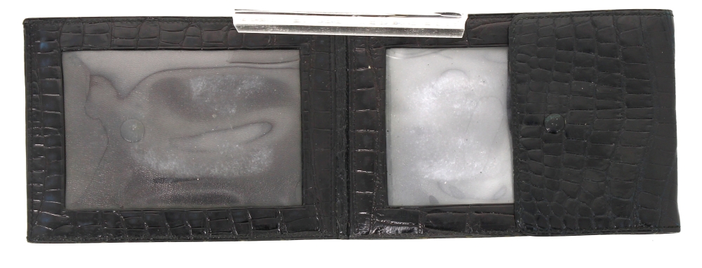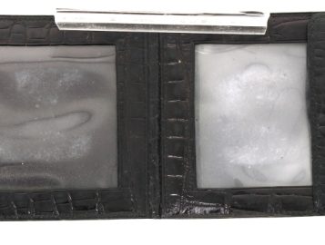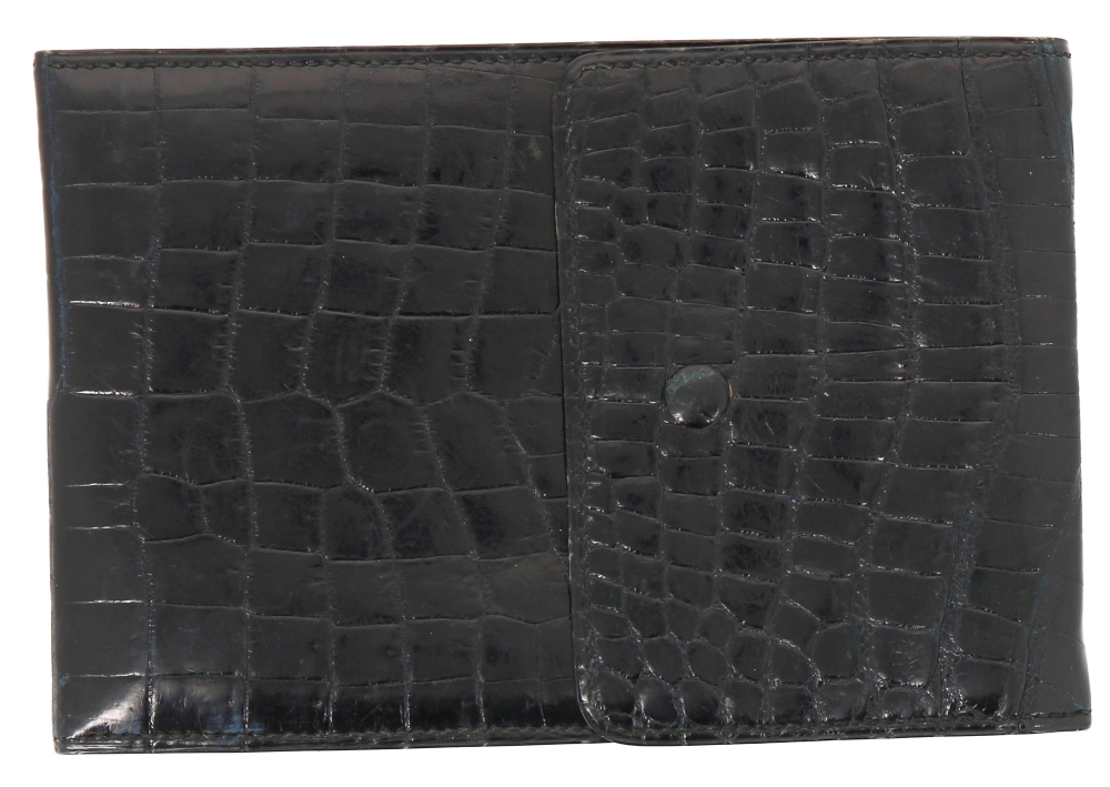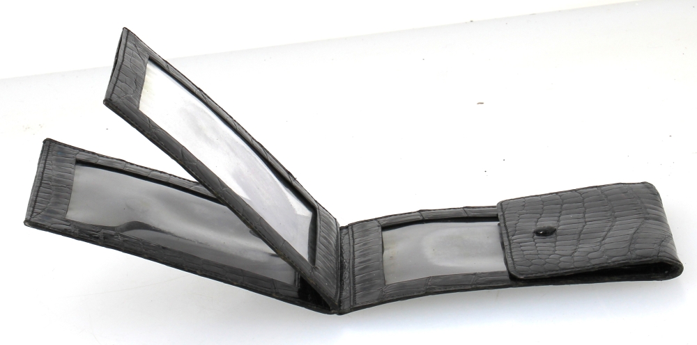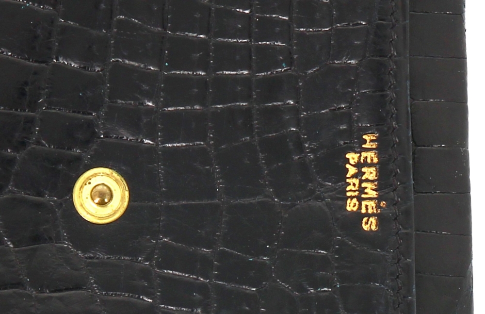 HERMES Paris – Porte-photos en croco noir, 15 x 10 cm. Bon état (très légère usure d’usage au bouton de la pression ; usures sur les transparents intérieurs)