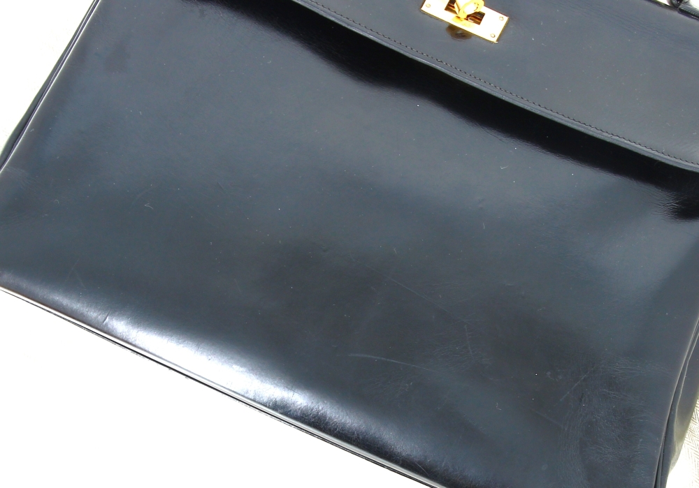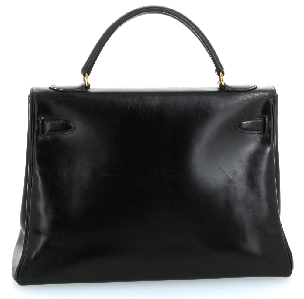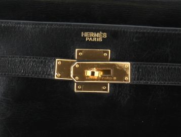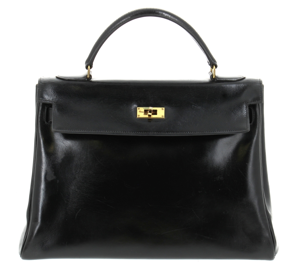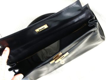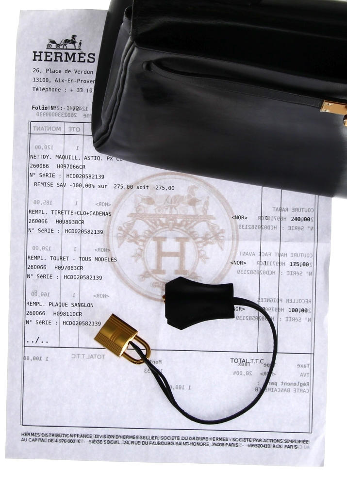 HERMES Paris – Sac modèle KELLY, vintage, en cuir noir. 23 x 32 x 12,5 cm. Hteur anse comprise 32 cm. Sac restauré par les ateliers HERMES en 2023 (facture jointe d’un montant de 1100€). Cadenas avec clé neuf, avec pochette Hermès. Sac à poussière neuf. Quelques griffures d’usage. Certificat d’authenticité Auithentifier.com