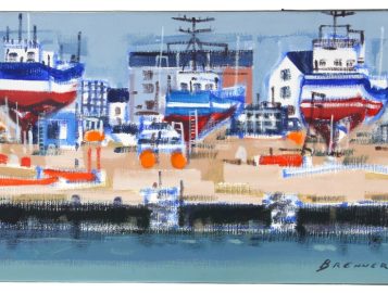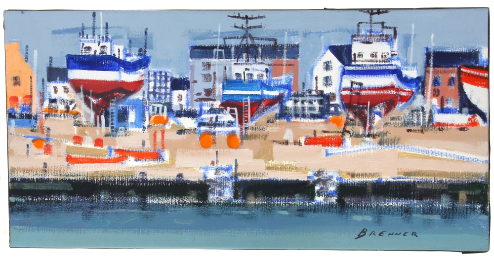Jacques BRENNER (1936-2023) « Chantier à Concarneau », acrylique sur toile, signée bas droite, 2010, 30 x 60 cm