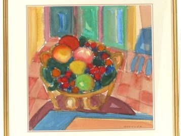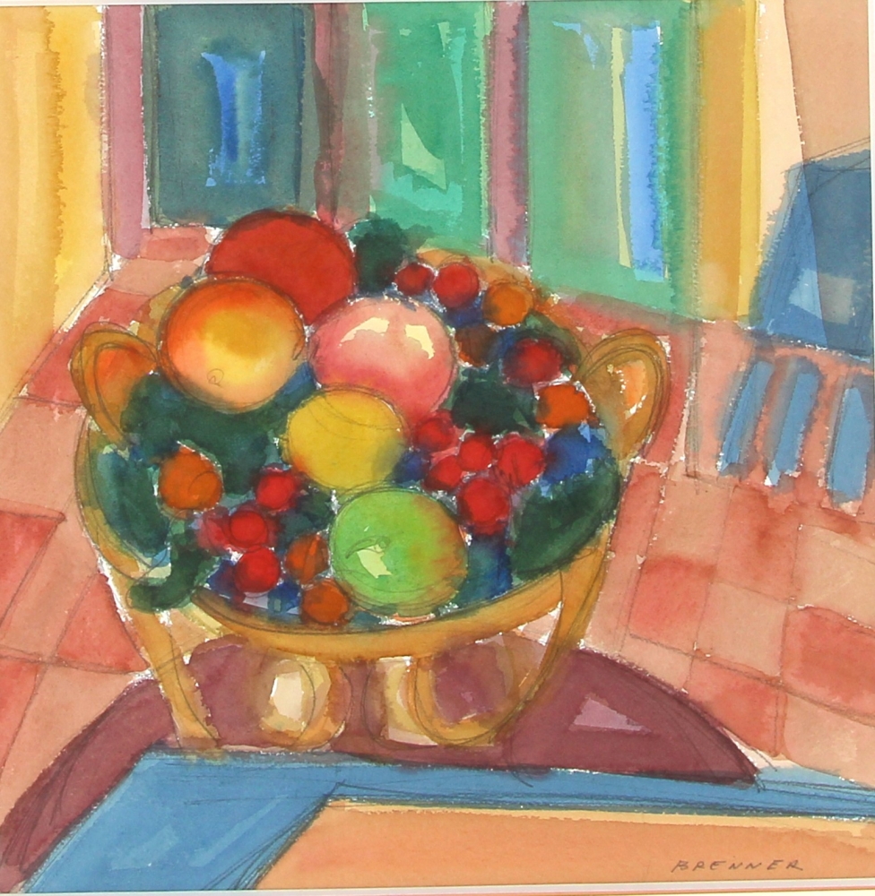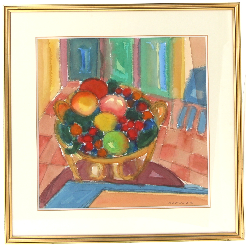 Jacques BRENNER (1936-2023) « Nature morte aux fruits », aquarelle, titrée et datée 1990 au dos, signée bas droite, 39 x 38,5 cm (encadrée 54,5 x 54,5 cm)