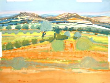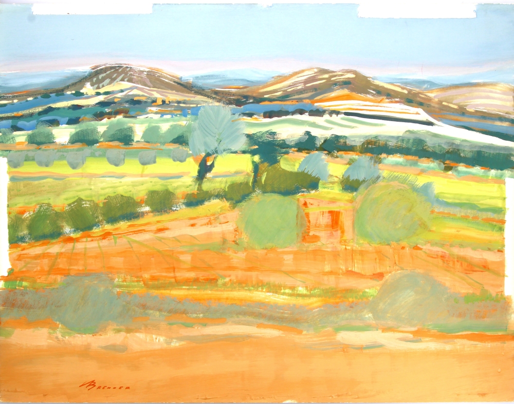 Jacques BRENNER (1936-2023) « Paysage aux oliviers », gouache, signée bas gauche, 48,5 x 62 cm (dim° totale du support 50 x 65 cm ; non encadrée)
