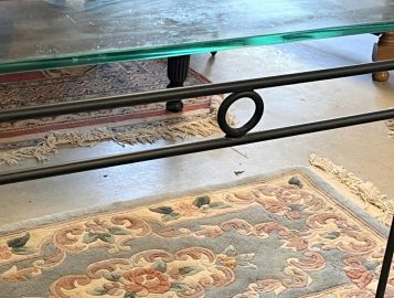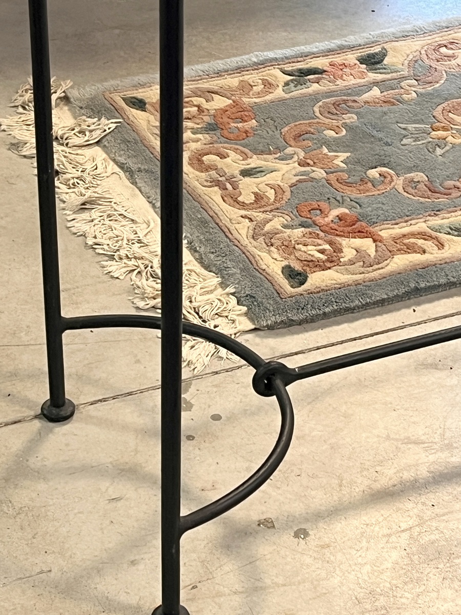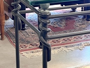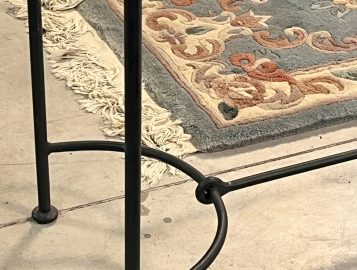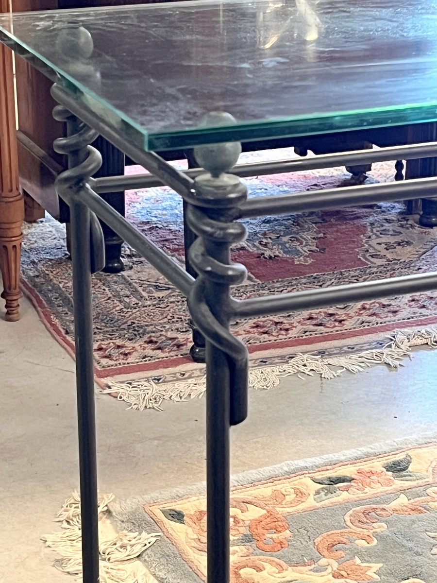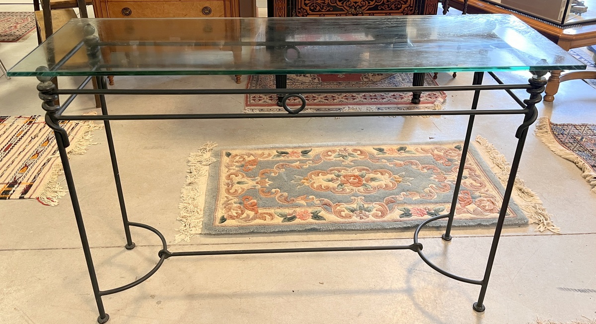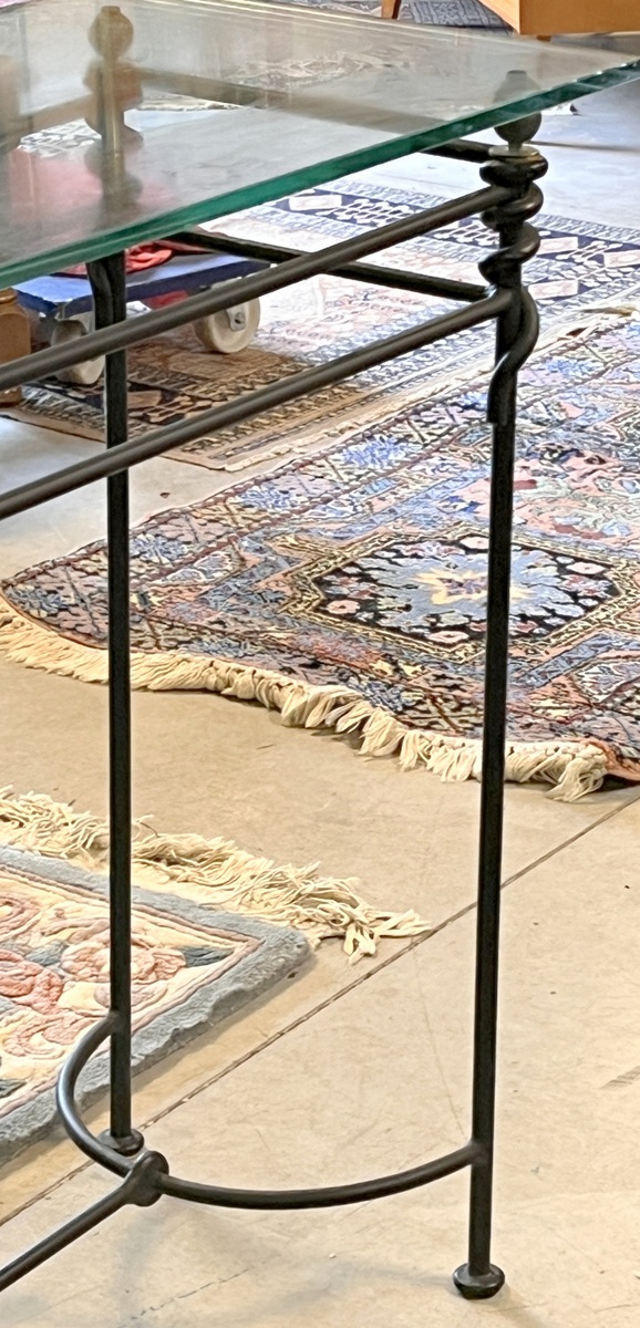 Jacques DUCRU (d’après) pour LIGNE ROSET – Console moderne éditions Ligne Roset d’après Jacques Ducru en acier patiné vert et plateau en verre. Collection Antinéa 1991. H. 84 x 130 x P. 40 cm