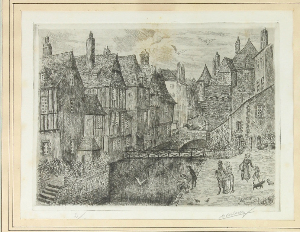 Jean CAVENG (1905-1993) « Vue de Quimper animée », gravure à l’eau-forte, signée bas droite, tirage numéroté « 2 », 17,5 x 23,5 cm (qq rousseurs)