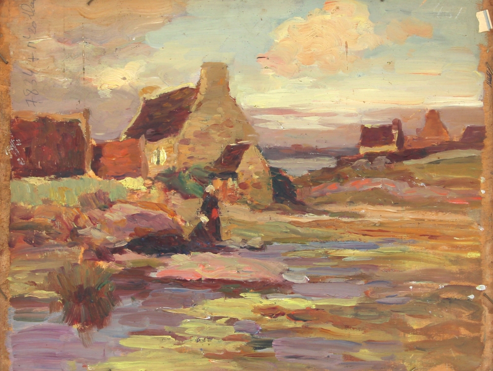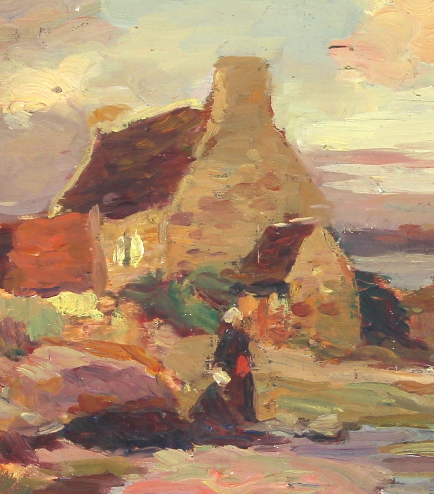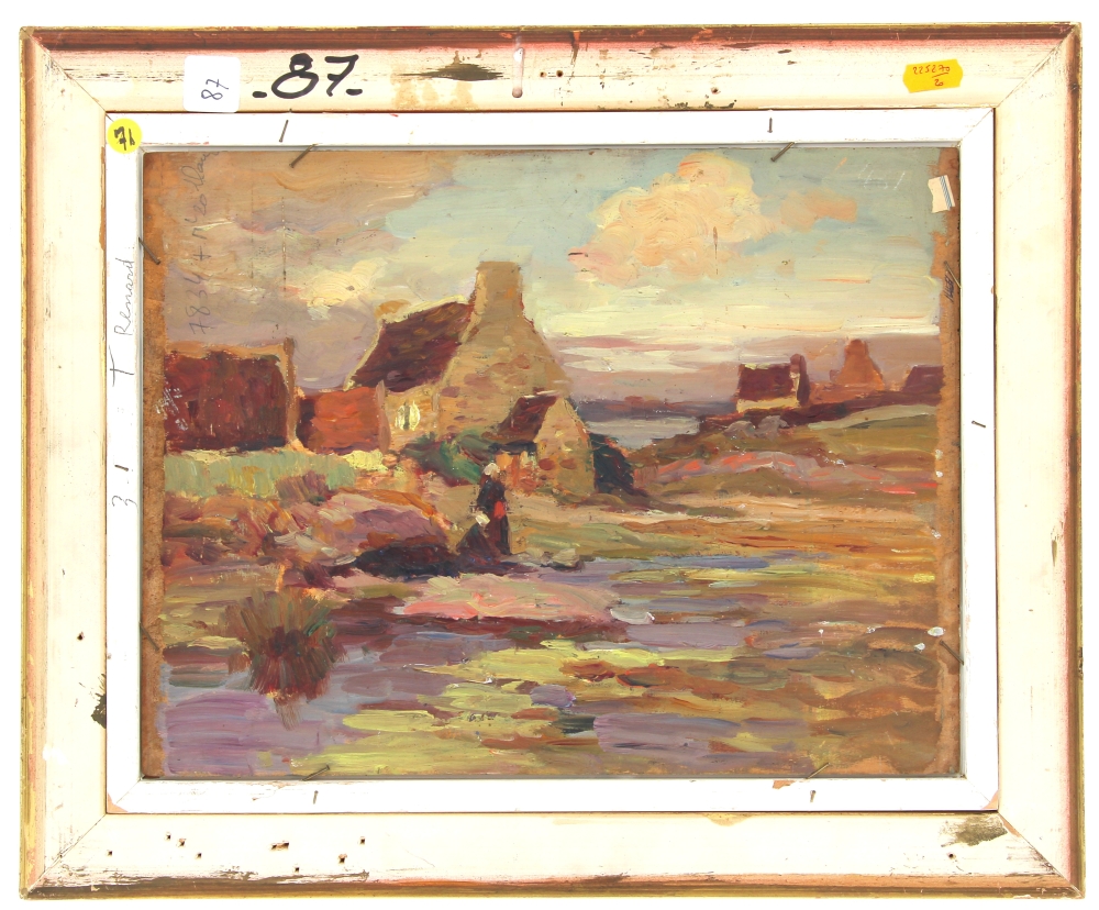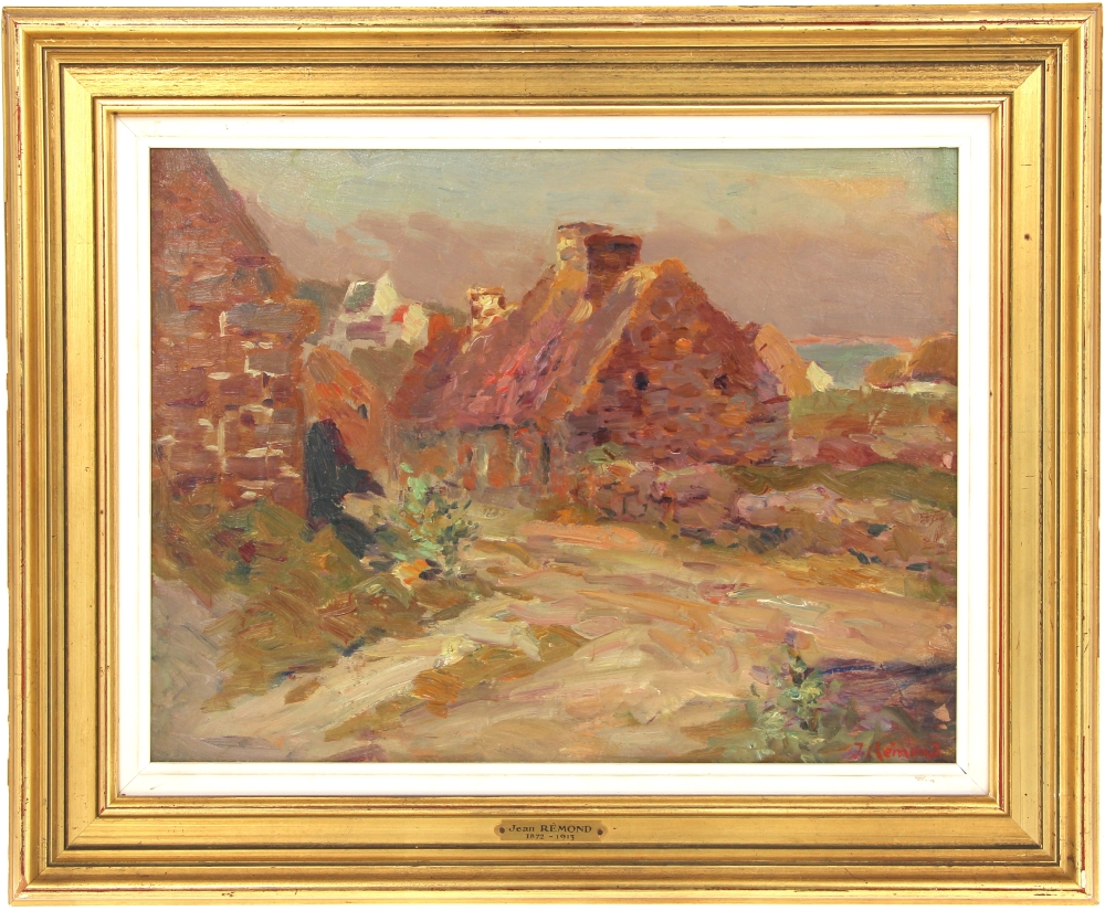 Jean REMOND (1872-1913) « Maisons près de la mer », huile sur panneau, signée bas droite, 26 x 34 cm. Une autre huile au revers « Bretonne près des maisons », encadrée