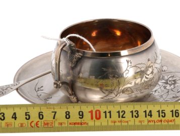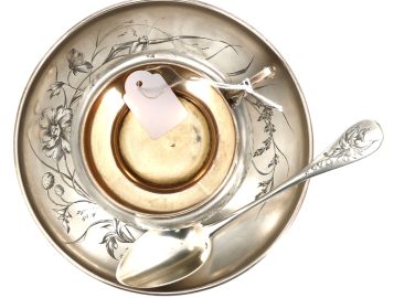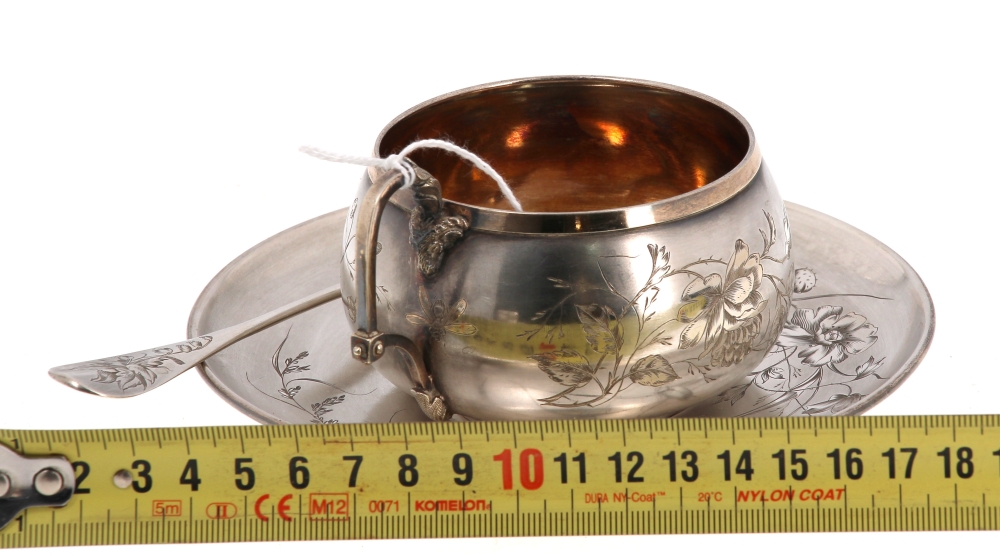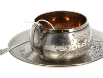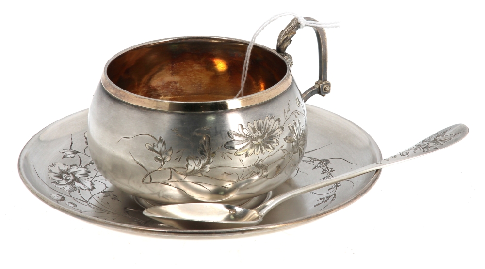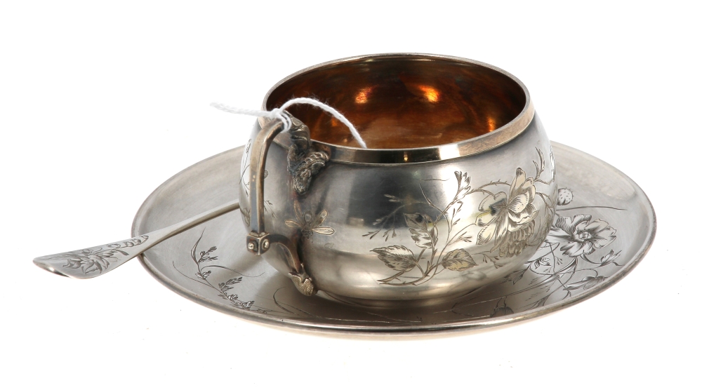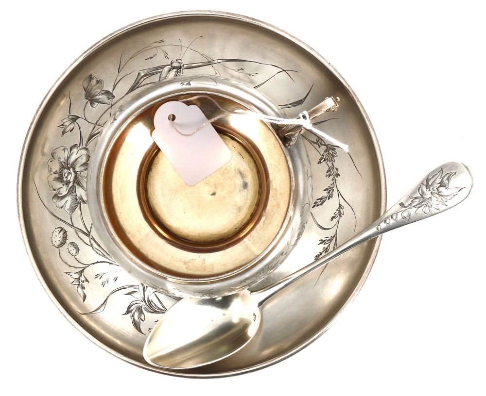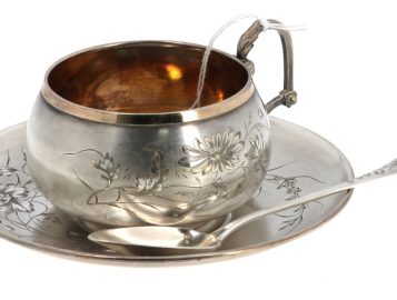 Jules BOIVIN (Orfèvre à Paris de 1862 à 1881) – Tasse, sous-tasse et petite cuillère en argent, poinçon minerve, à décor de fleurs, insecte et papillon. Poids 243,70 grs (petits chocs d’usage)