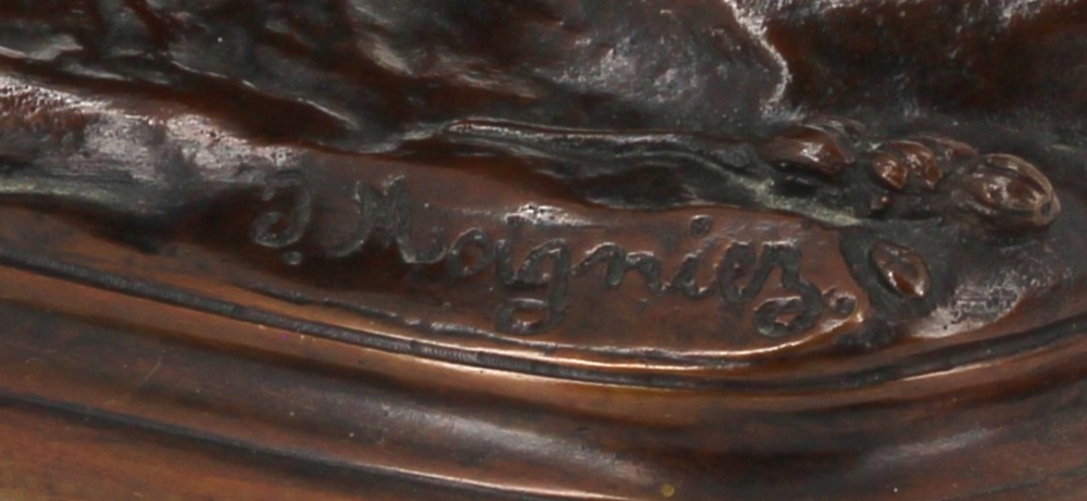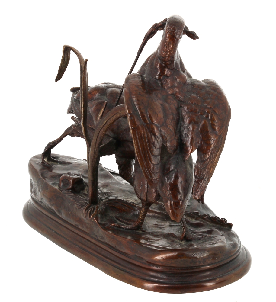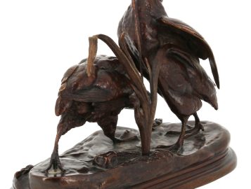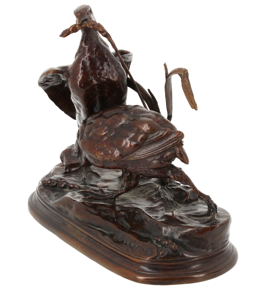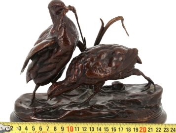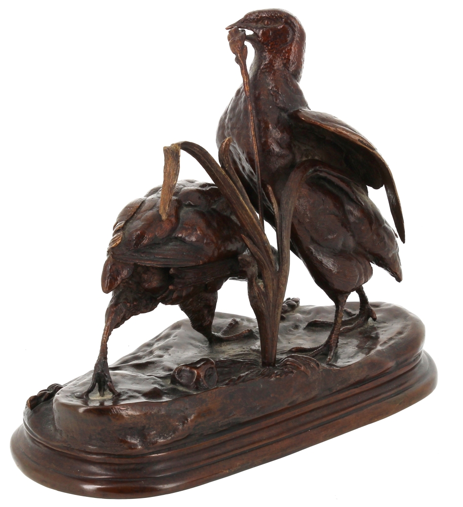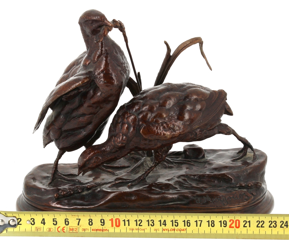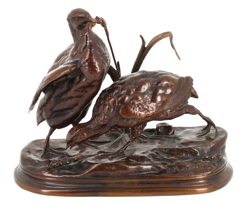 Jules MOIGNIEZ (1835 -1894) – Deux perdrix picorant du blé, sujet en bronze à patine brune, signé sur la terrasse, H 19 x L 23 cm env.