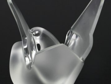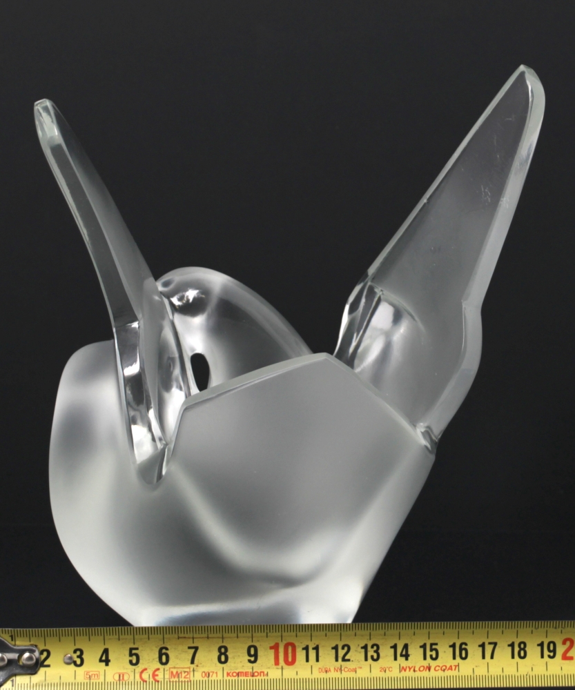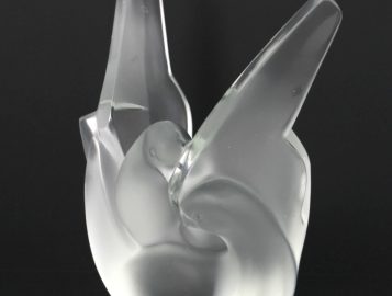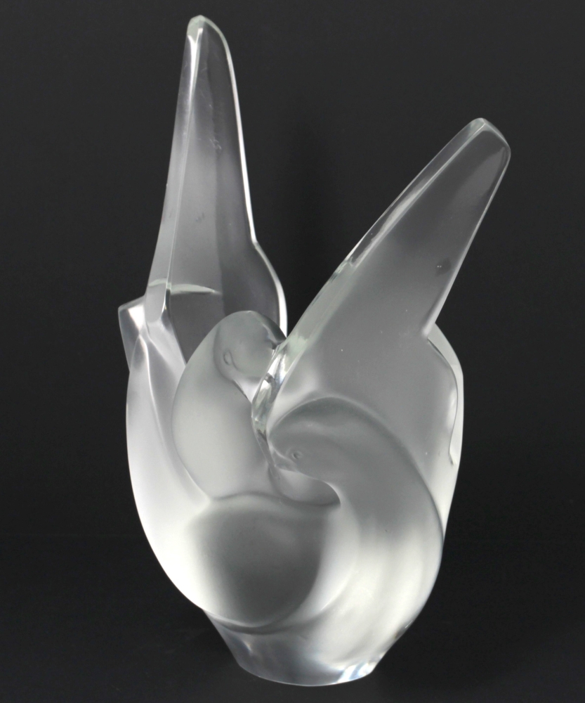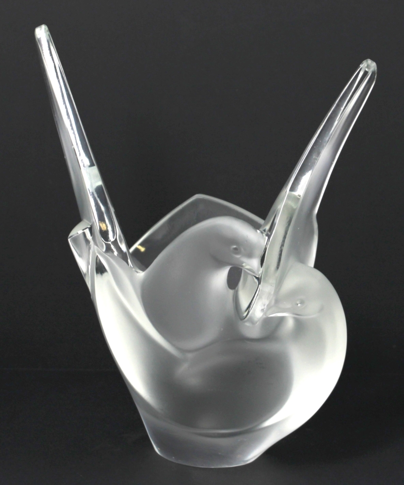 LALIQUE France – Vase pique fleurs modèle « Sylvie » en cristal moulé, pressé et satiné figurant une étreinte de deux colombes. Signé à la pointe sous la pièce. H 21,5 cm