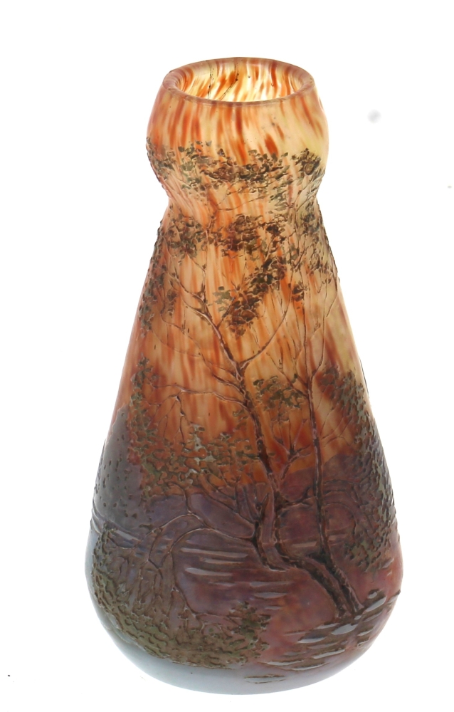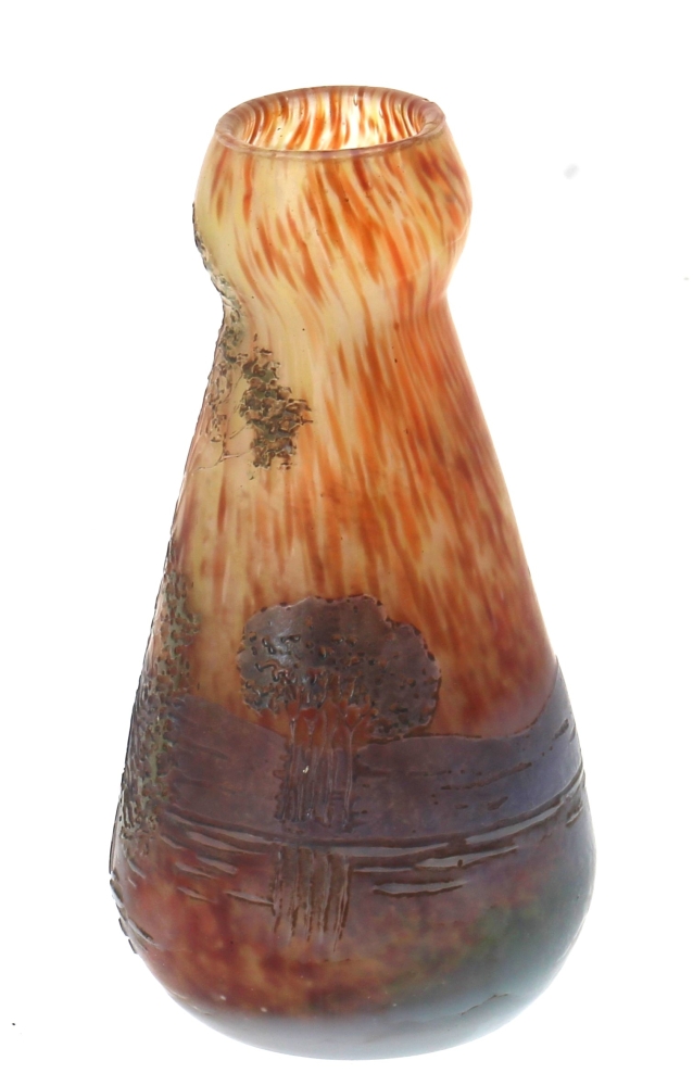 LEGRAS – Petit vase en verre dégagé à l’acide à décor d’un paysage, signé, H 15,5 cm (légers éclats au col)
