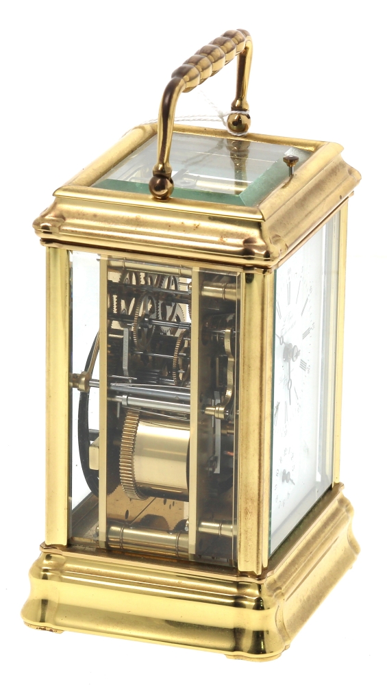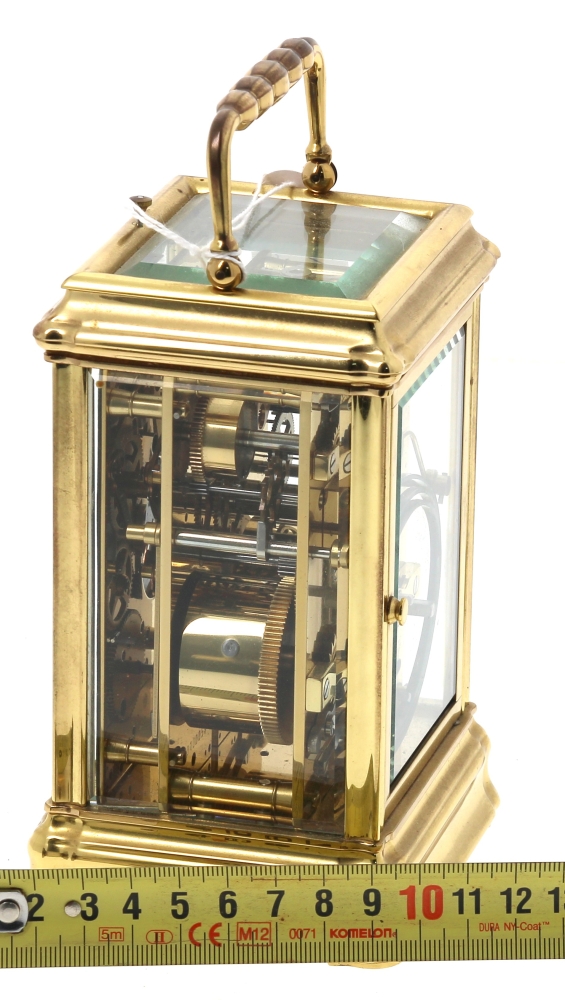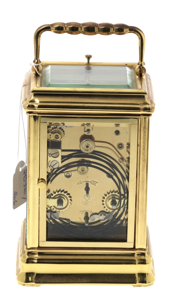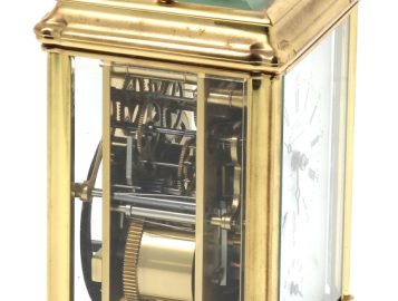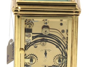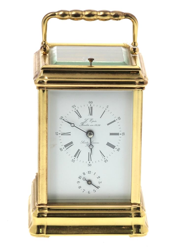 L’EPEE – Pendule à sonnerie ou pendule d’officier en laiton et verre biseauté, cadran marqué « Sainte-Suzanne France – L’Epée fondée en 1839 », avec sa clé, en état de fonctionnement. H 15 cm