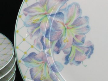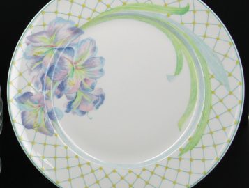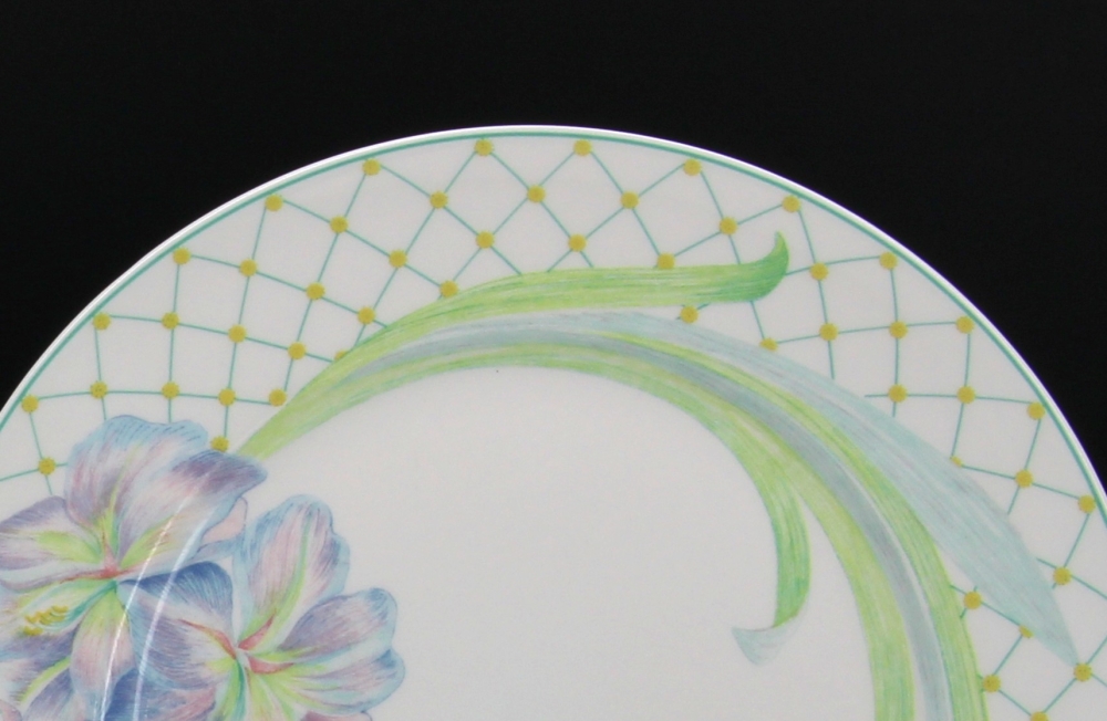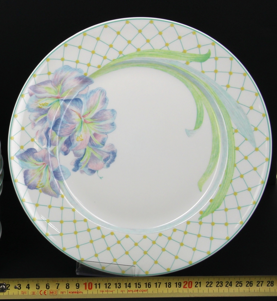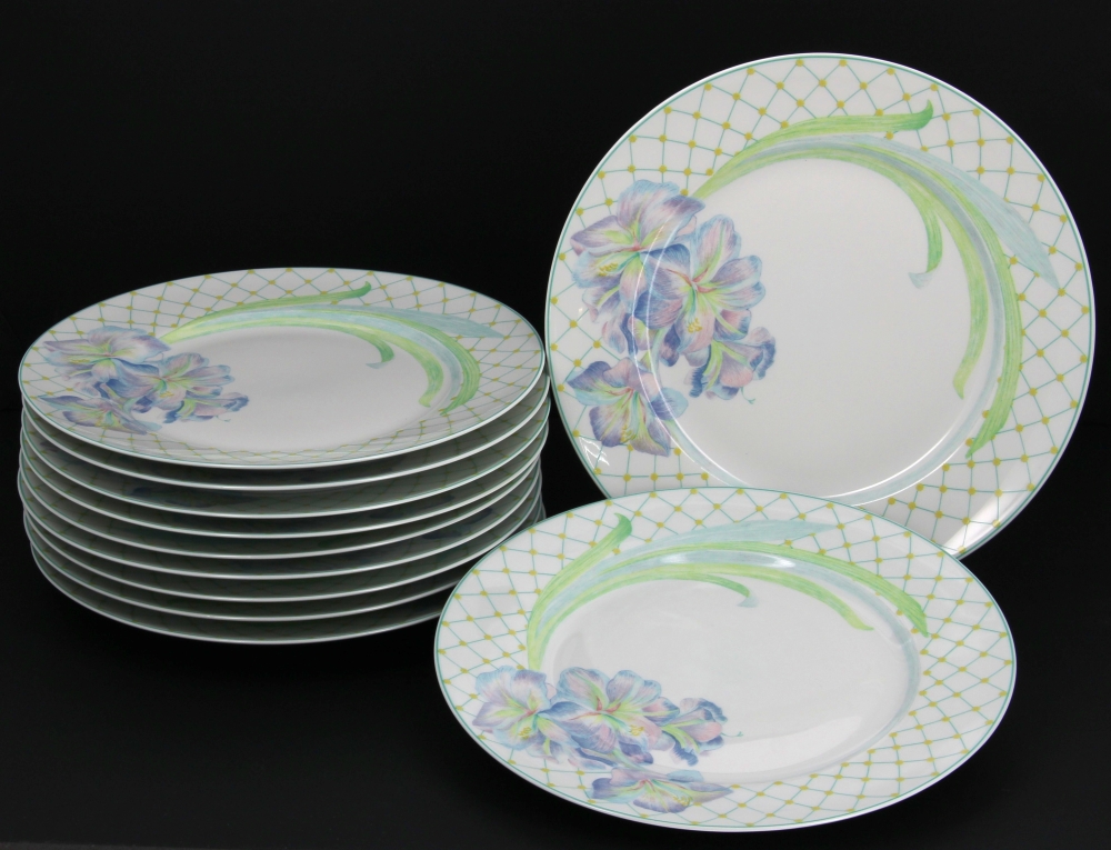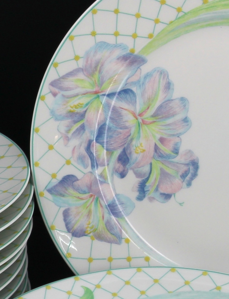 LIMOGES manuf. BERNARDAUD – Décor « Mme de Maintenon » – 11 assiettes plates en porcelaine à décor floral et croisillons en polychromie sur fond blanc. Marquées au revers « Mme de Maintenon toute la séduction de l’épouse secrète de Louis XIV Dessin d’Elisabeth Borel ». Diam. 26,5 cm
