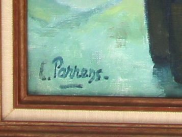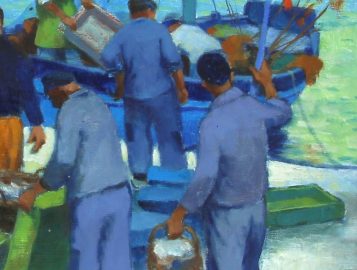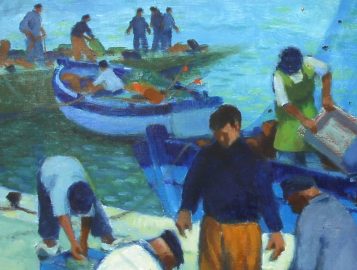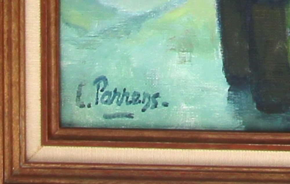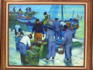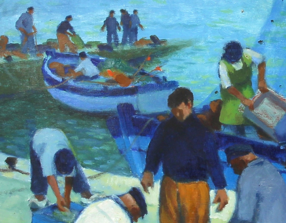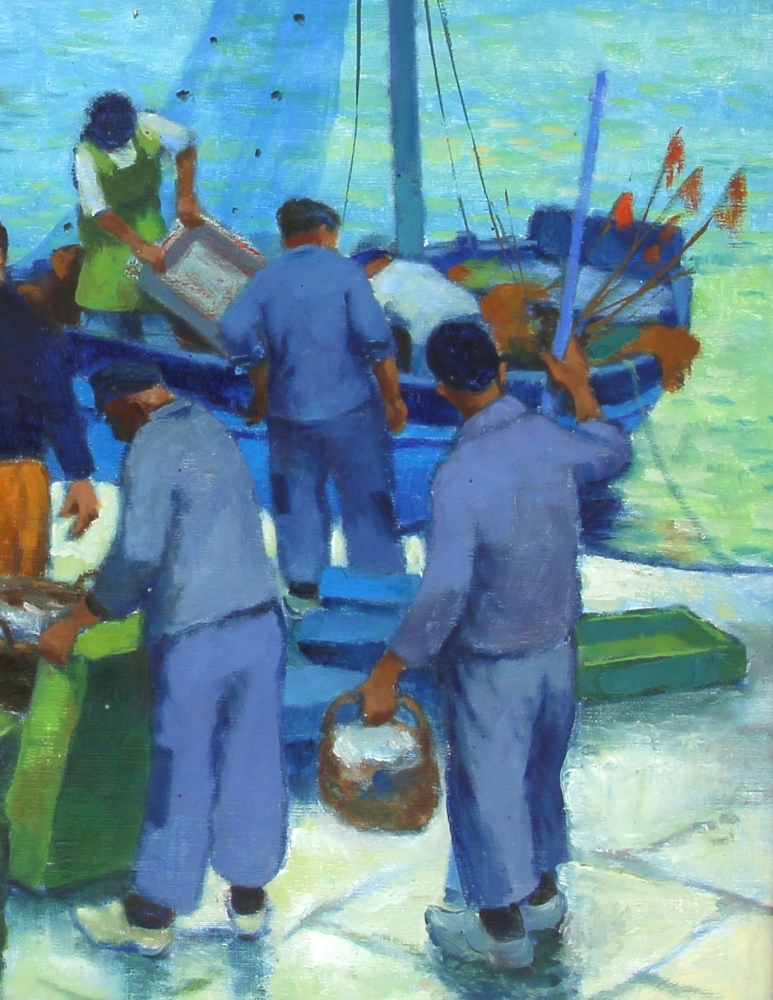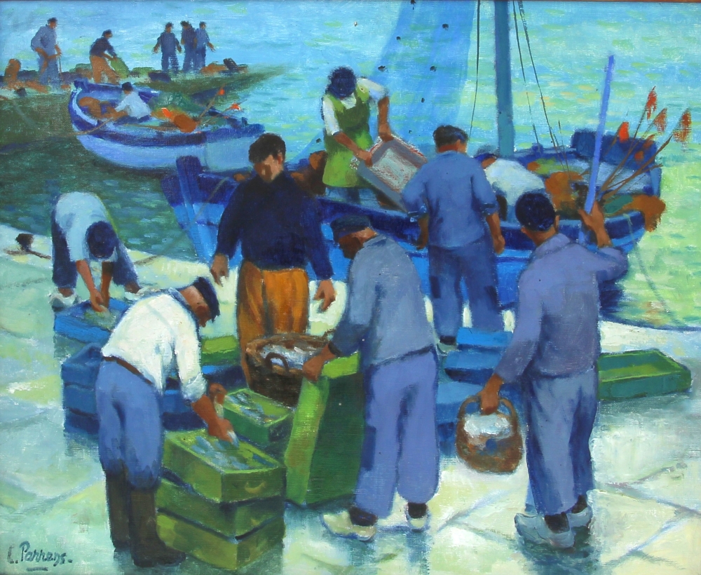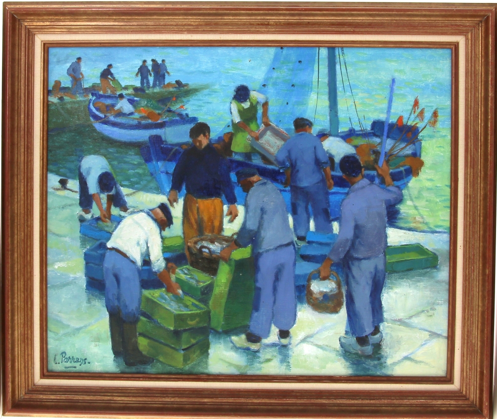 Louis PARRENS (1904-1993) « Lesconil, le débarquement du poisson, Finistère sud », huile sur toile, signée bas gauche, 50 x 61 cm (petit trou dans la toile milieu haut)
