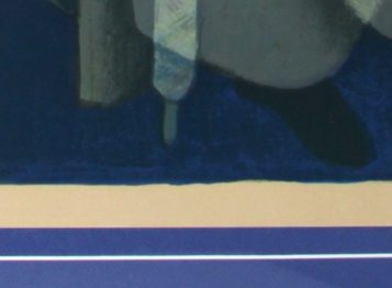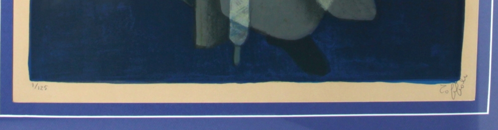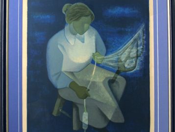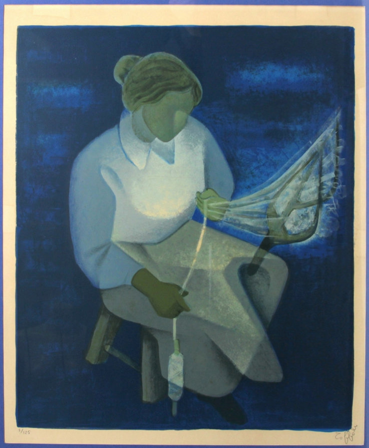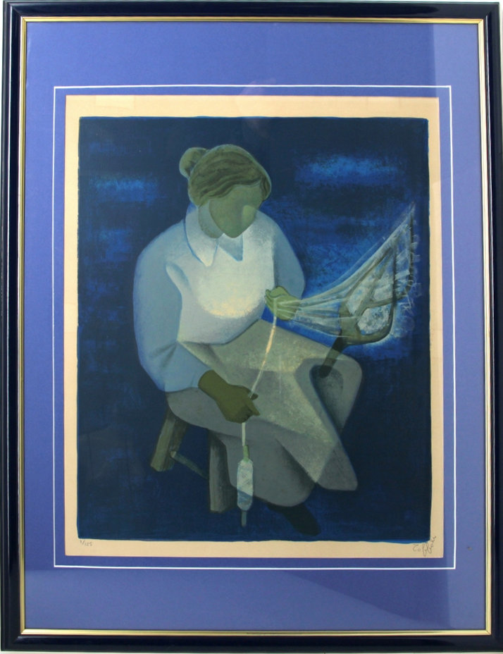 Louis TOFFOLI (1907-1999) « La fileuse », lithographie en couleurs, signée bas droite, tirage numéroté 1/125, 59 x 48 cm (encadrée, baguettes bleu et or, 85 x 65 cm, deux légèrs décolorations en marge supérieure due à marque d’adhésif
