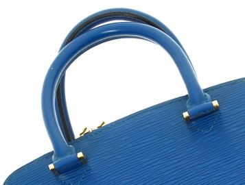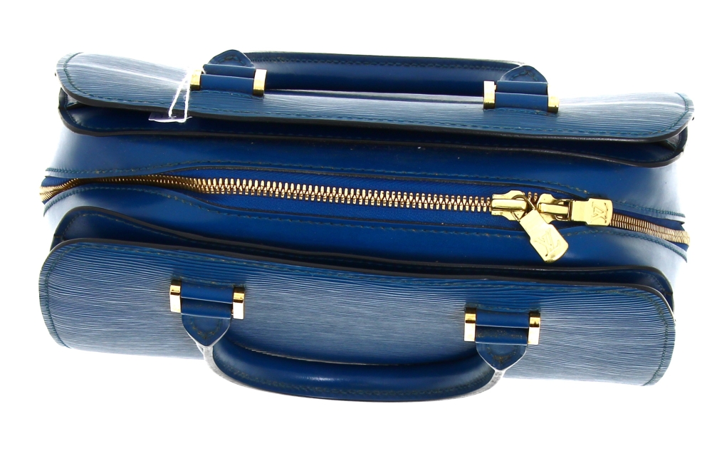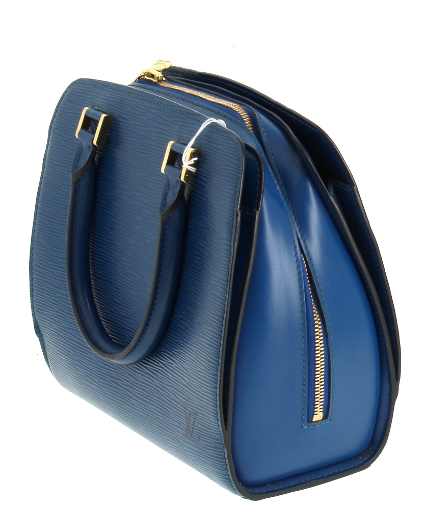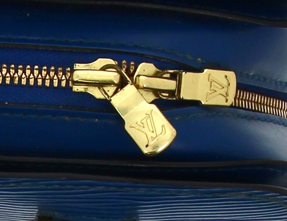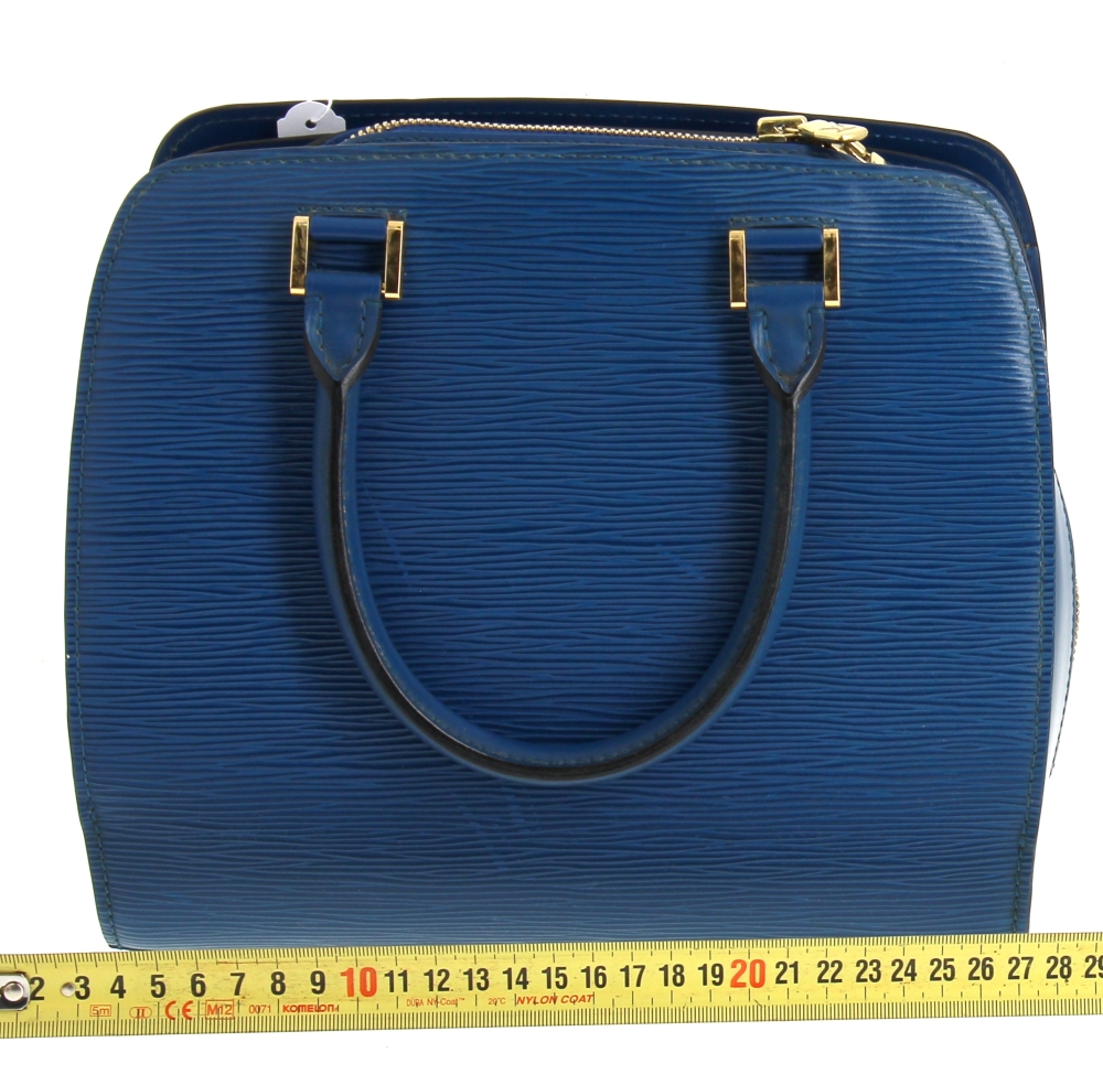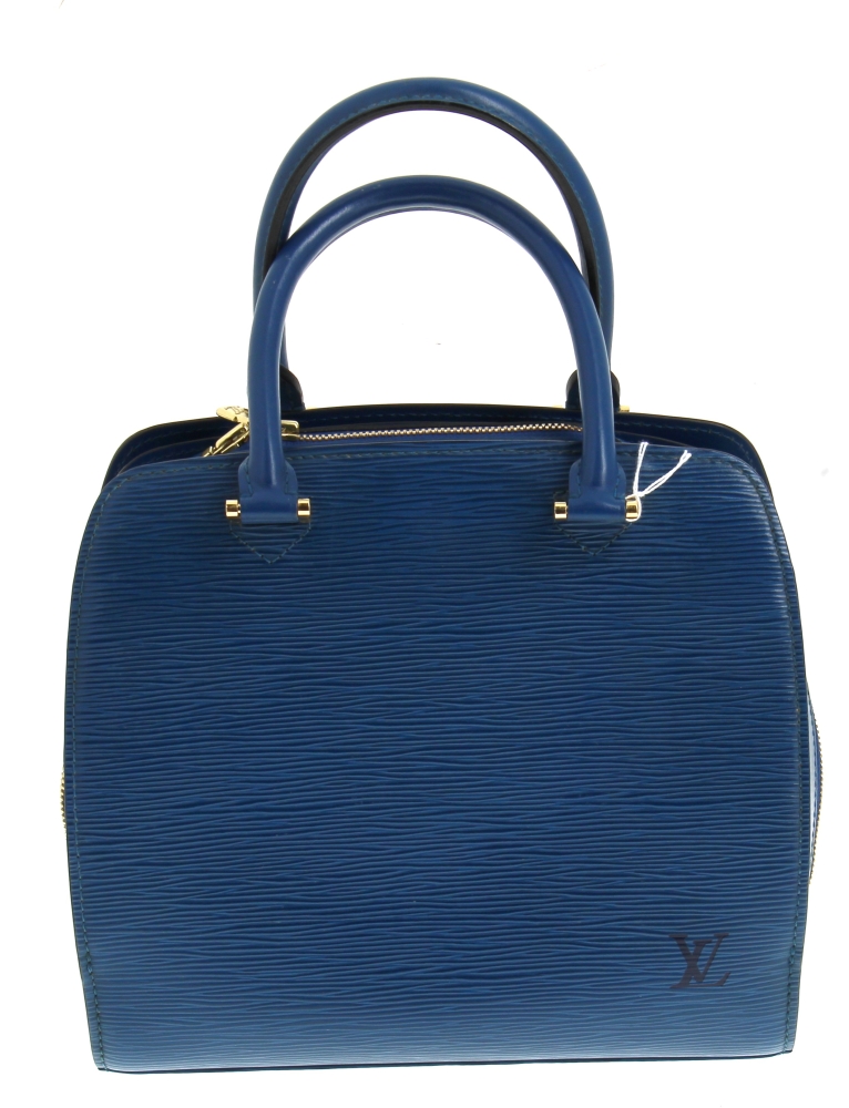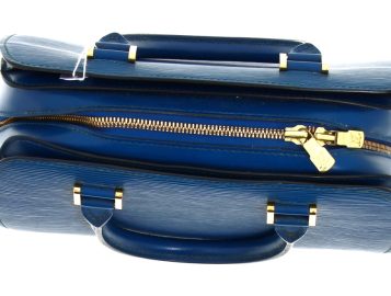 LOUIS VUITTON Paris – Sac à deux anses en cuir épi bleu, ouverture centrale à fermeture éclair (intérieur avec un compartiment zippé), 2 rabats latéraux. H 22,5 x L 25 cm. Numéro de production M I0988. Avec sac à poussière. Bon état général. Qqs griffures d’usage, qqs petites marques d’usage à l’ intérieur