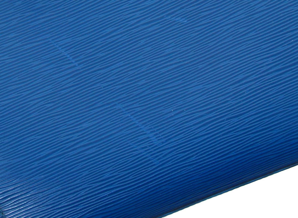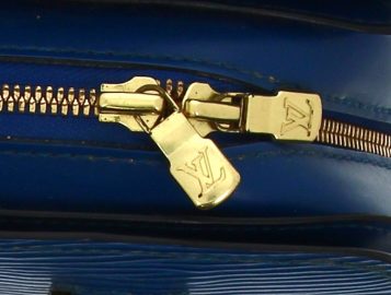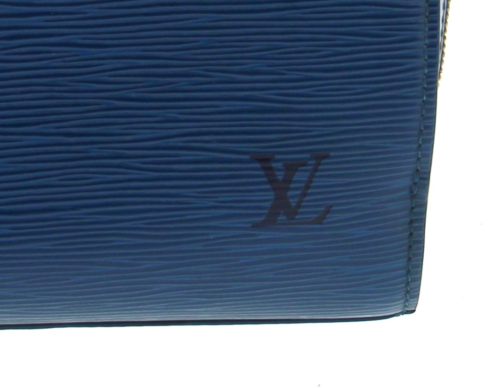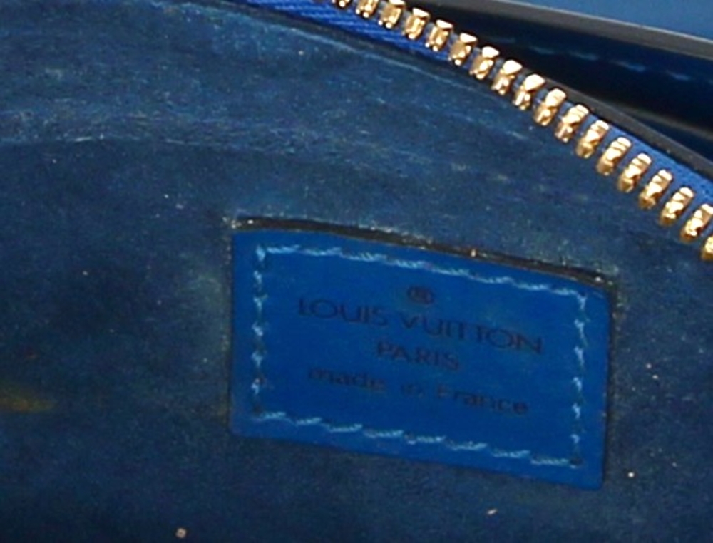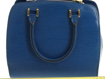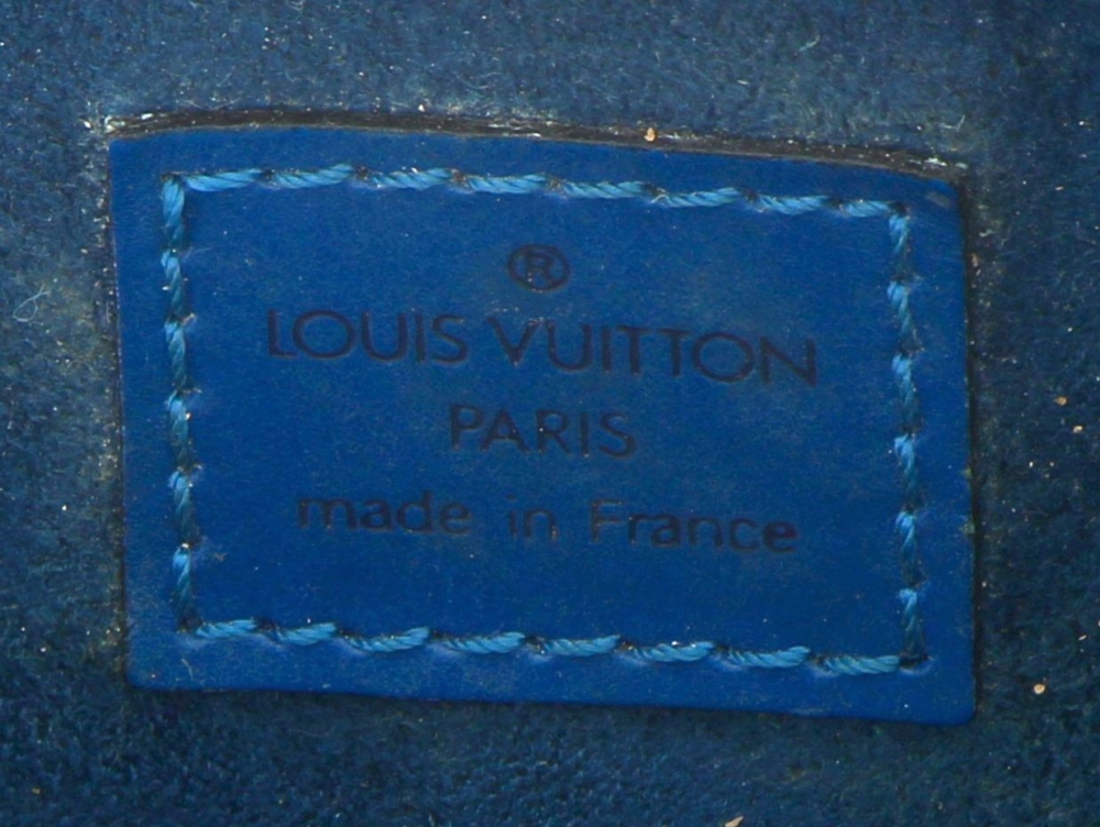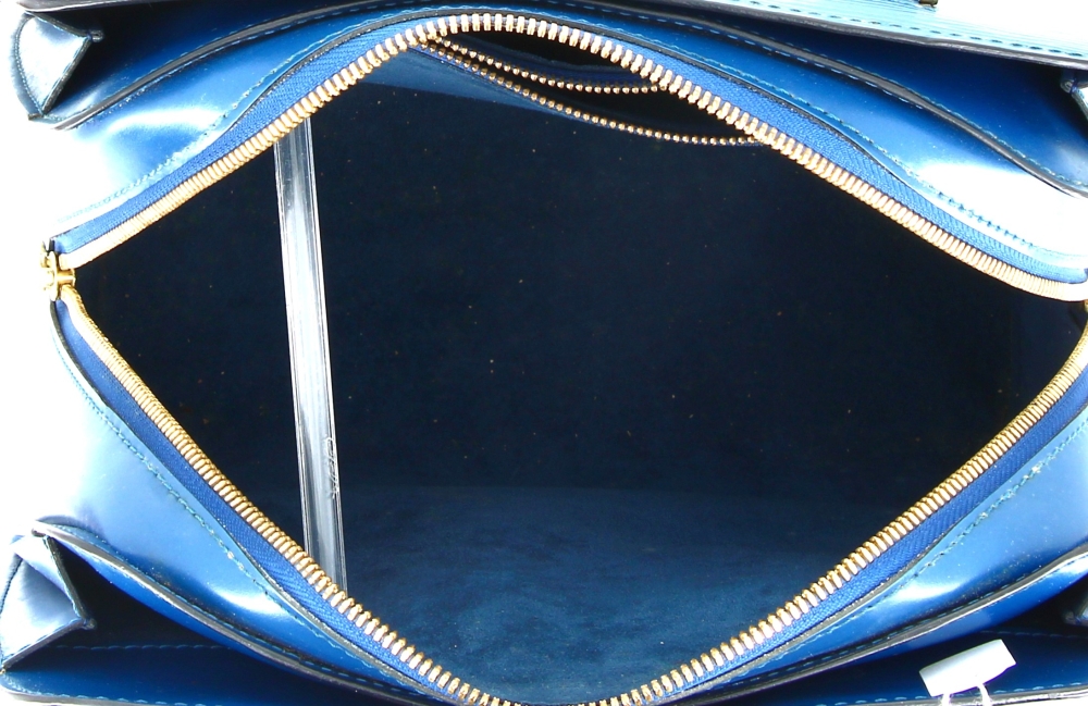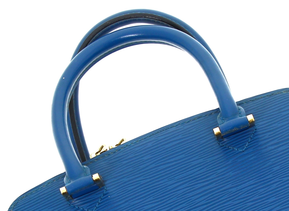LOUIS VUITTON Paris – Sac à deux anses en cuir épi bleu, ouverture centrale à fermeture éclair (intérieur avec un compartiment zippé), 2 rabats latéraux. H 22,5 x L 25 cm. Numéro de production M I0988. Avec sac à poussière. Bon état général. Qqs griffures d’usage, qqs petites marques d’usage à l’ intérieur