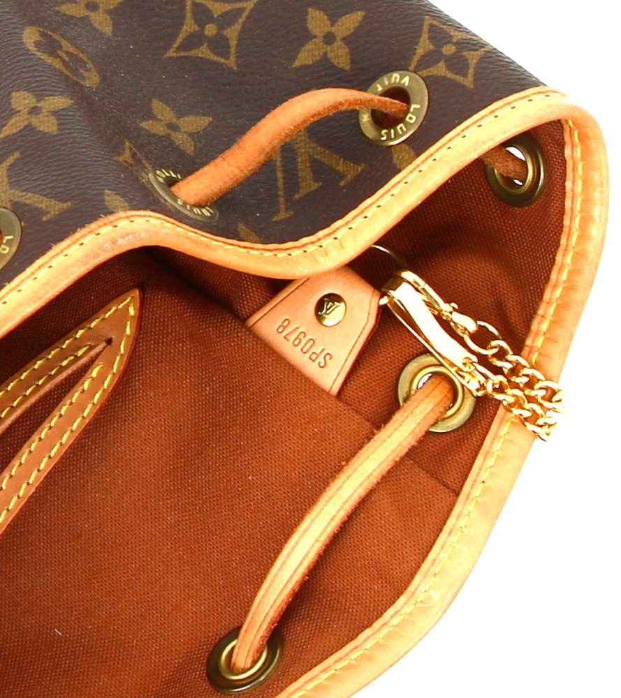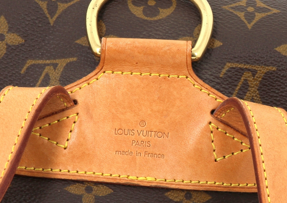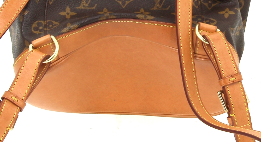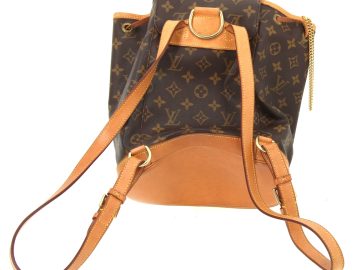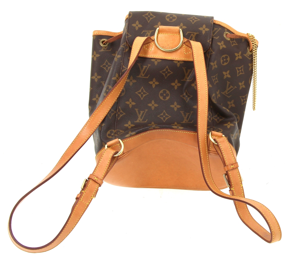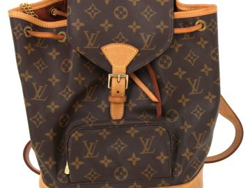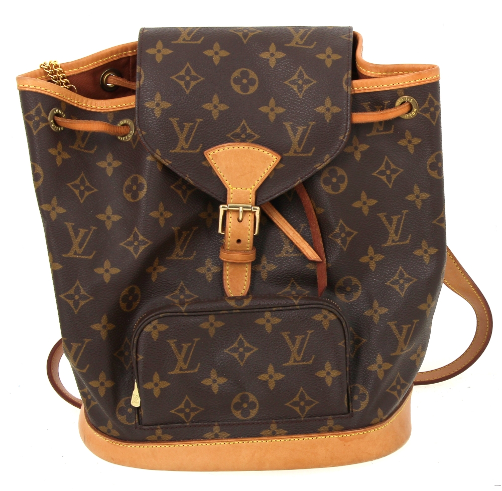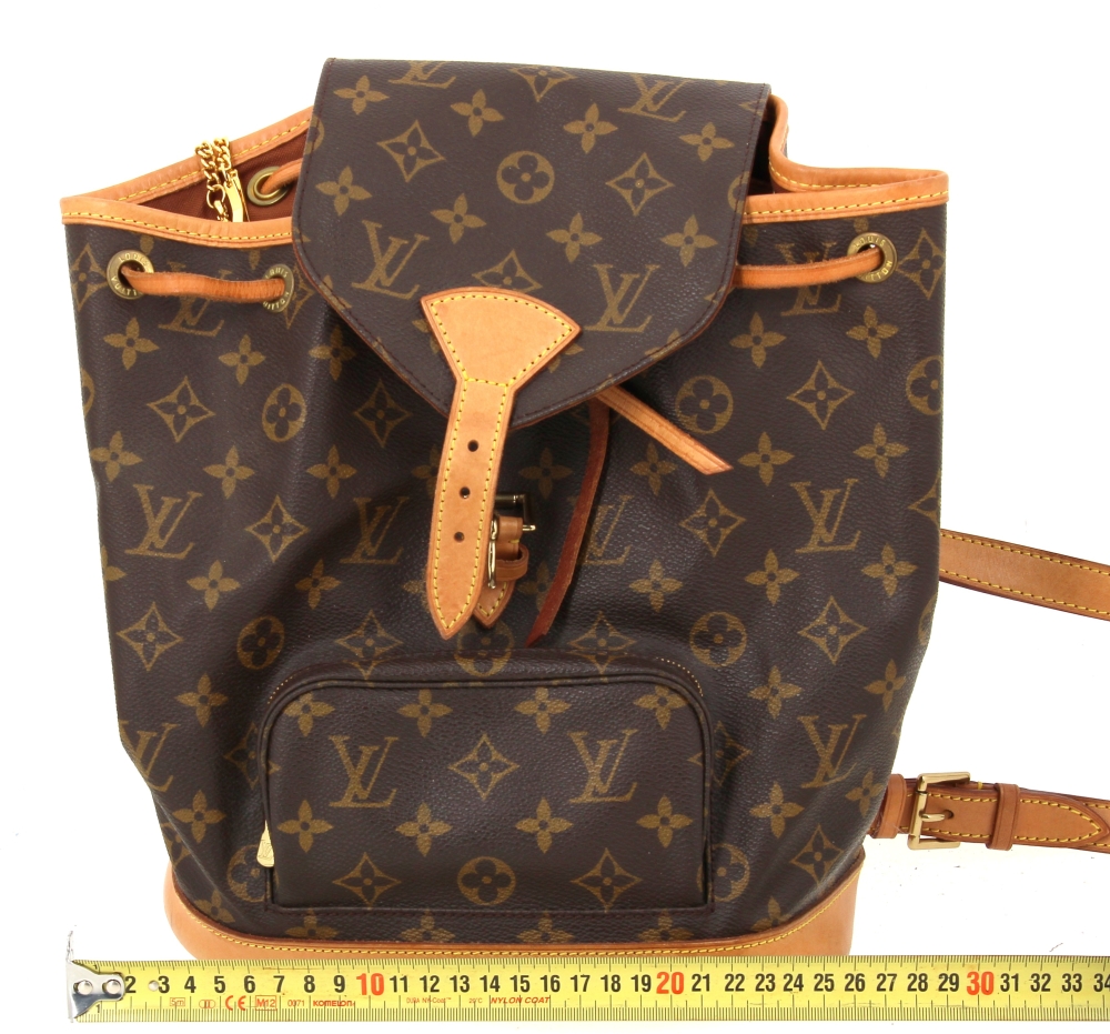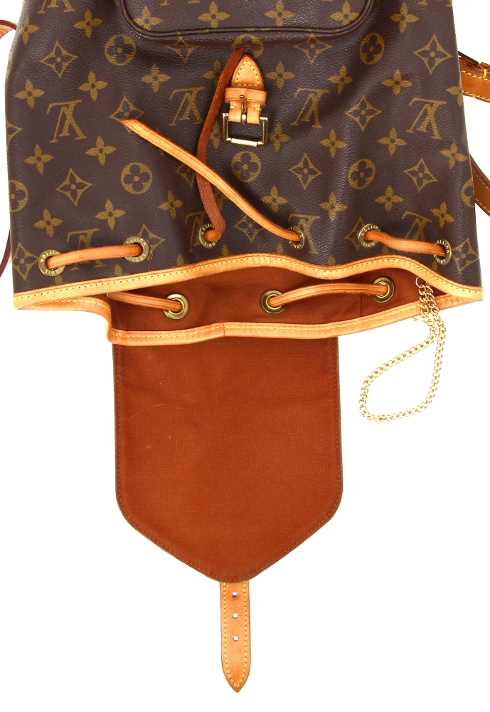 LOUIS VUITTON – Sac à dos Montsouris en toile monogrammée et cuir naturel, fermeture lien de serrage, une poche devant zippée, double sangle à dos réglable. H 30 x L 25 cm environ. Bon état général, petites usures d’usage (attestation de conformité authentifier.com)