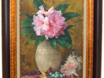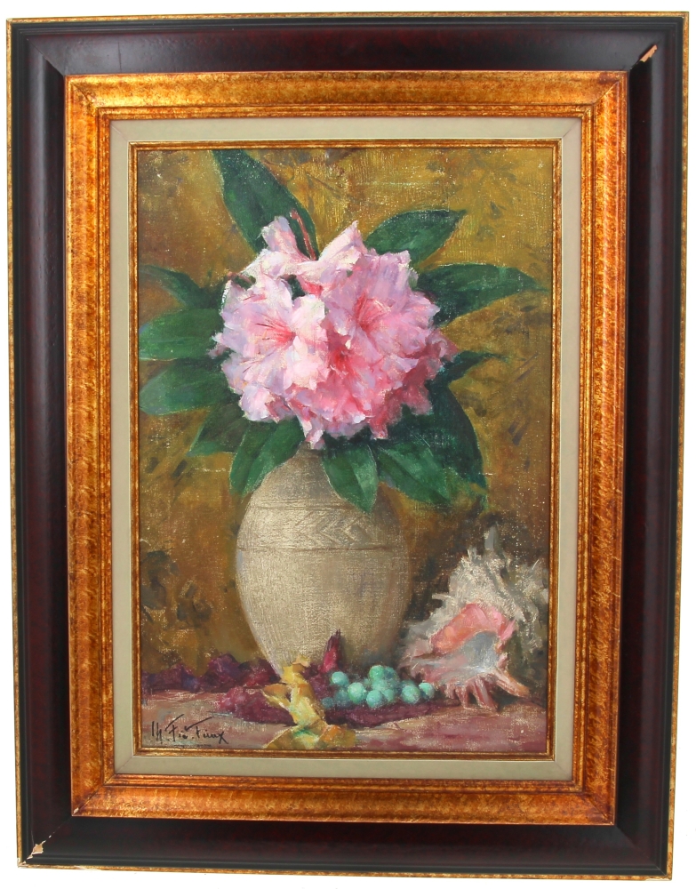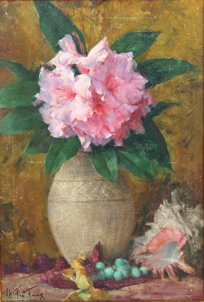 Madeleine FIE-FIEUX (1897-1955) « Bouquet de rhododendrons et coquillage », huile sur toile, signée bas gauche, 55 x 38 cm (rentoilée)