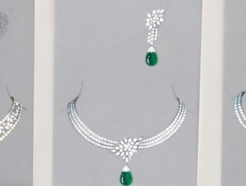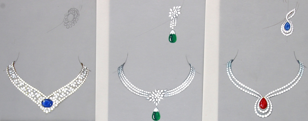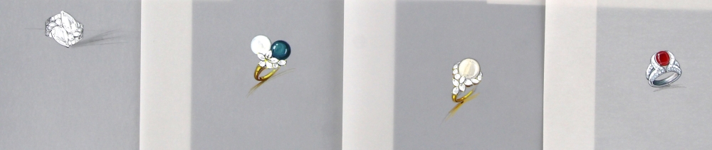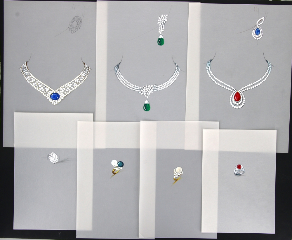Maison BOUCHERON (non marqués) – Ensemble de 9 dessins préparatoires sur papier calque rehaussés à la gouache