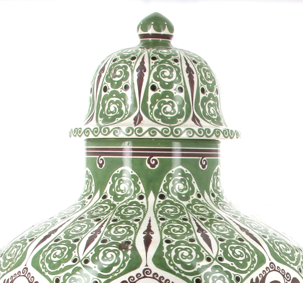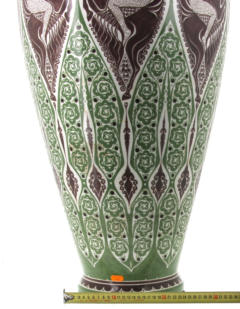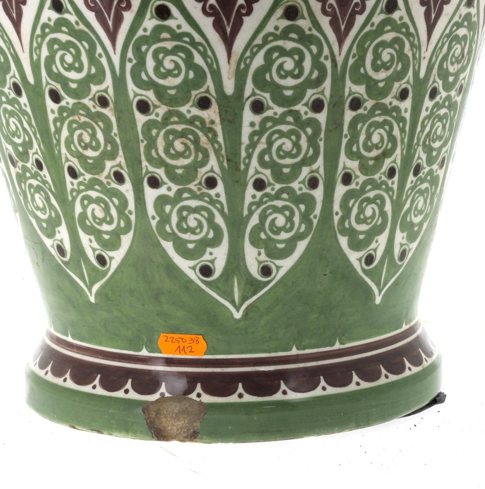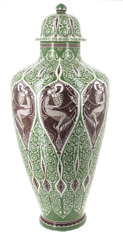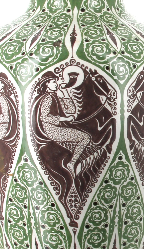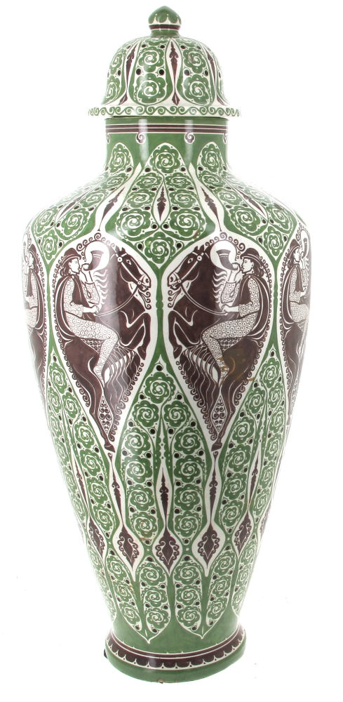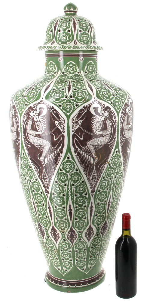 Manufacture de Distel – Amsterdam – Importante potiche en faïence polychrome à décor d’une frise de cavaliers noirs sonnant le cor et motifs floraux stylisés verts dans le style ART DECO, marque sous la pièce « Distel ». H 100 cm (éclat à la base et petit éclat à l’intérieur du couvercle)