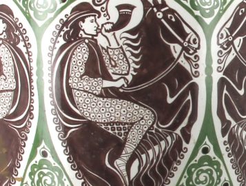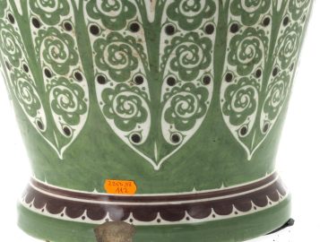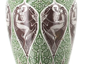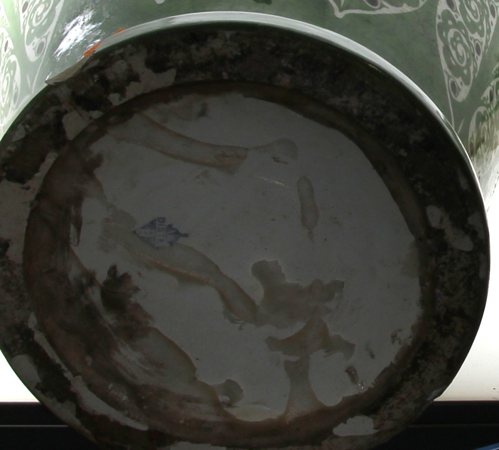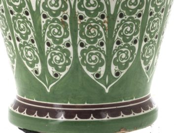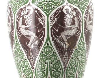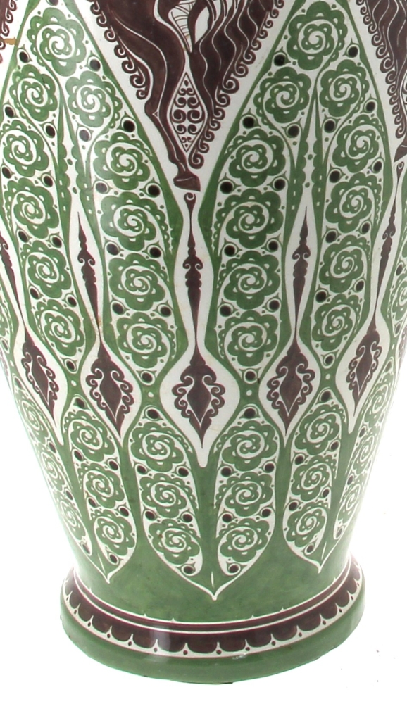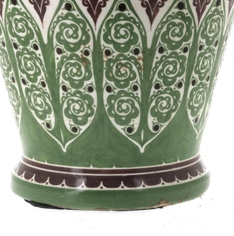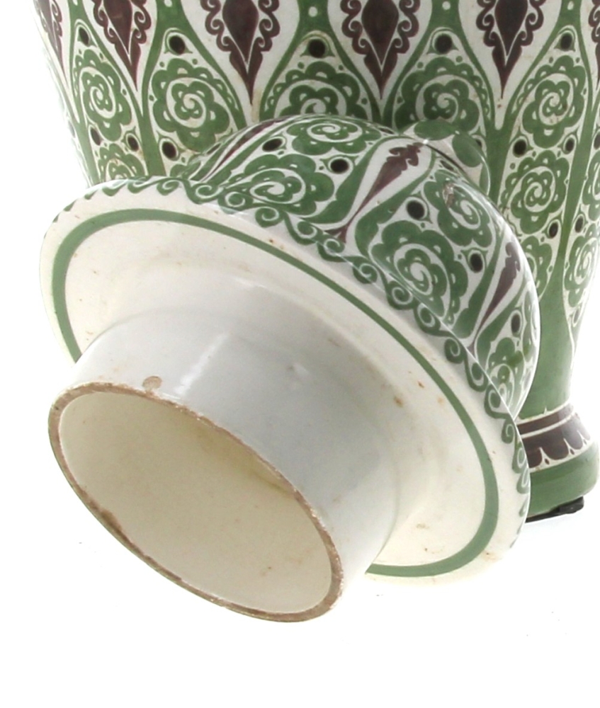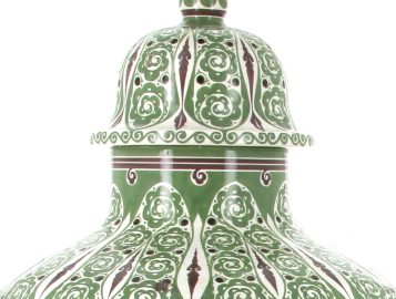 Manufacture de Distel – Amsterdam – Importante potiche en faïence polychrome à décor d’une frise de cavaliers noirs sonnant le cor et motifs floraux stylisés verts dans le style ART DECO, marque sous la pièce « Distel ». H 100 cm (éclat à la base et petit éclat à l’intérieur du couvercle)