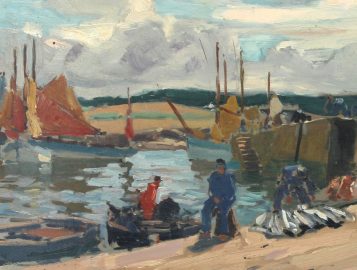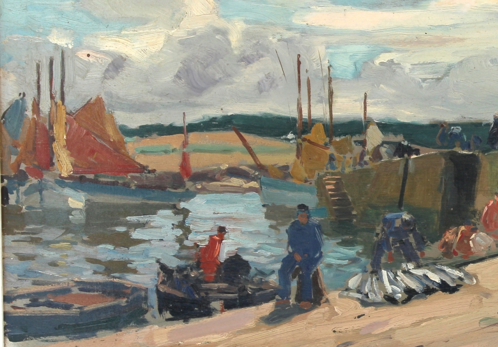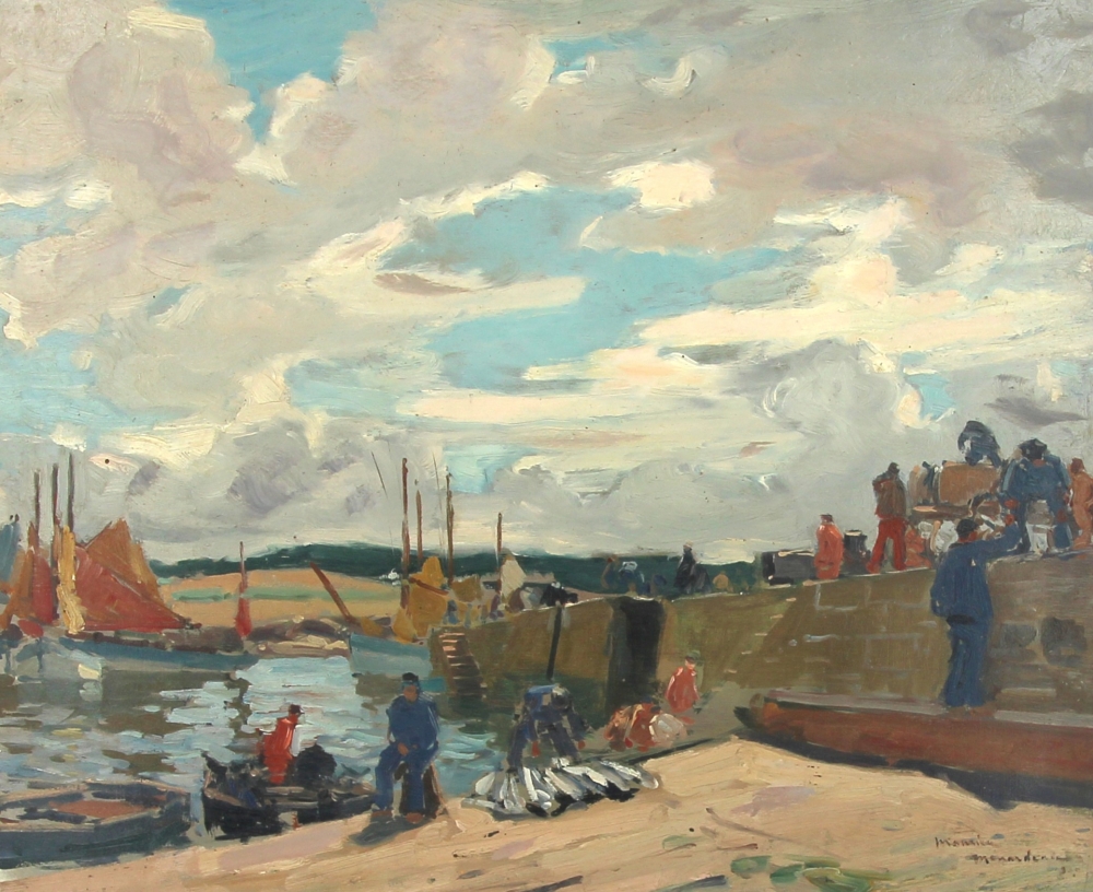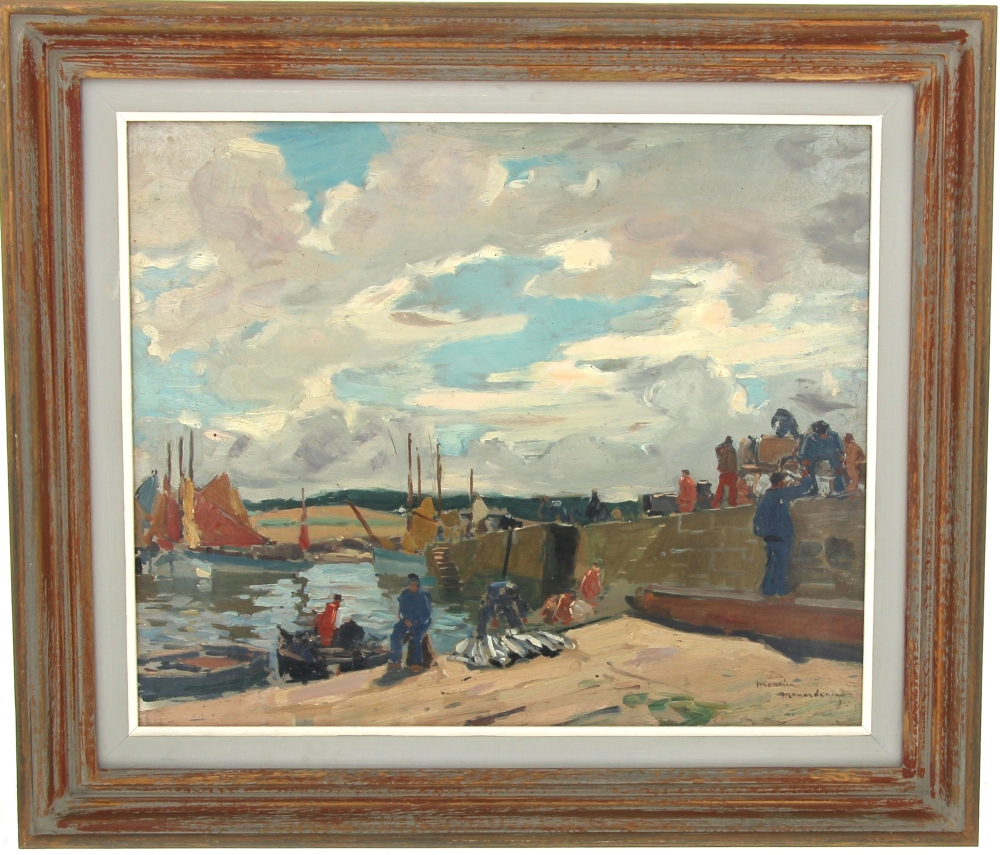 Maurice MENARDEAU (1897-1977) « Marins sur les quais, Finistère », huile sur panneau, signée bas droite, 38 x 46 cm