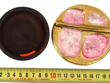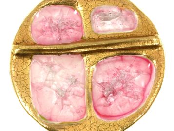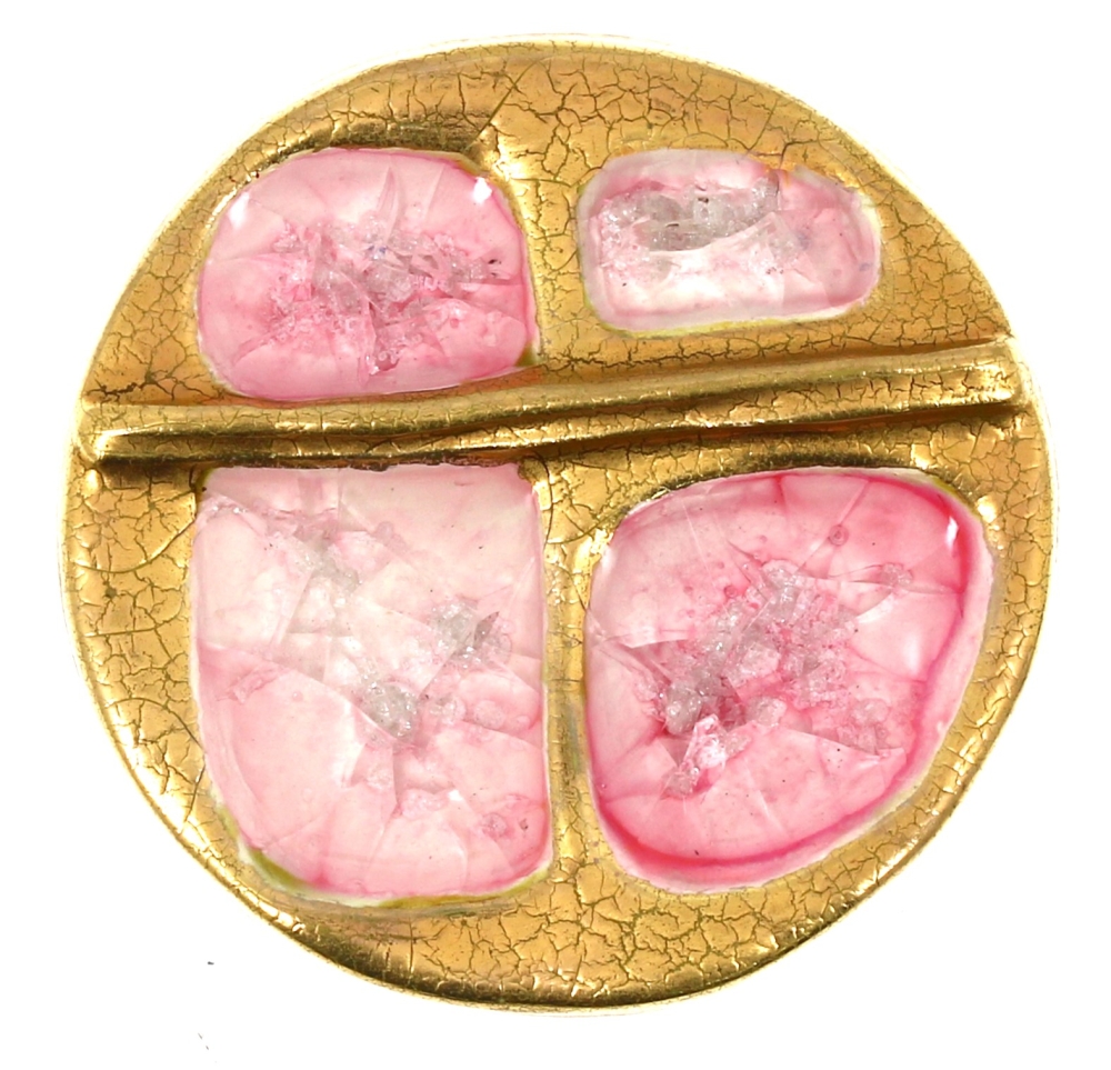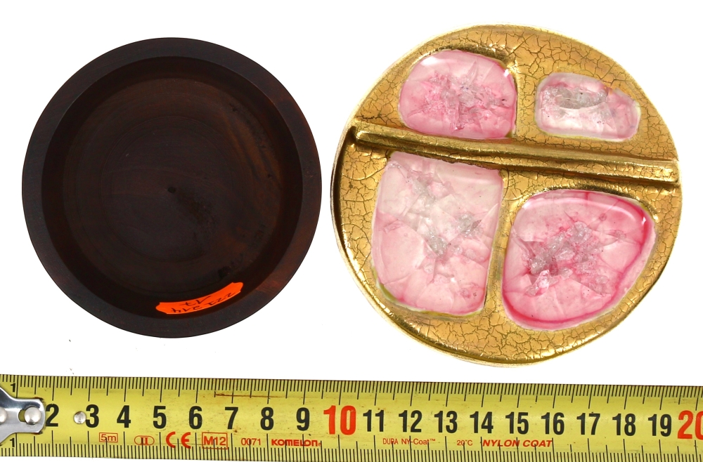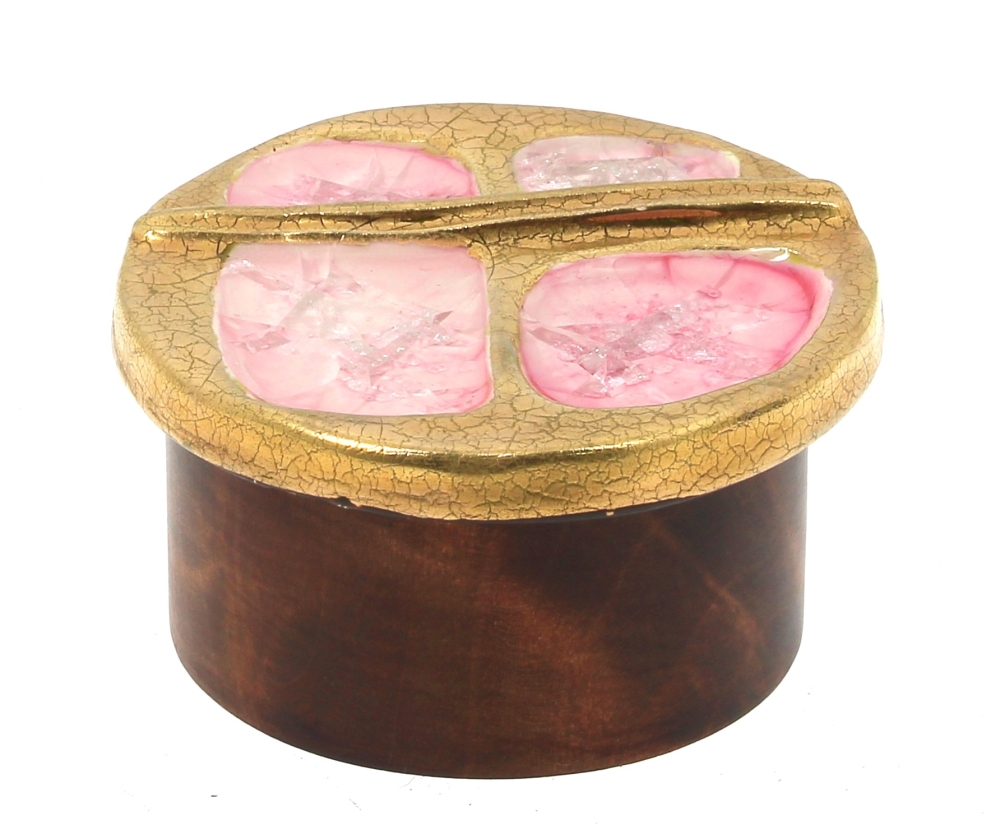 Mithé ESPELT (1923-2020) – Boîte cylindrique en bois à couvercle en céramique émaillée rose et or. H 5,5 x diam. 9,8 cm env.