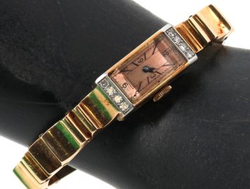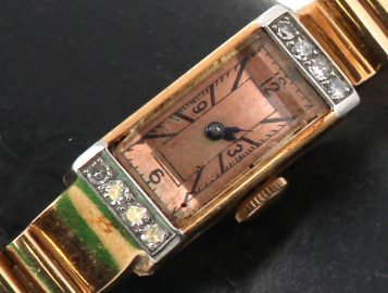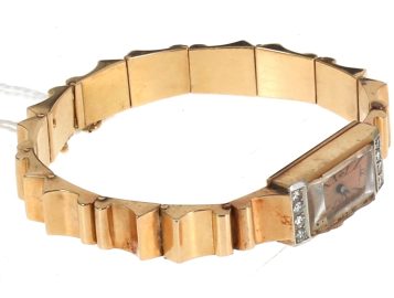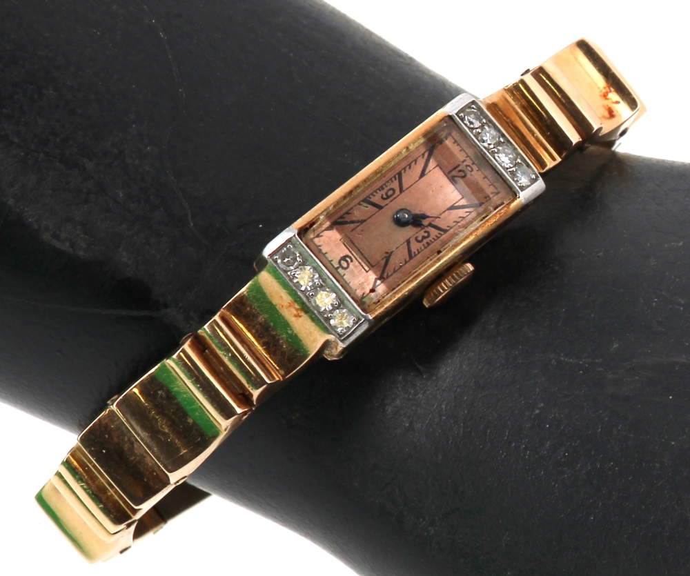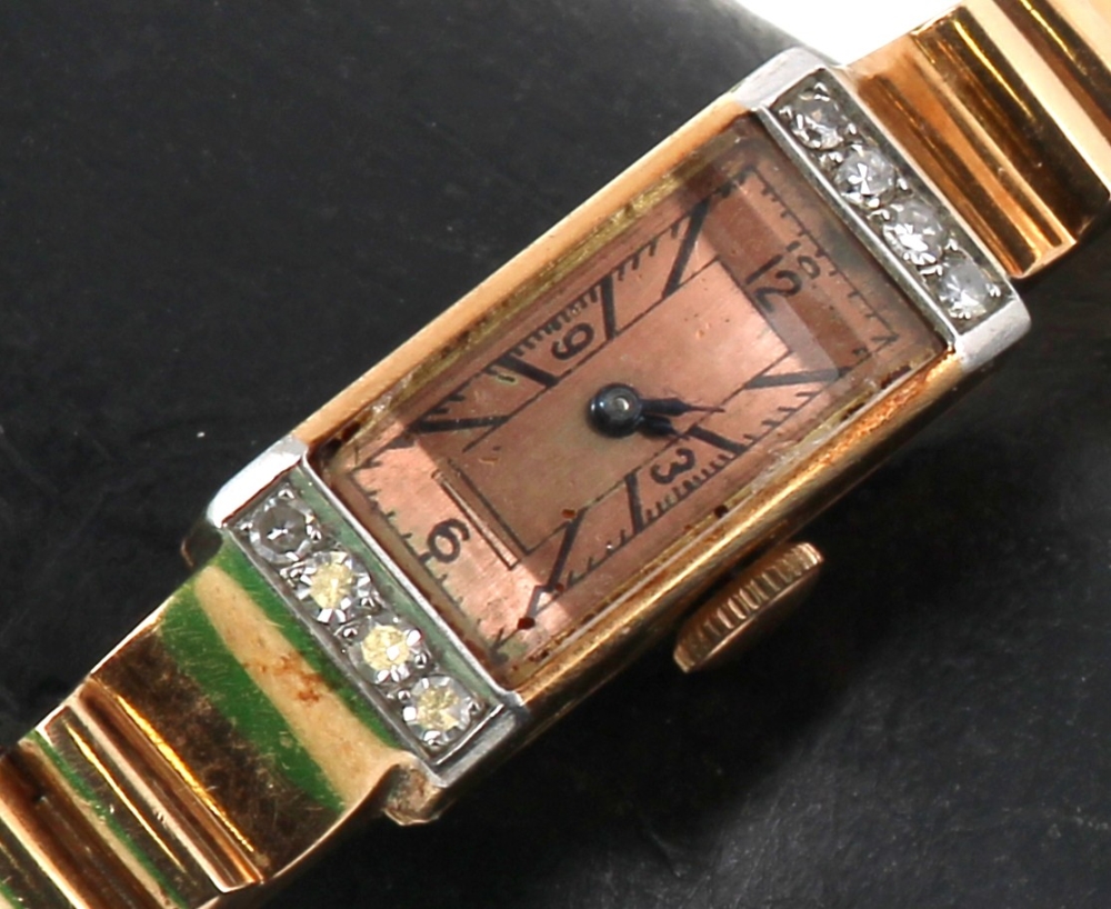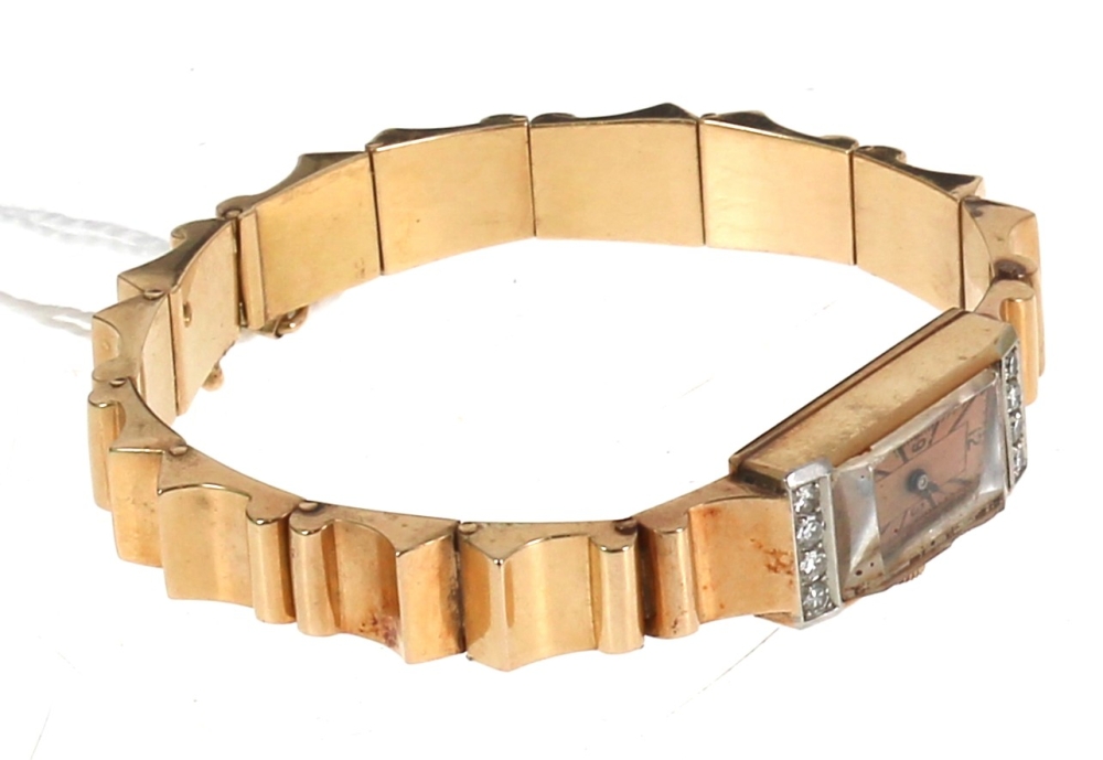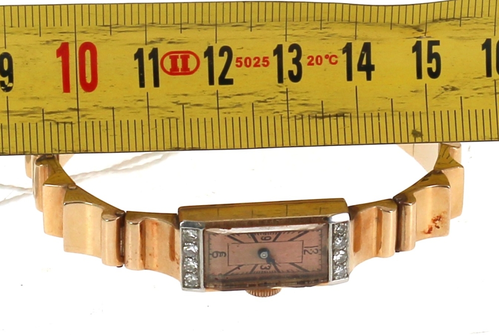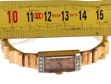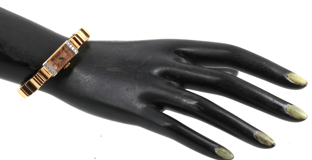 Montre bracelet de dame style Tank en or jaune et platine, poinçons tête d’aigle et tête de chien, cadran agrémenté de 8 diamants. Poids brut 37,40 grs (conservé en banque)