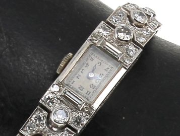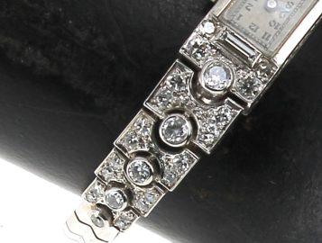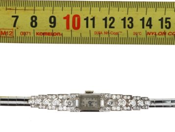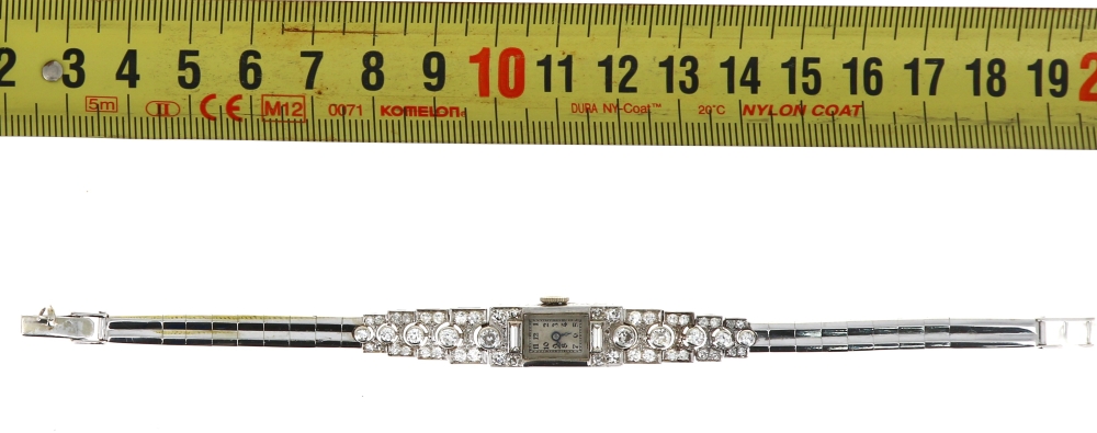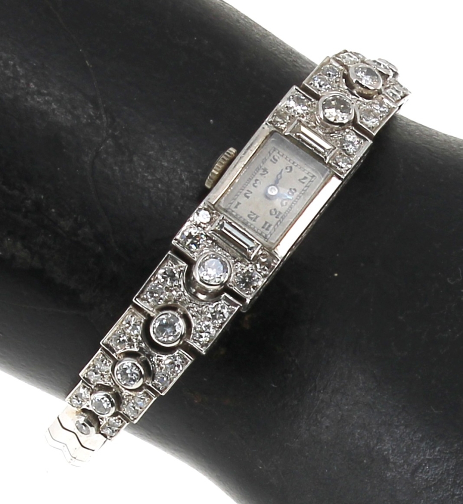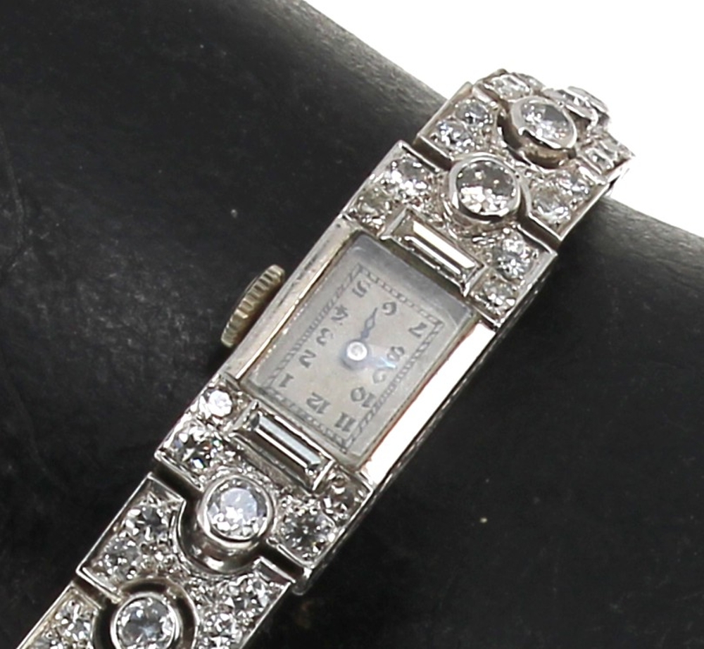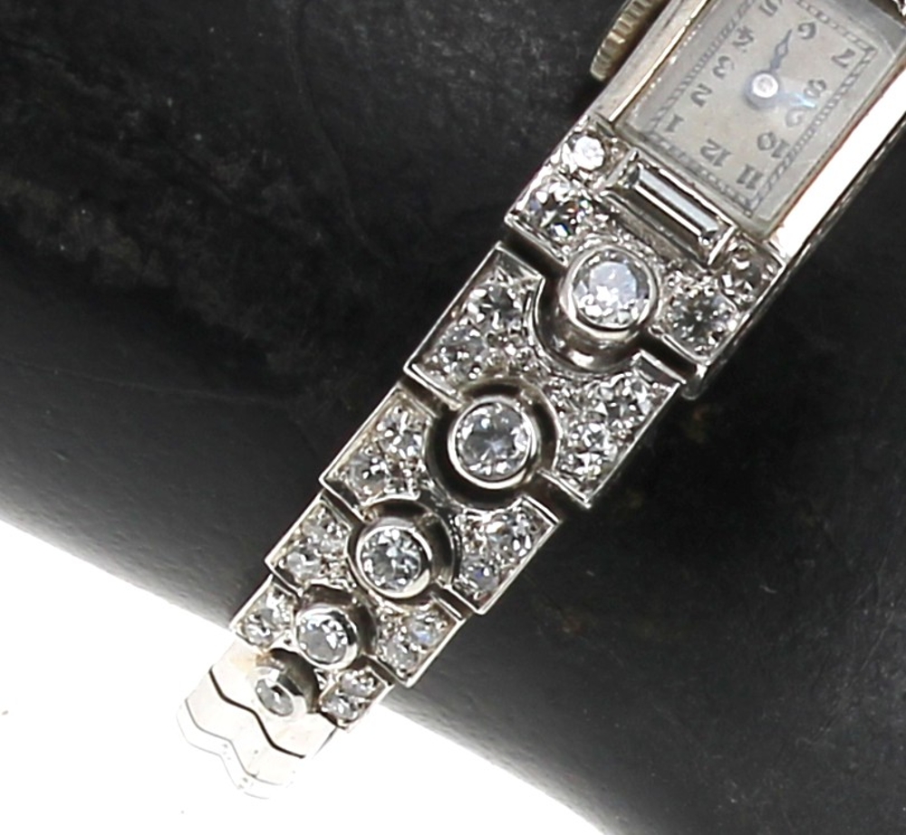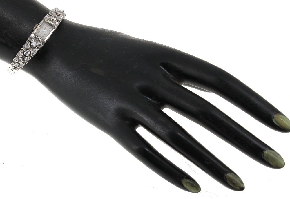 Montre de dame ART DECO en or gris, platine et diamants, poinçon tête d’aigle et tête de chien. Poids brut 27,40 grs (à réviser, mouvement non foncitonnel)