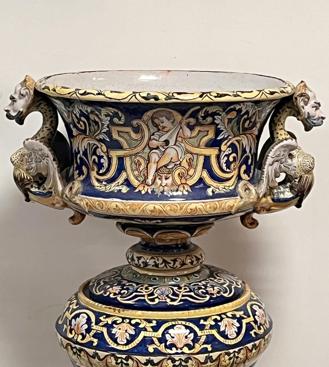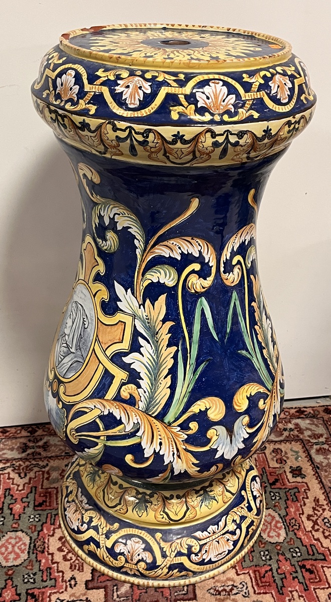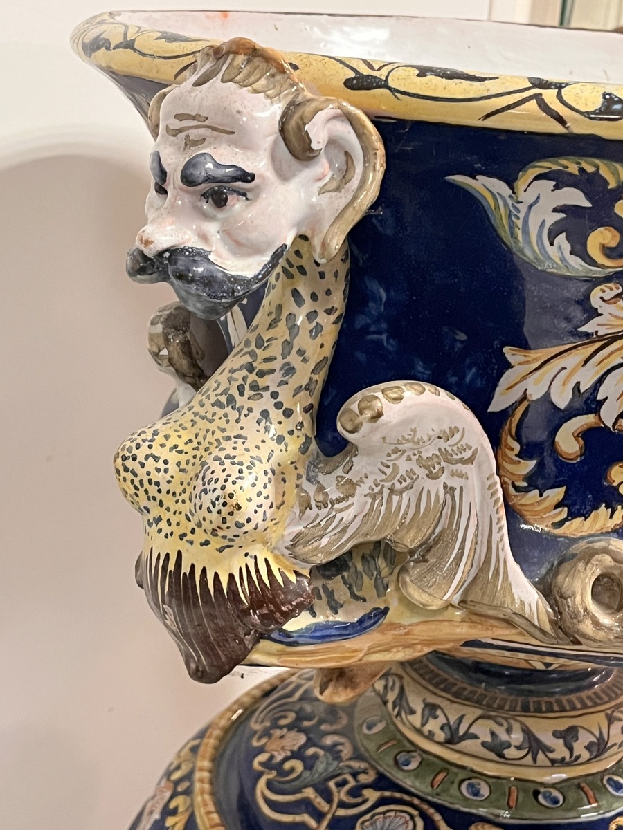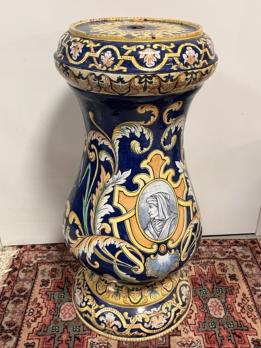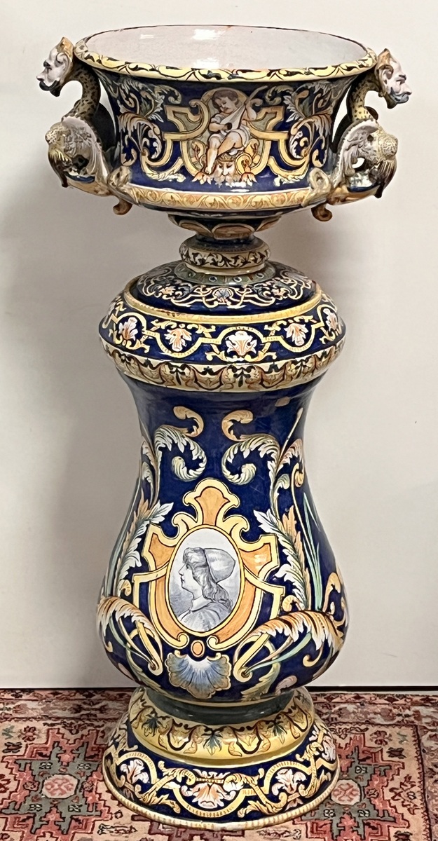 NEVERS Manufacture Antoine MONTAGNON 1838-1899) – Cache-pot sur son piédestal en faïence polychrome à décor de putto musiciens, chimères et rinceaux, de portraits en médaillon, dans le goût italo-nivernais. XIXème. Dim° du cache-pot H 35,5 x diam. 41 cm env. ; hteur du piédestal 77 cm (2 éclats sur le plateau du piédestal)