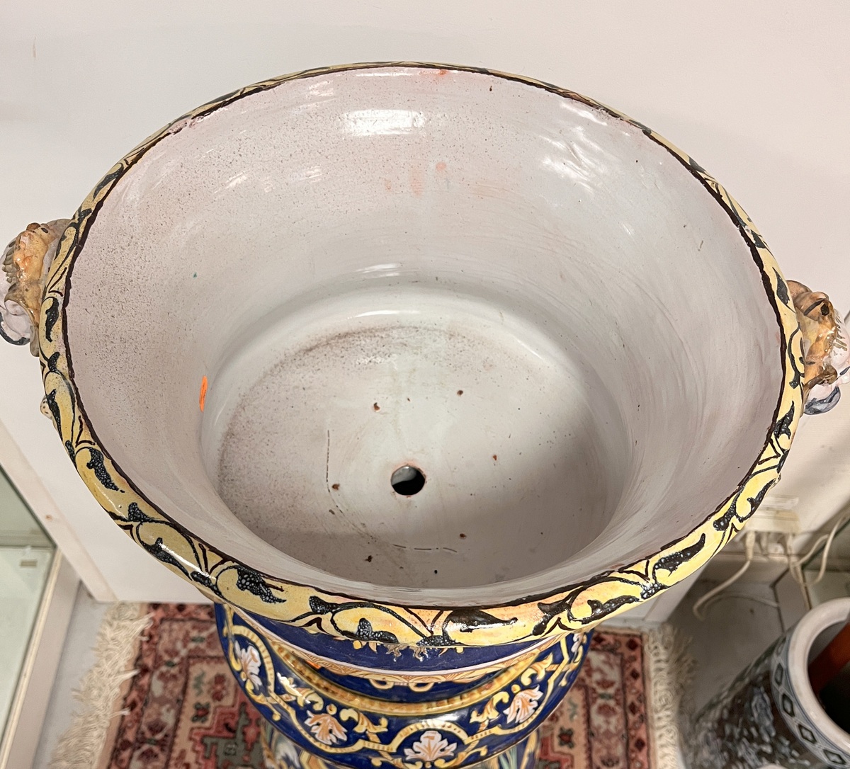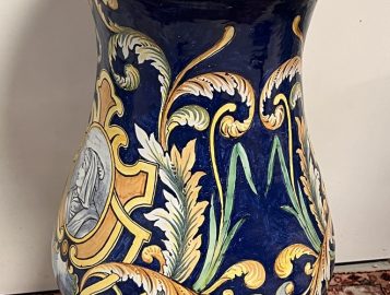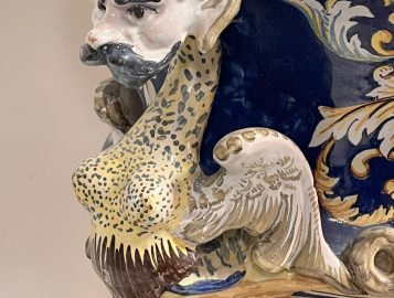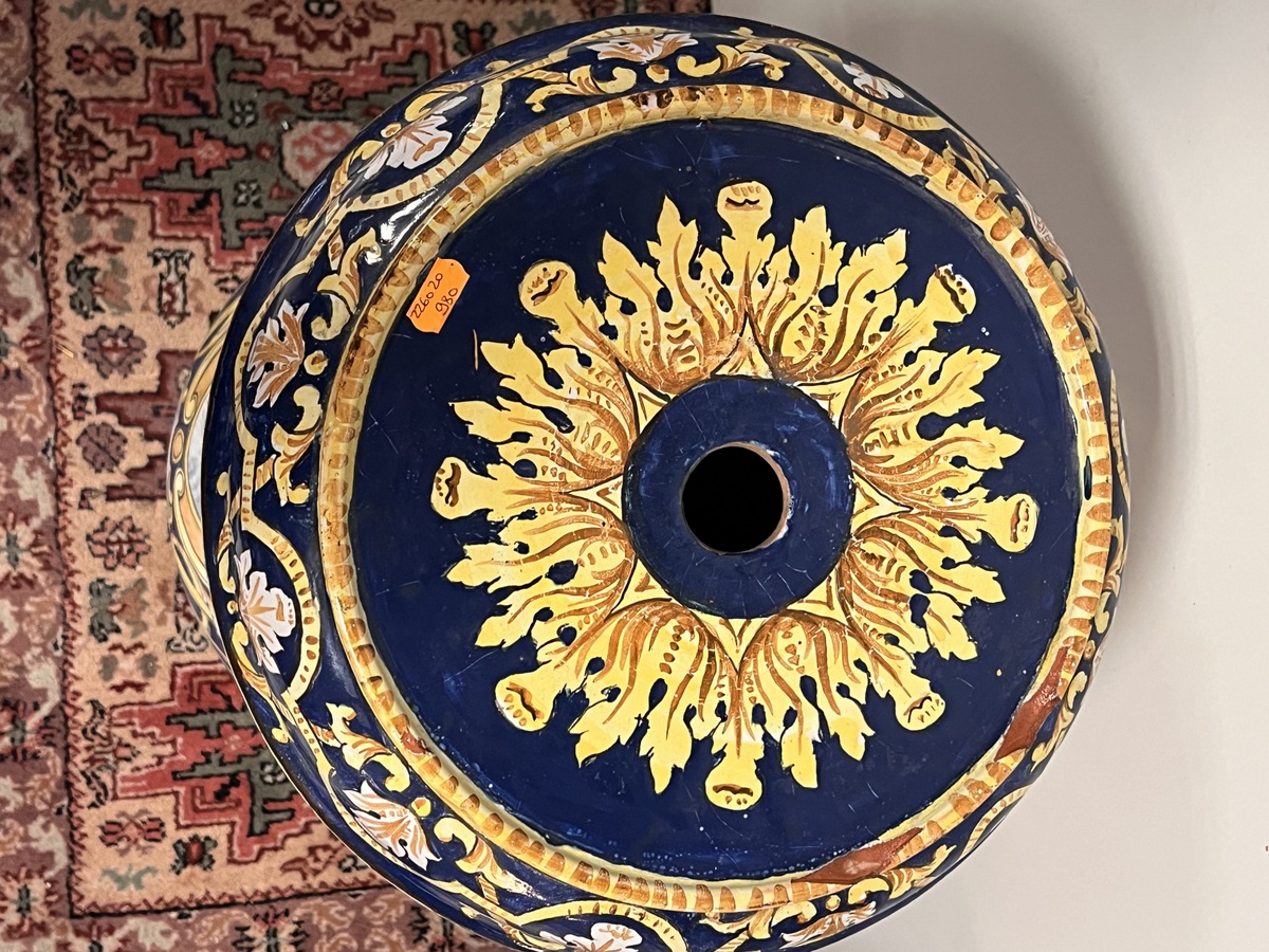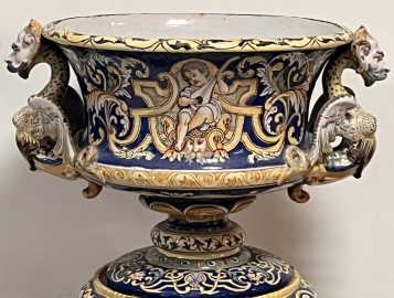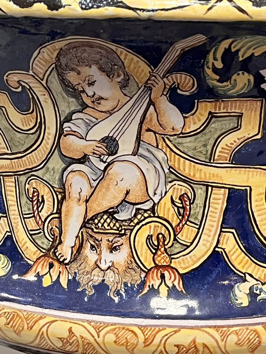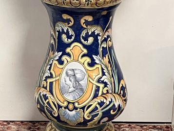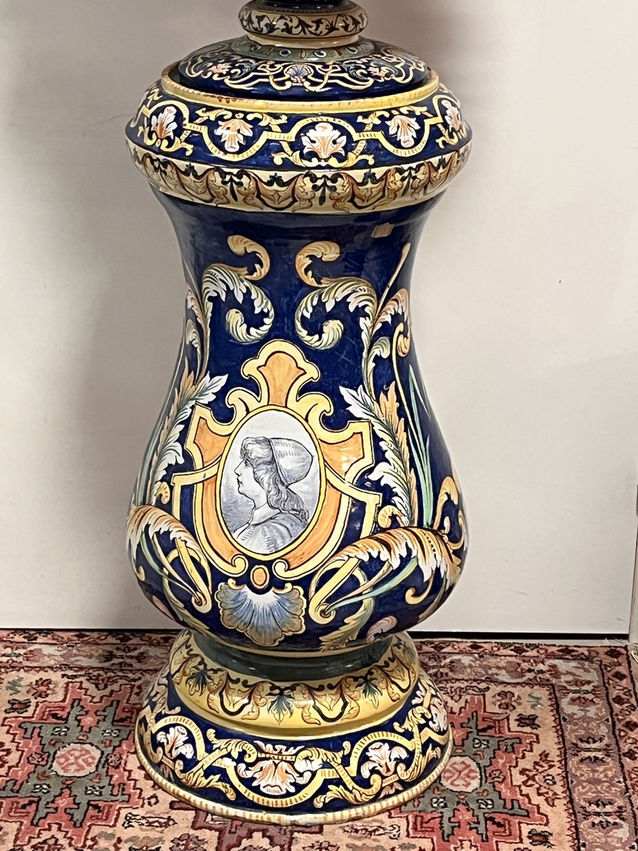 NEVERS Manufacture Antoine MONTAGNON 1838-1899) – Cache-pot sur son piédestal en faïence polychrome à décor de putto musiciens, chimères et rinceaux, de portraits en médaillon, dans le goût italo-nivernais. XIXème. Dim° du cache-pot H 35,5 x diam. 41 cm env. ; hteur du piédestal 77 cm (2 éclats sur le plateau du piédestal)