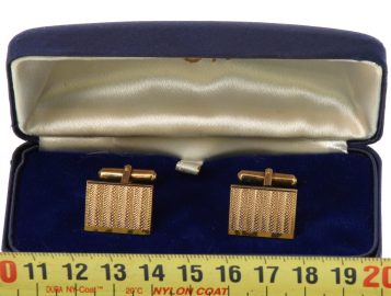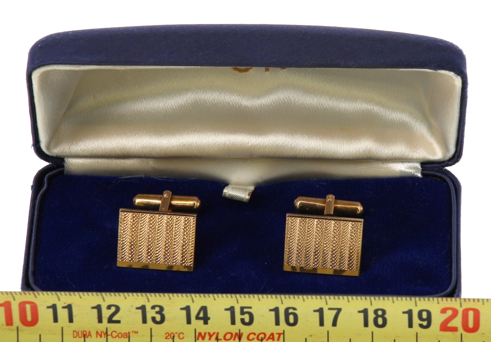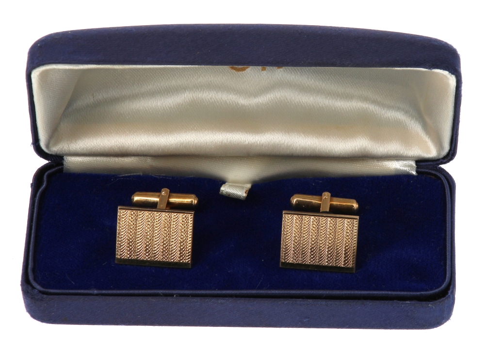 Paire de boutons de manchette en or jaune 18 cts, poinçon tête d’aigle, poids 8,40 grs, en écrin d’origine (non exposé – conservé en banque)