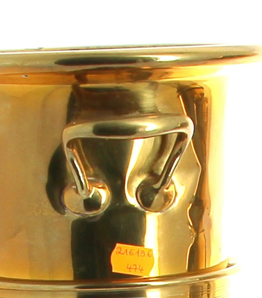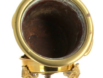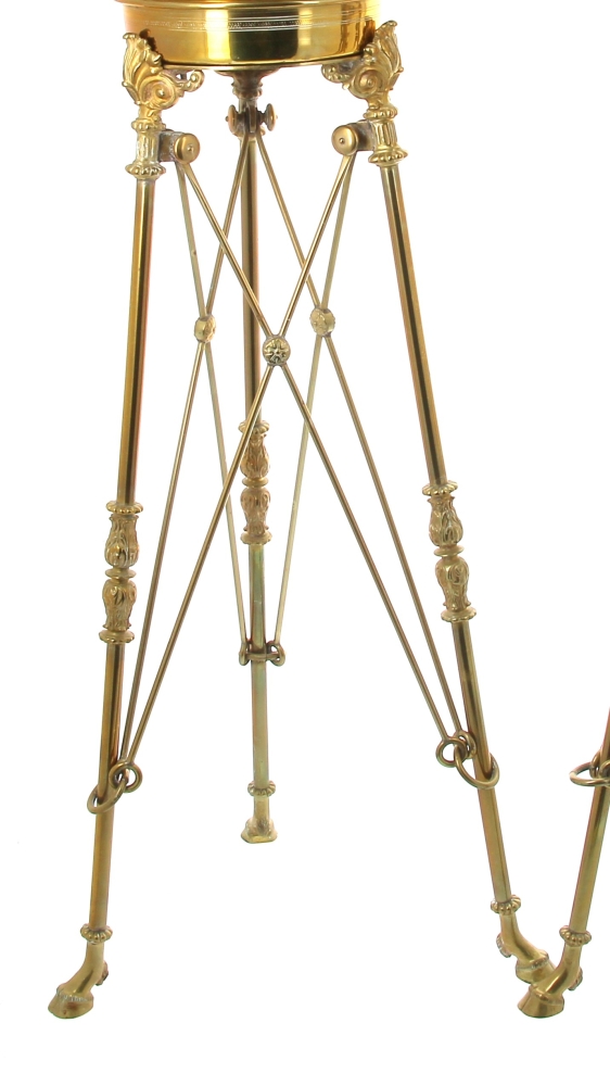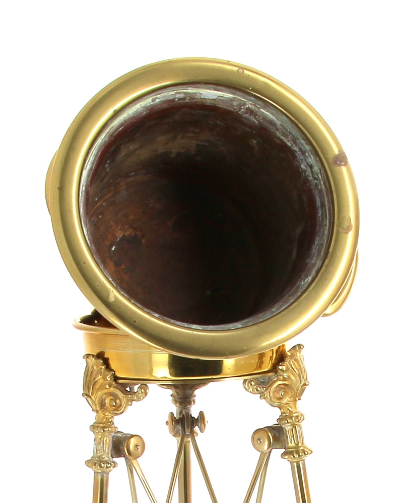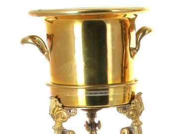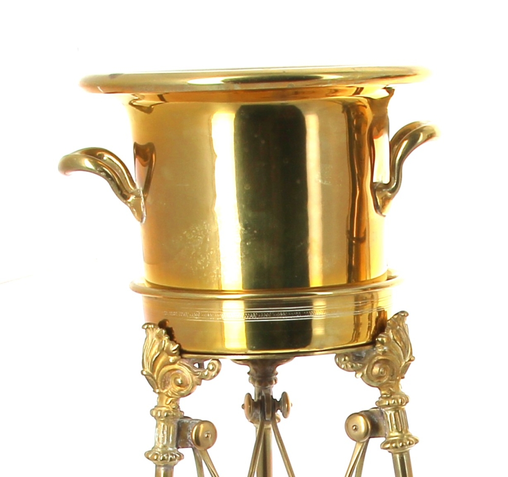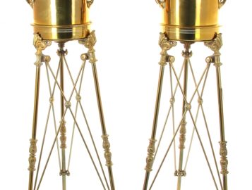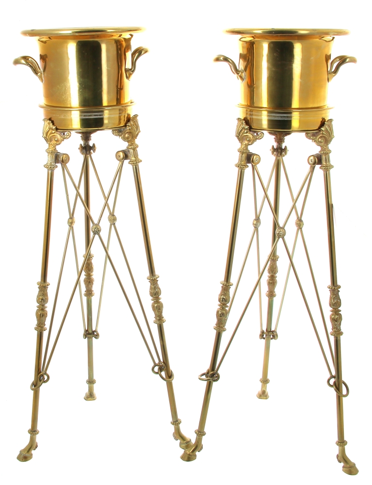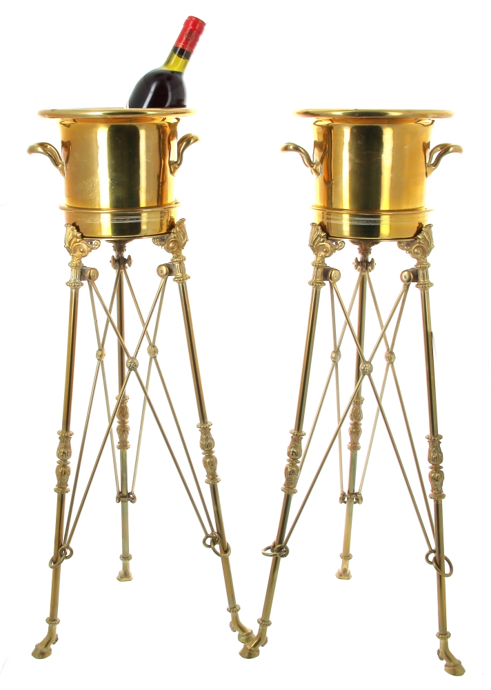 Paire de seaux à champagne reposant sur une base tripode en forme d’athénienne, à décor de feuilles d’acanthe et piètement sabot. H 78 cm (qqs bosselages au niveau d’une anse sur un seau)