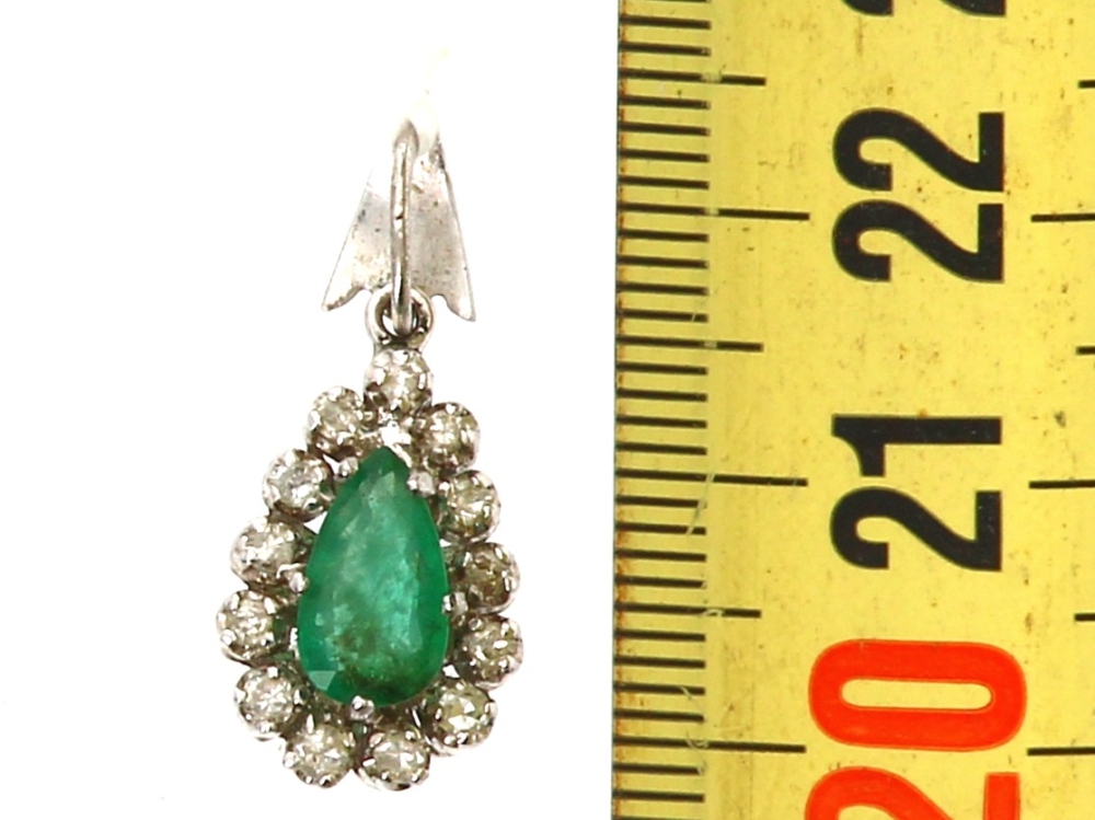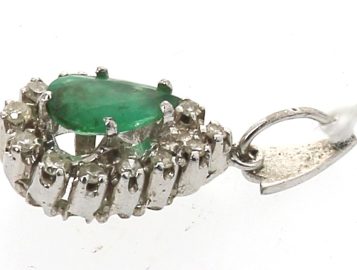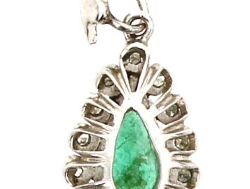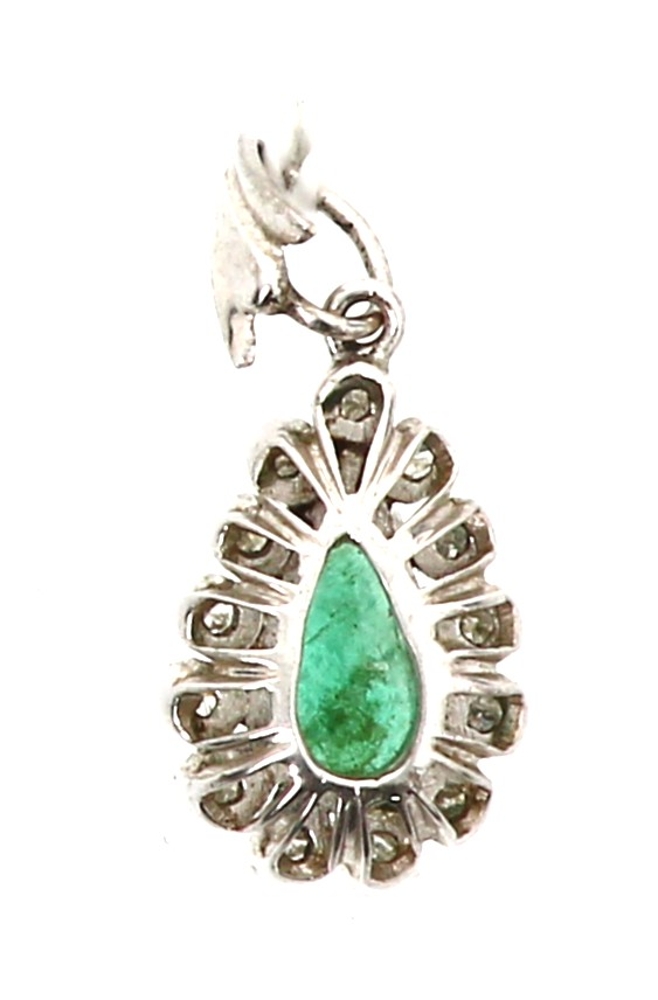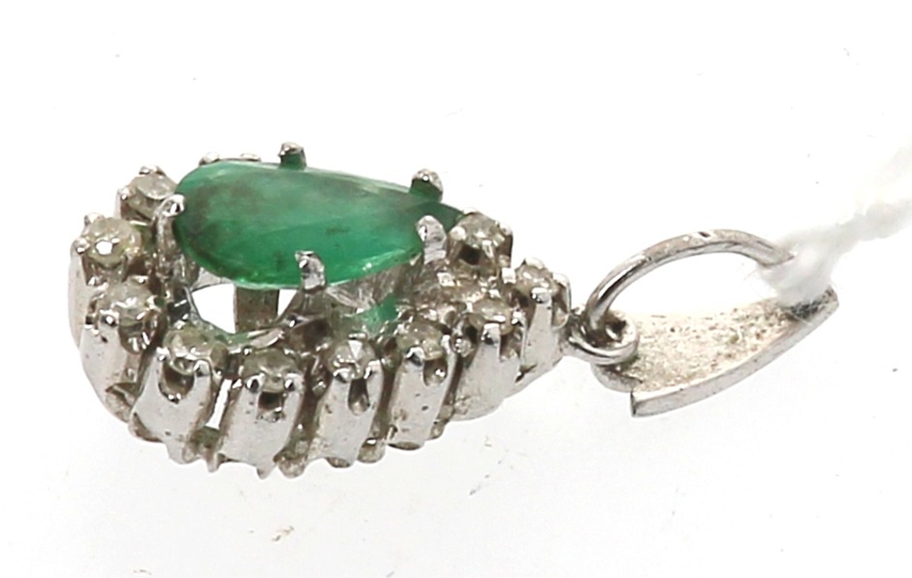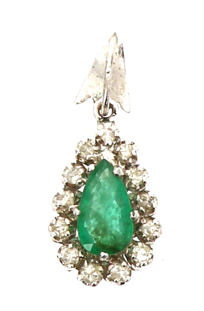 Pendentif en or gris serti d’une émeraude poire (9 x 5 mm) entourée de 12 diamants, poids brut 3,40 grs. Hteur bélière comprise 2,6 cm env.