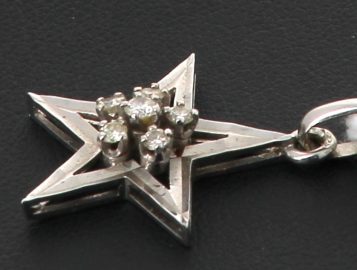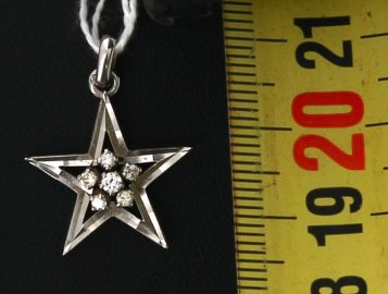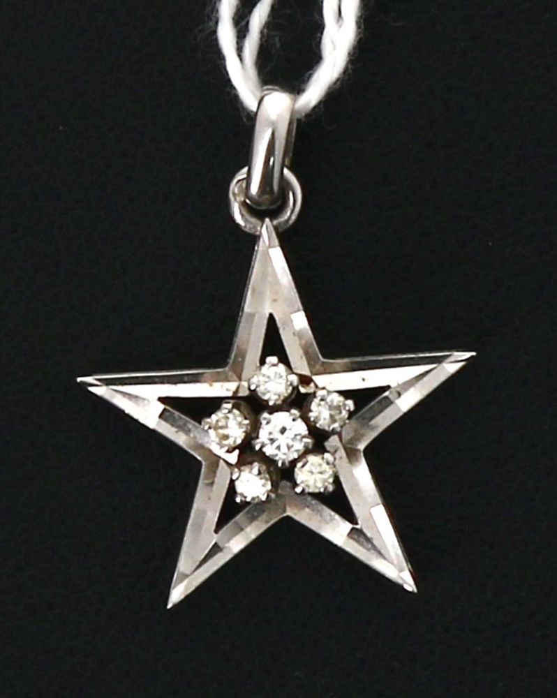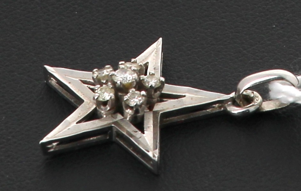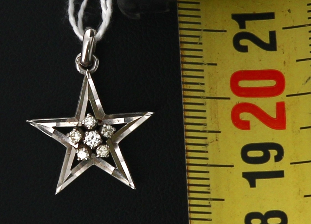 Pendentif étoile en or gris 18 cts, poinçon tête d’aigle, serti de 6 diamants, poids brut 1,80 grs. Diam. 2 cm env.