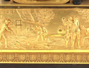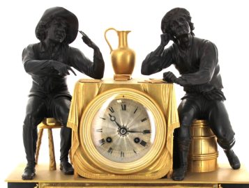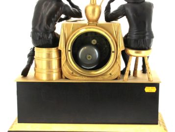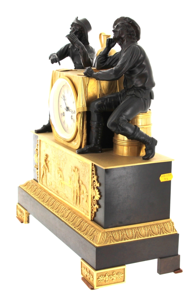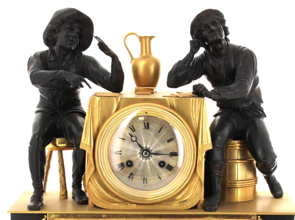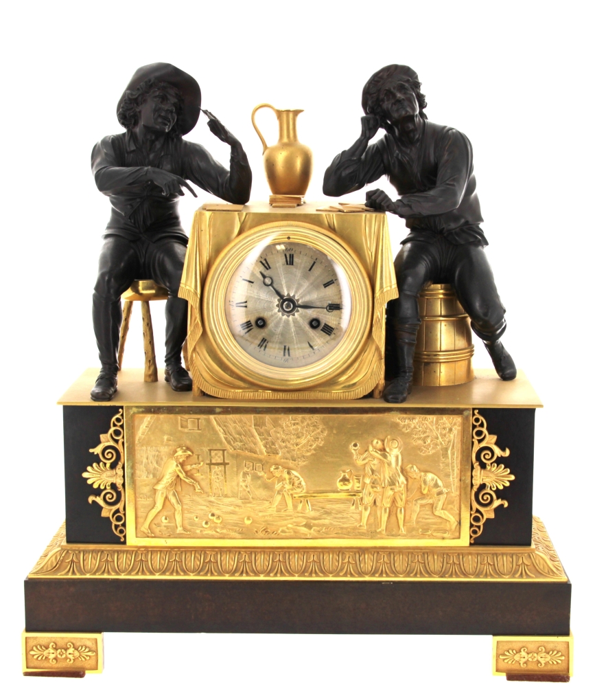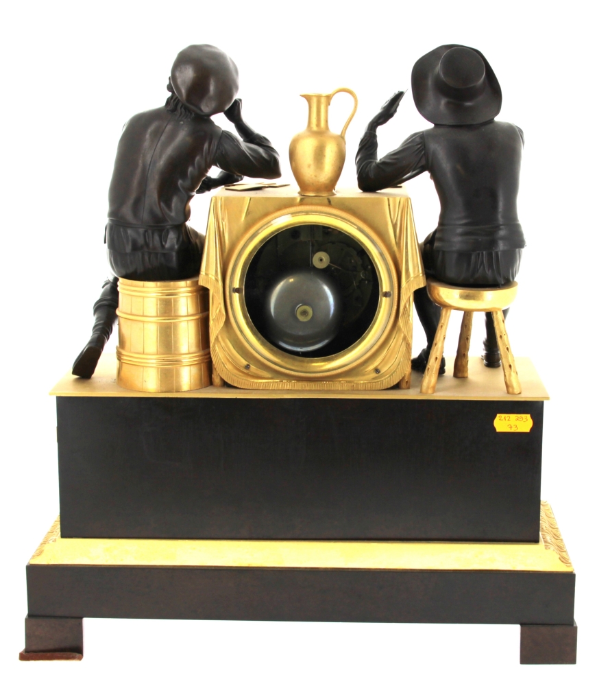 Pendule en bronze doré et bronze à patine sombre représentant une partie de cartes avec deux joueurs accoudés à une borne simulant une table et contenant le cadran. Elle repose sur une base rectangulaire ornée d’une scène de partie de boules. Mouvement à fil. Epoque XIXème. H 42,5 x L 38 x P 16 cm (pichet recollé sur la base, décollé. Mouvement à réviser non fonctionnel)