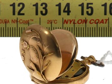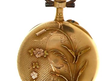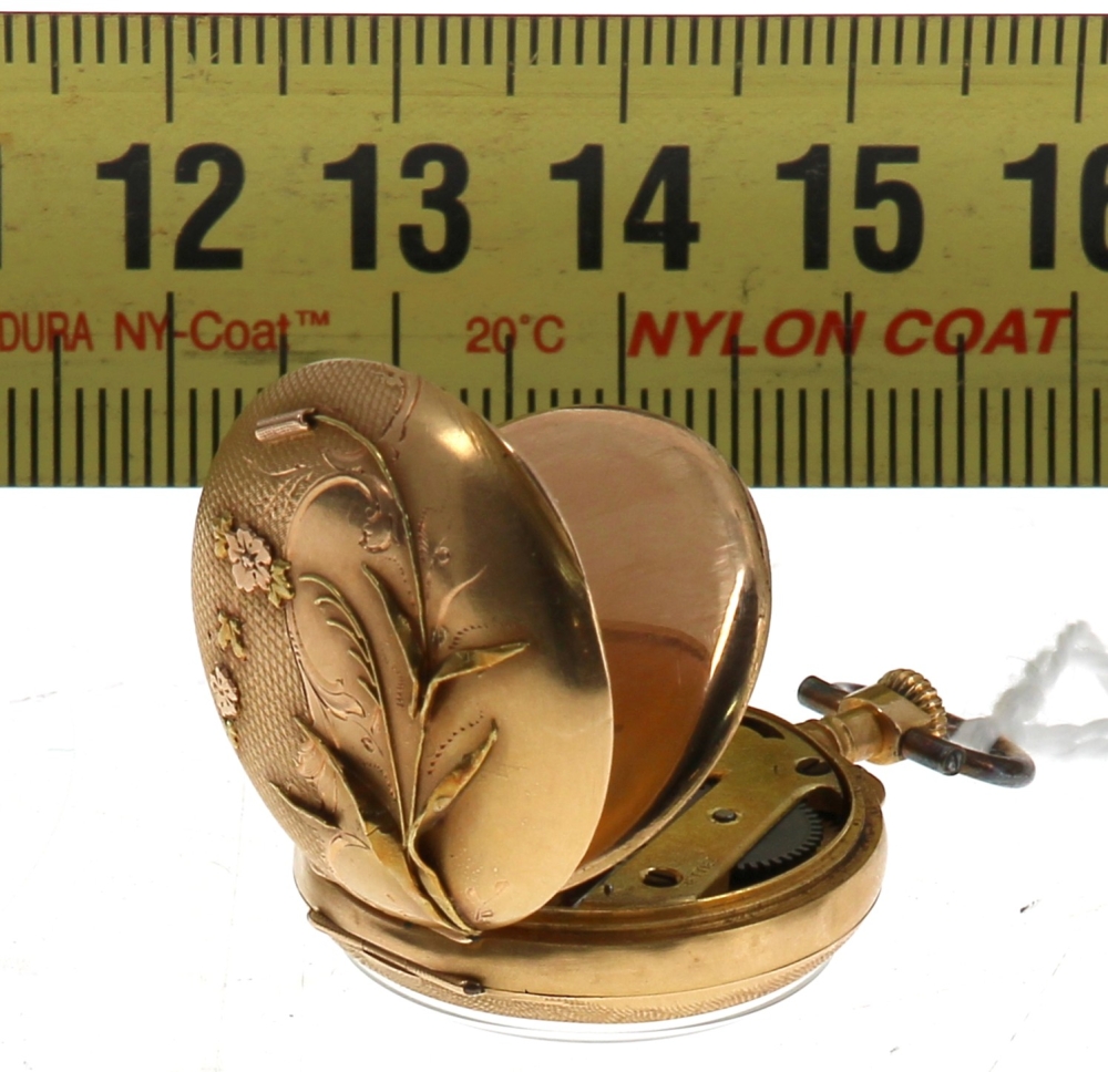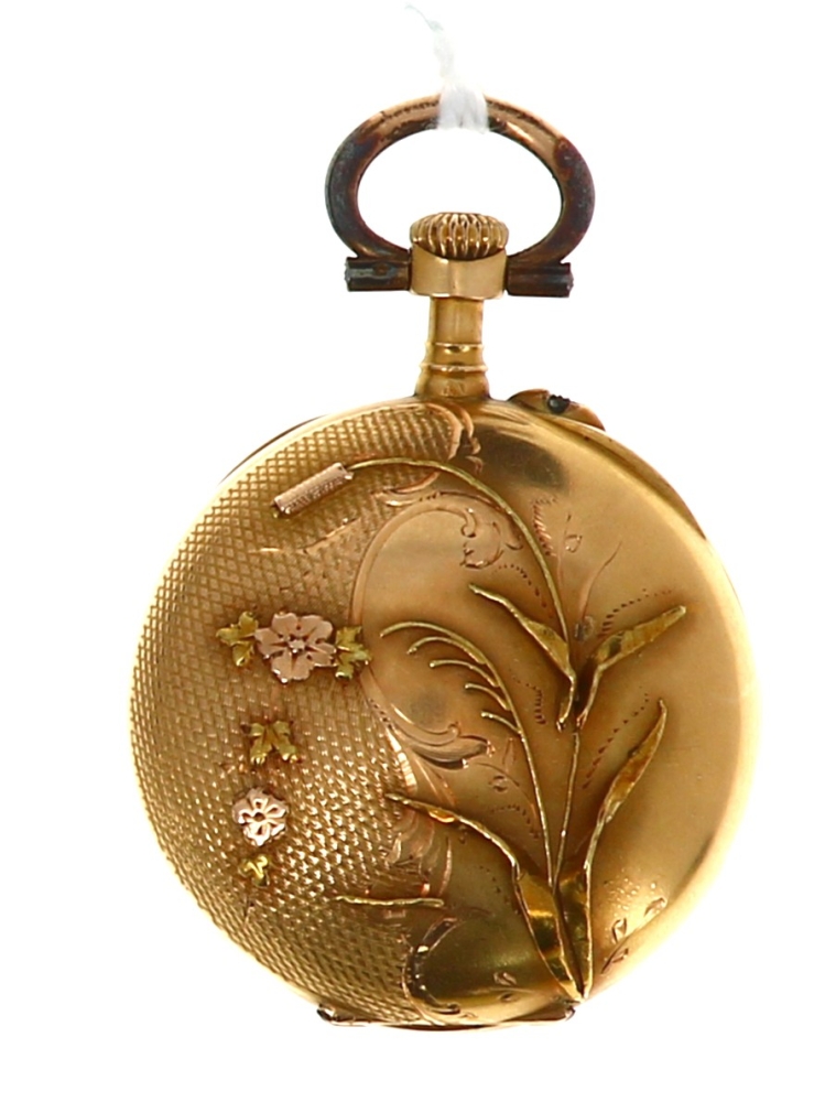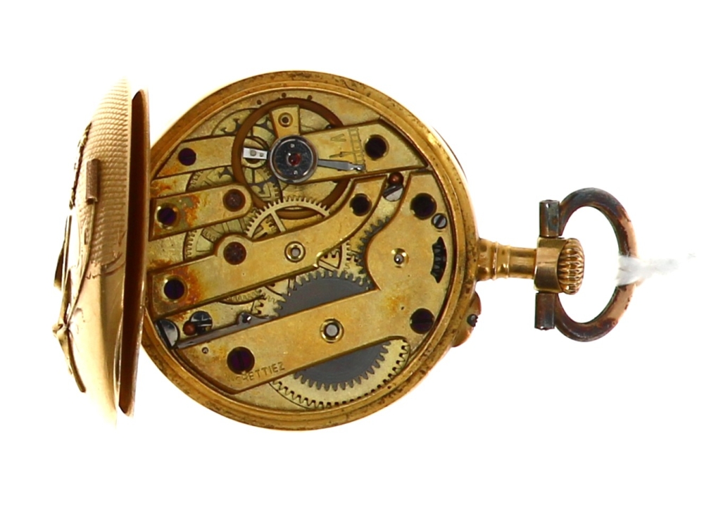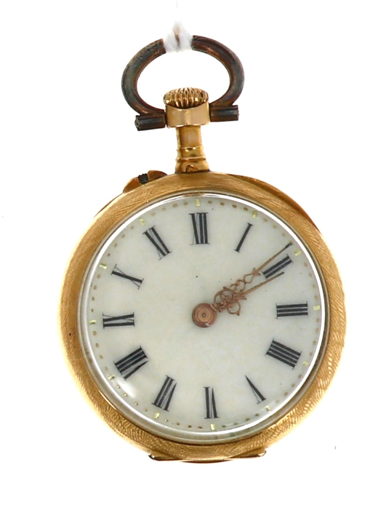 Petite montre de col en or jaune 18 cts, poinçon tête de cheval, double fond or, bélière en métal, diam. 2,5 cm. Poids brut 14,90 grs (mouvement fonctionne)