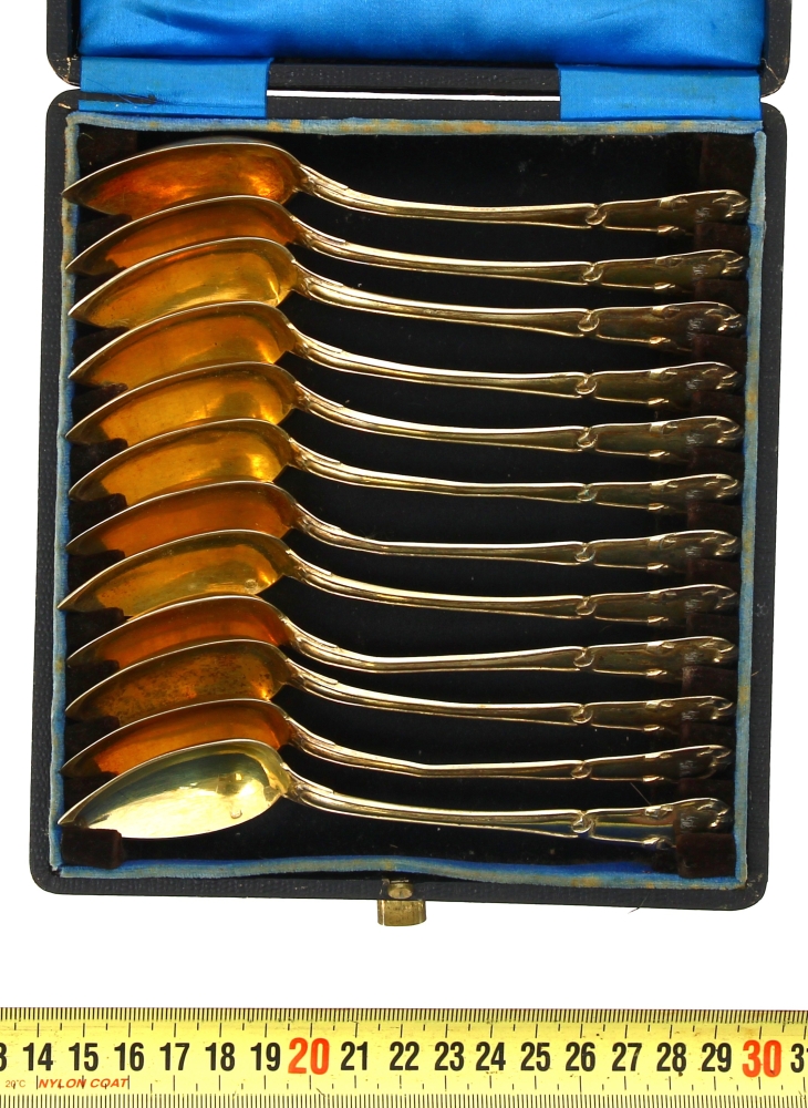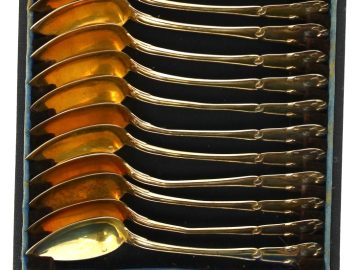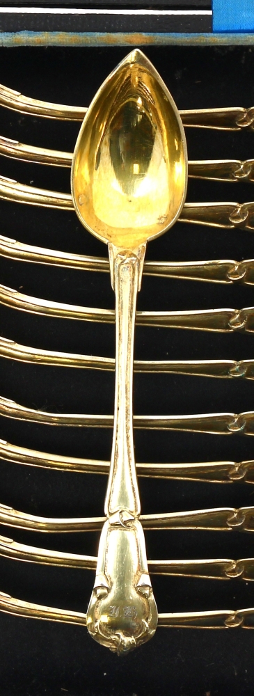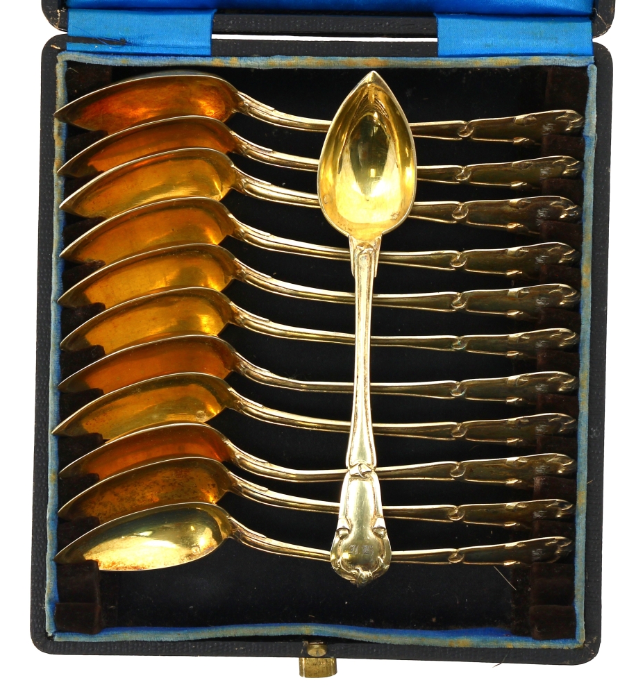 Philippe BERTHIER (Orfèvre à Paris à partir de 1847) – 12 petites cuillères XIXème en vermeil, poinçon minerve, poids 219,50 grs (en écrin d’origine)
