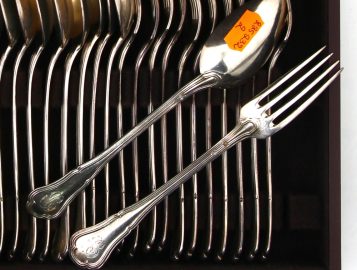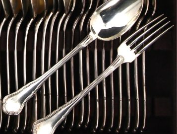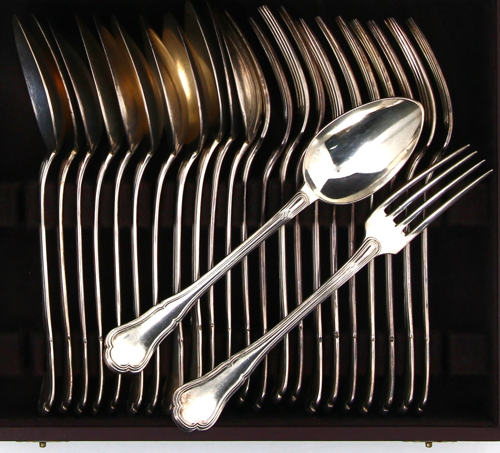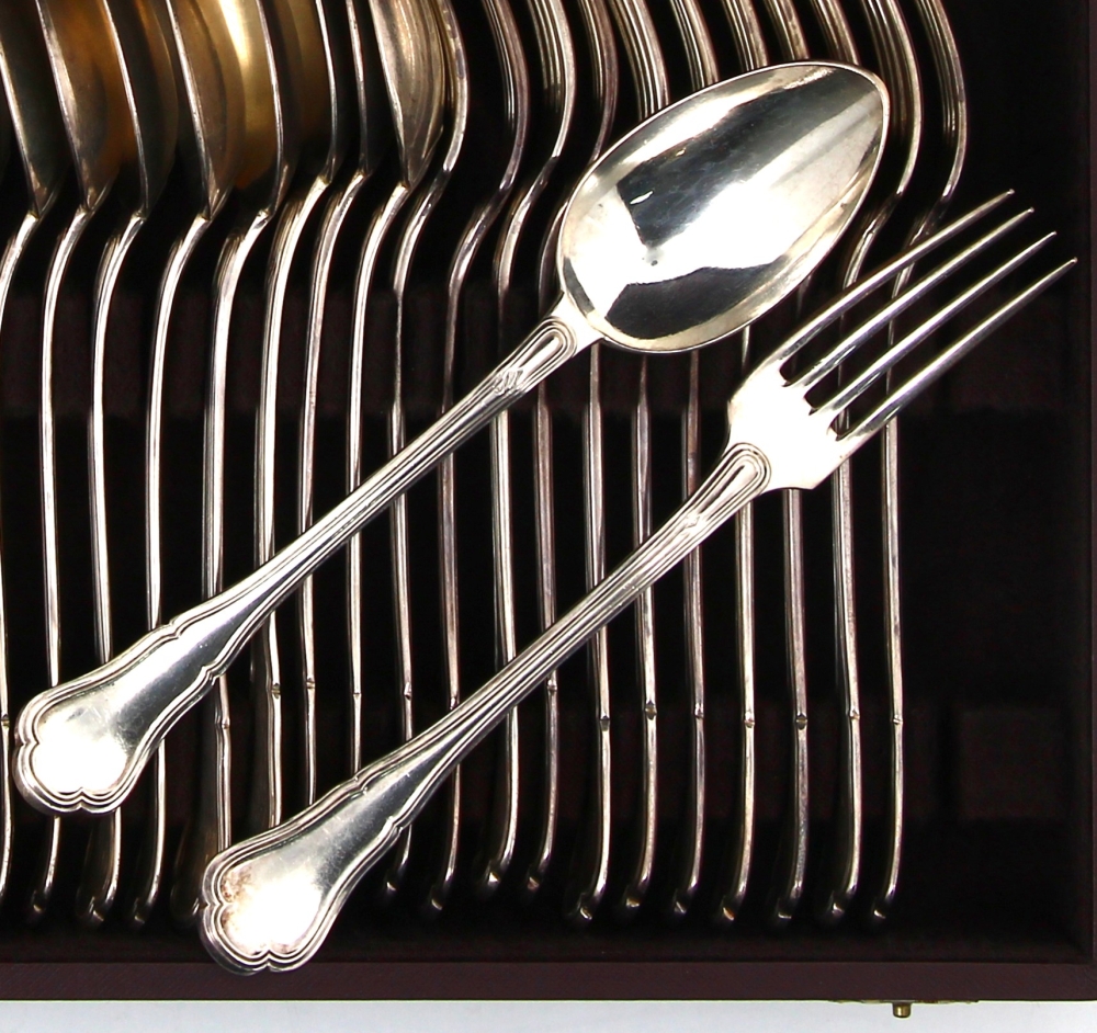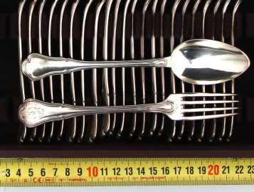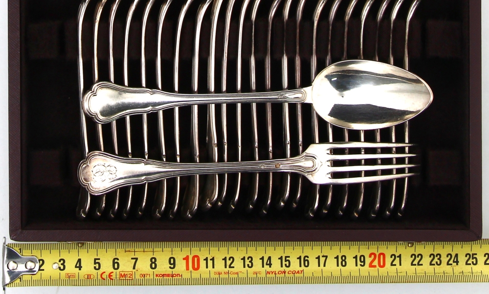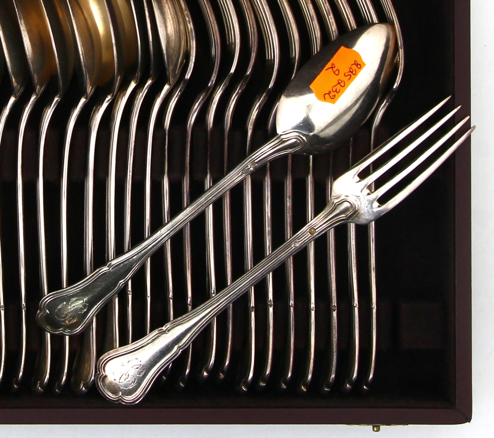 Pierre Francois QUEILLE (Coutelier à Paris à partir de 1808) – 12 couverts à entremet en argent, poinçon minerve, monogramme « EC », poids 1179 grs (écrin brun moderne)