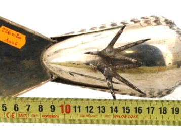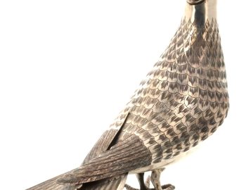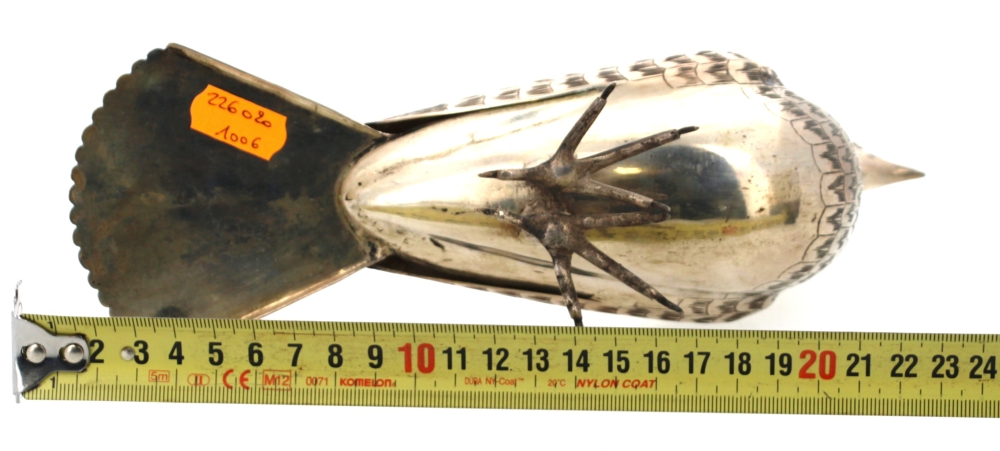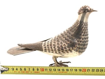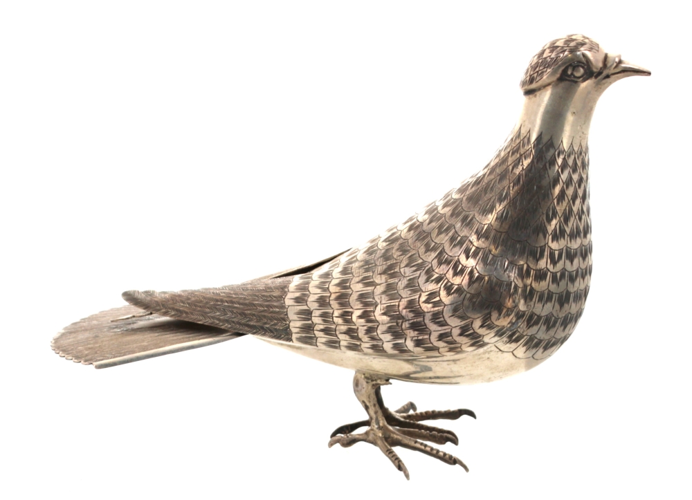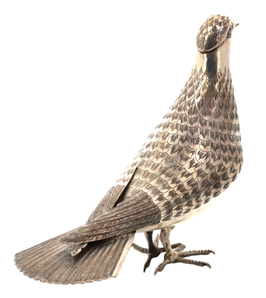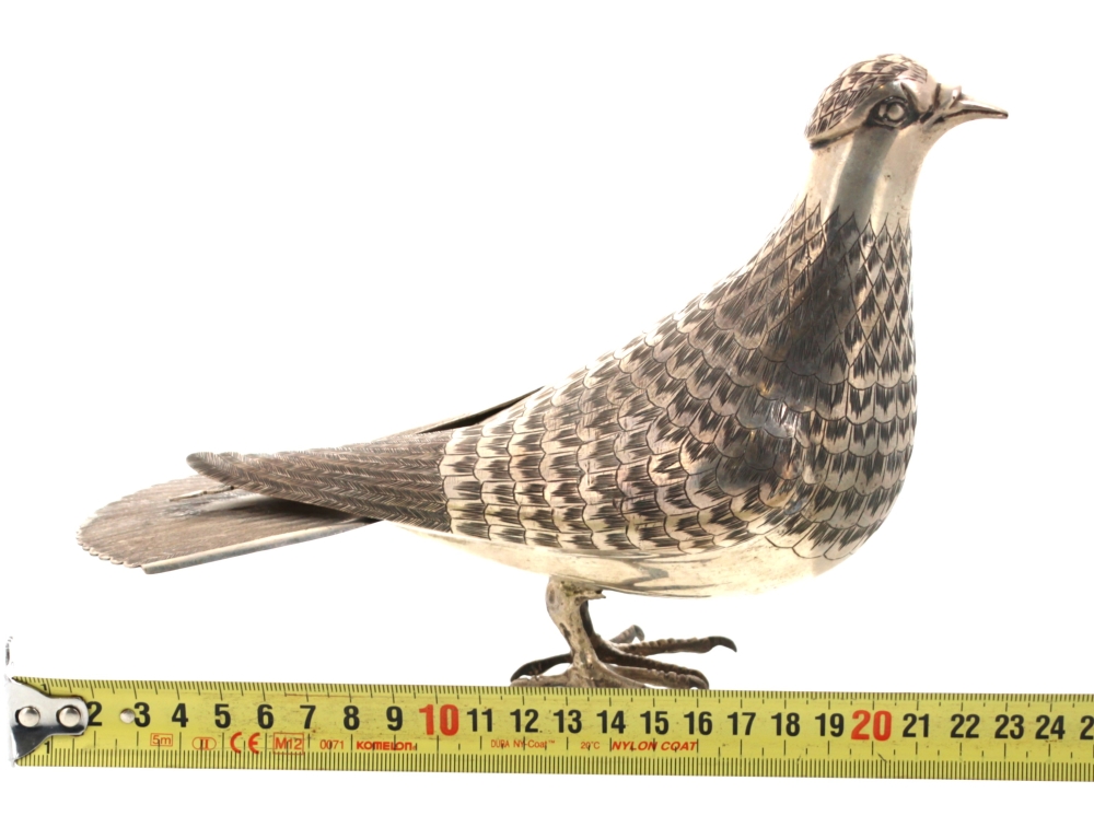 Pigeon, sujet en métal argenté, travail étranger poinçonné. H 16 x L 25,5 cm