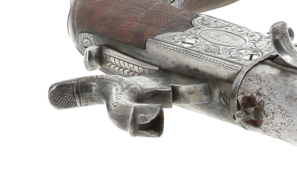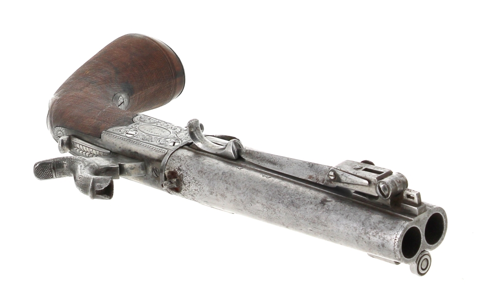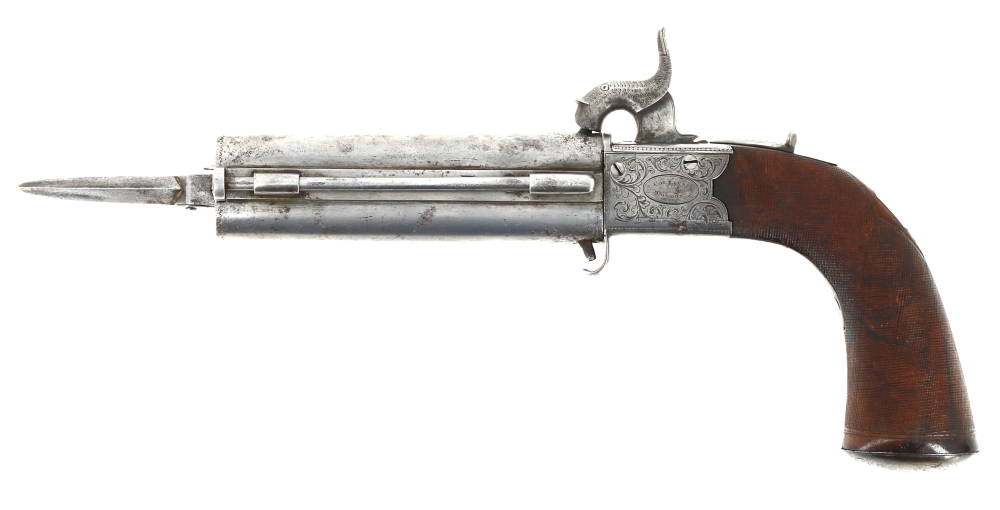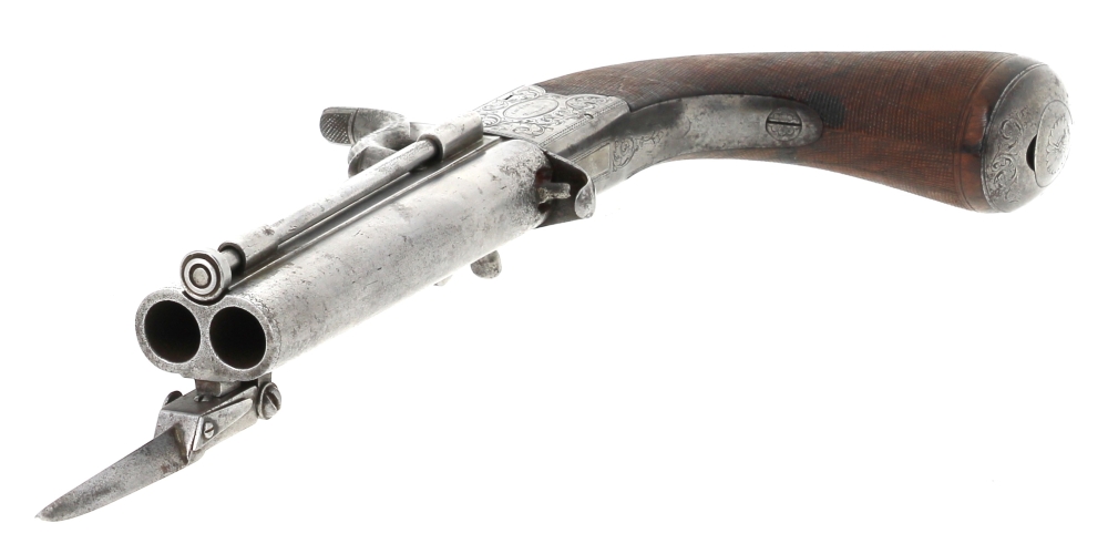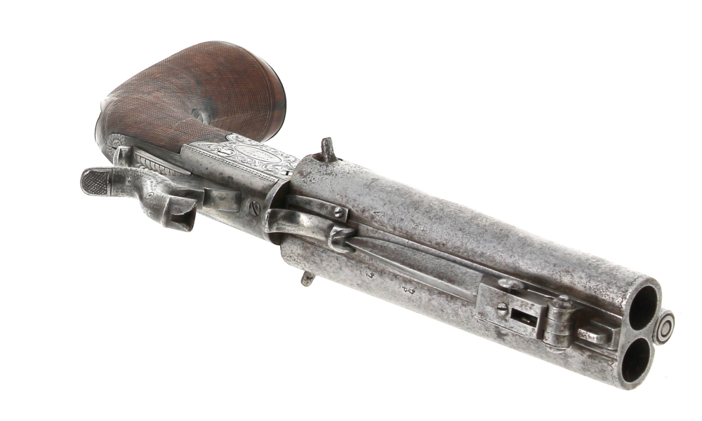 Pistolet à percussion anglais à double canon pivotant, gachette rétractable et baionnette rétractable, L. 24 cm, milieu XIXe (une restauration à la crosse)