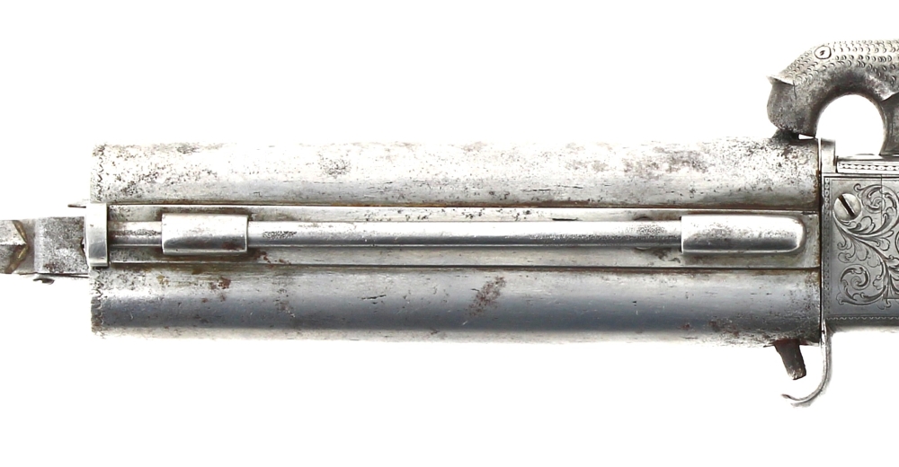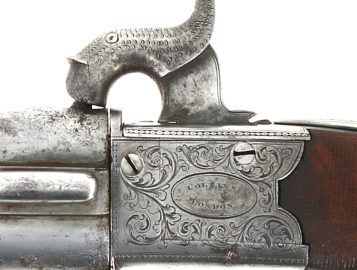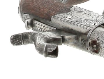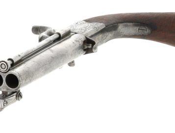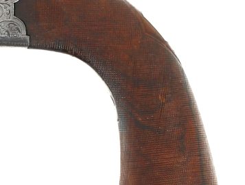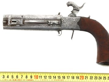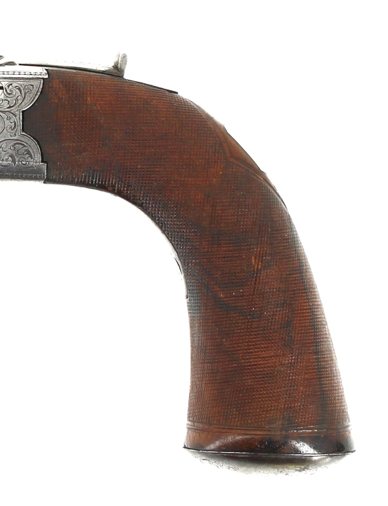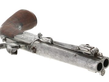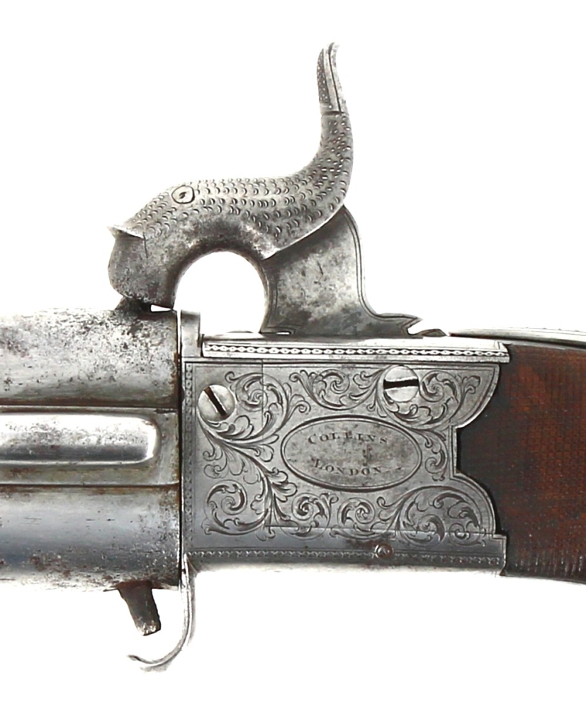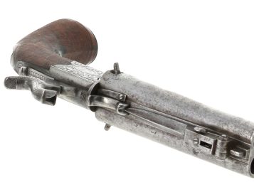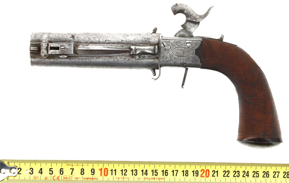 Pistolet à percussion anglais à double canon pivotant, gachette rétractable et baionnette rétractable, L. 24 cm, milieu XIXe (une restauration à la crosse)