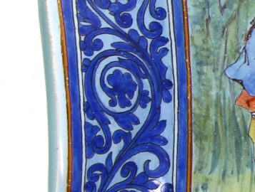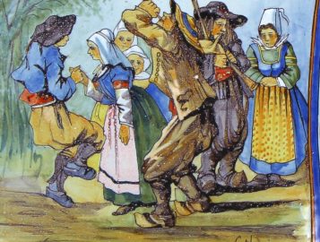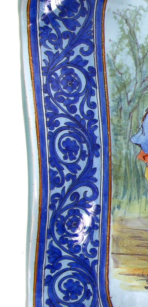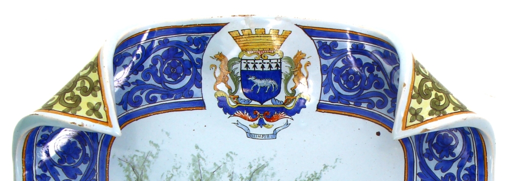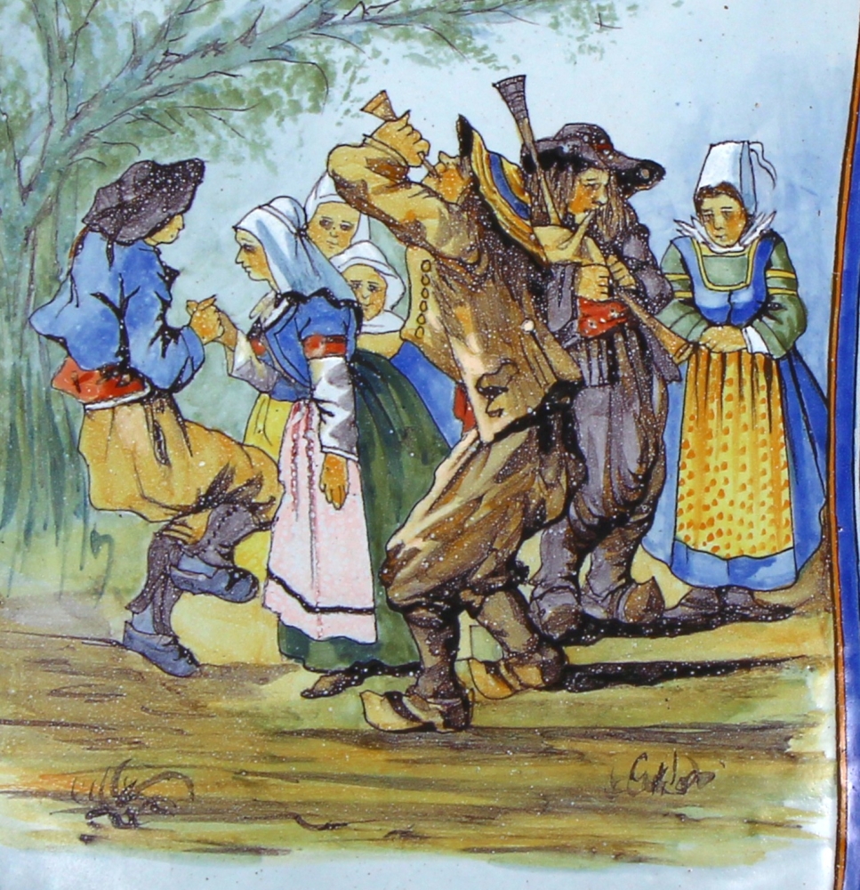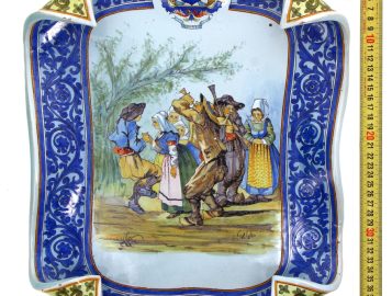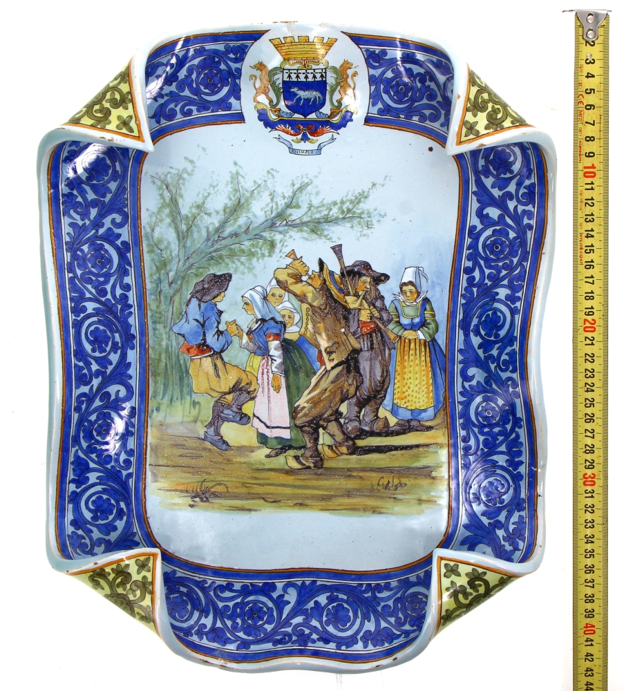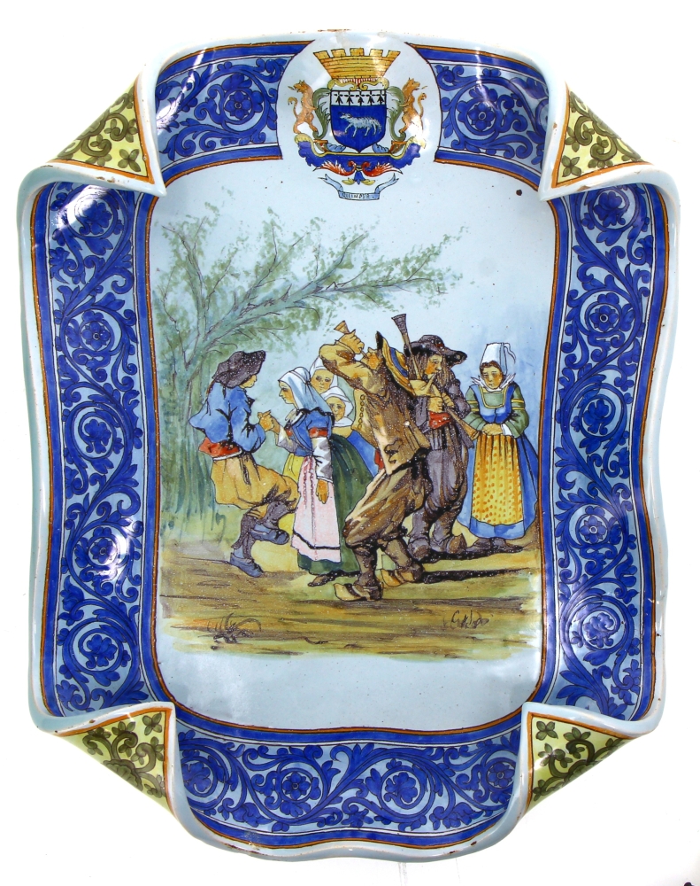 PORQUIER BEAU à Quimper – Plat rectangulaire à bords retournés à décor d’une scène de danse bretonne et sonneurs. Armoiries de Quimper et rinceaux bleux. Signé au revers. 42 x 31 cm environ