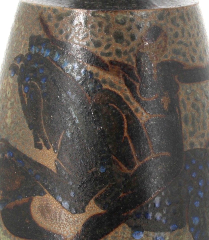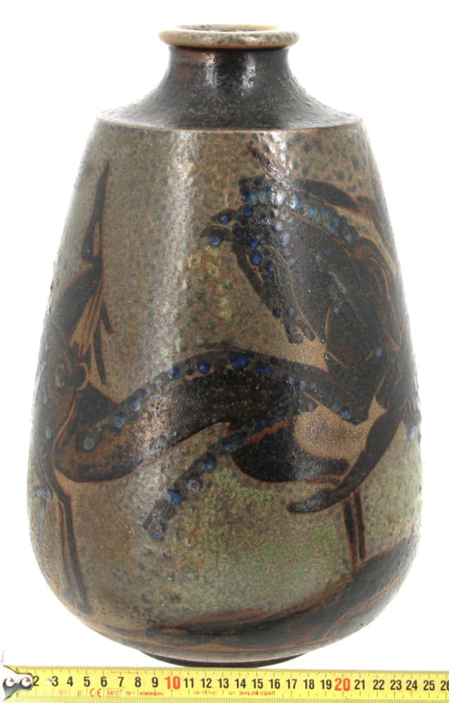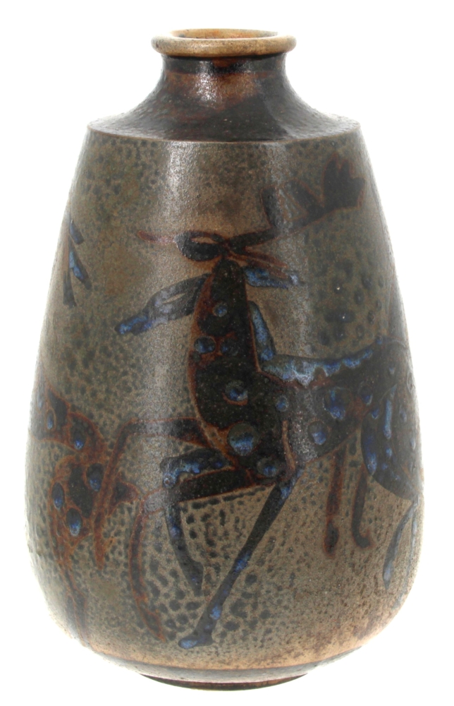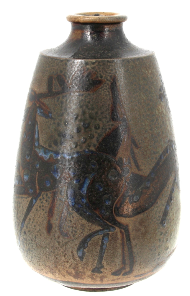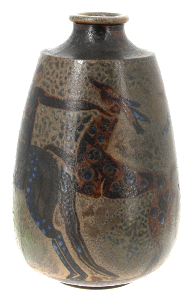 PRIMAVERA (Atelier d’Art du Printemps) & Manufacture de Sainte Radegonde – Vase ovoïde en grès à décor d’une amazone nue à cheval, biche et cerf. Signé en creux « Primavera » et de la hache. H 39 cm