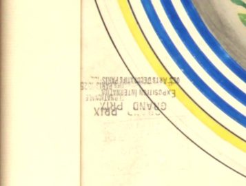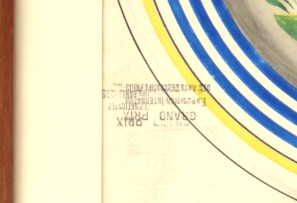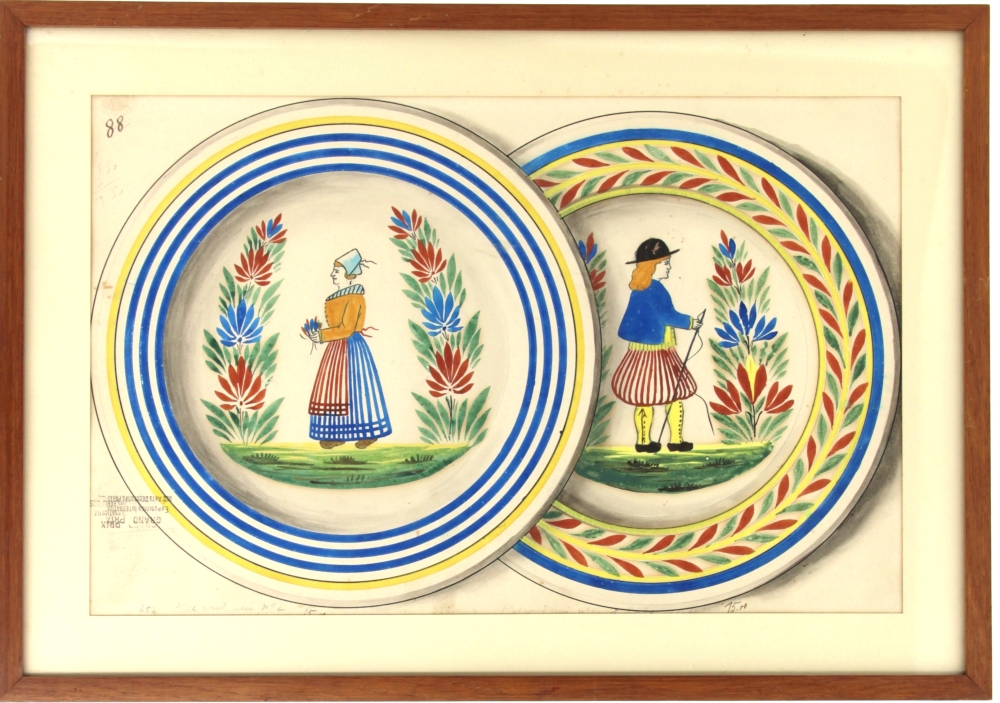 QUIMPER – Modèle d’atelier à la gouache représentant deux assiettes à décor d’une bretonne au bouquet et d’un breton au fouet. Cachet « Grand Prix Exposition Internationale des Arts Décoratifs 1925 ». 30 x 47 cm